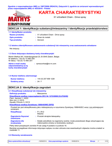 Zgodnie z rozporządzeniem (WE) nr 1907/2006 (REACH), Załącznik II, zgodnie ze zmianami wprowadzonymi przez rozporządzenie (WE) nr 453/2010 - Polska KARTA CHARAKTERYSTYKI X1 eXcellent Chain - Drive spray SEKCJA 1: Identyfikacja substancji/mieszaniny i identyfikacja przedsiębiorstwa 1.1 Identyfikator produktu Nazwa produktu : X1 eXcellent Chain - Drive spray Opis produktu : Smar do metali. Typ produktu : Aerozol. 1.2 Istotne zidentyfikowane zastosowania substancji lub mieszaniny oraz zastosowania odradzane Nie dotyczy. 1.3 Dane dotyczące dostawcy karty charakterystyki Martin Mathys NV, Kolenbergstraat 23, B-3545 Zelem, Belgia Nr telefonu: +32 (0) 13 460 200 Nr faksu: +32 (0) 13 460 201 Adres e-mail osoby odpowiedzialnej za tą kartę charakterystyki : [email protected] 1.4 Numer telefonu alarmowego Numer telefonu Godziny pracy : +44 (0) 207 858 1228 : 24 / 7 SEKCJA 2: Identyfikacja zagrożeń 2.1 Klasyfikacja substancji lub mieszaniny Definicja produktu : Mieszanina Klasyfikacja według rozporządzenia (EC) Nr 1272/2008 [CLP/GHS] Flam. Aerosol 1, H222 Skin Irrit. 2, H315 Aquatic Chronic 3, H412 Klasyfikacja według Dyrektywy 1999/45/WE [DPD] Produkt ten jest sklasyfikowany jako niebezpieczny w rozumieniu Dyrektywy 1999/45/EC wraz z jej późniejszymi zmianami. Klasyfikacja : F+; R12 R52/53 Zagrożenia fizyczne/ : Produkt skrajnie łatwopalny. chemiczne Zagrożenia dla środowiska : Działa szkodliwie na organizmy wodne; może powodować długo utrzymujące się niekorzystne zmiany w środowisku wodnym. Pełny tekst powyższych zwrotów R lub uwag H podano w punkcie 16. Bardziej szczegółowe informacje dotyczące wpływu na stan zdrowia oraz ewentualnych objawów można znaleźć w rozdziale 11. 2.2 Elementy oznakowania Data wydania/Data aktualizacji : 19/09/2014. Data poprzedniego wydania : 19/09/2014. Wersja :1 1/15 Spełnia wymagania przepisów EC 1907/2006 (REACH), Załącznik II - Polska X1 eXcellent Chain - Drive spray SEKCJA 2: Identyfikacja zagrożeń Piktogramy zagrożeń : Hasło ostrzegawcze : Niebezpieczeństwo Zwroty wskazujące rodzaj zagrożenia : Skrajnie łatwopalny aerozol. Działa drażniąco na skórę. Działa szkodliwie na organizmy wodne, powodując długotrwałe skutki. Zwroty wskazujące środki ostrożności Ogólne Reagowanie : Przed użyciem przeczytać etykietę. W razie konieczności zasięgnięcia porady lekarza należy pokazać pojemnik lub etykietę. : Nie rozpylać nad otwartym ogniem lub innym źródłem zapłonu. Nosić rękawice ochronne okulary ochronne: rękawice: kauczuk naturalny (lateks) lub kauczuk nitrylowy , ochronne okulary z bocznymi osłonami. Unikać uwolnienia do środowiska. : W PRZYPADKU KONTAKTU ZE SKÓRĄ: Umyć dużą ilością wody z mydłem. Przechowywanie : Nie dotyczy. Usuwanie : Zawartość pojemnika jak i pojemnik utylizować zgodnie z lokalnymi, regionalnymi, narodowymi oraz międzynarodowymi przepisami. Zapobieganie Uzupełniające elementy etykiety Ograniczenia dotyczące produkcji, wprowadzania do obrotu i stosowania niektórych niebezpiecznych substancji, preparatów i wyrobów : Pojemnik pod ciśnieniem: może pęknąć w przypadku ogrzania. Chronić przed źródłami ciepła, urządzeniami iskrzącymi, otwartym ogniem i gorącymi powierzchniami. Nie palić. Pojemnik pod ciśnieniem. Nie przekłuwać ani nie spalać, nawet po zużyciu. Chronić przed światłem słonecznym. Nie wystawiać na działanie temperatury przekraczającej 50 ºC. Chronić przed dziećmi. : Nie dotyczy. Specjalne wymagania dotyczące pakowania Pojemniki powinny być wyposażone w zamknięcia uniemożliwiające otworzenie ich przez dzieci : Nie dotyczy. Dotykowe ostrzeżenia przed niebezpieczeństwem : Nie dotyczy. 2.3 Inne zagrożenia Inne zagrożenia nie odzwierciedlone w klasyfikacji Data wydania/Data aktualizacji : Nie znane. : 19/09/2014. Data poprzedniego wydania : 19/09/2014. Wersja :1 2/15 Spełnia wymagania przepisów EC 1907/2006 (REACH), Załącznik II - Polska X1 eXcellent Chain - Drive spray SEKCJA 3: Skład/informacja o składnikach Substancja/Preparat : Mieszanina Klasyfikacja Nazwa produktu/ składnika olej parafinowy węglowodory, isoalkanes, C7-C9 Identyfikatory REACH #: 01-2119487078-27 WE: 232-455-8 CAS: 8042-47-5 REACH #: 01-2119471305-42 WE: 292-458-5 CAS: 90622-56-3 % 67/548/EWG Rozporządzenie (WE) Nr 1272/2008 [CLP] Typ 35 <50 Nie sklasyfikowany. Nie sklasyfikowany. [2] 10 <15 F; R11 Xn; R65 Xi; R38 R67 N; R51/53 Flam. Liq. 2, H225 Skin Irrit. 2, H315 STOT SE 3, H336 Asp. Tox. 1, H304 Aquatic Chronic 2, H411 [1] [2] Patrz Sekcja 16 pełny tekst zadeklarowanych wyżej Fraz-R. Pełny tekst powyższych uwag H podano w punkcie 16. Nie zawiera składników, które w świetle obecnej wiedzy dostawcy oraz w danym stężeniu są klasyfikowane jako niebezpieczne dla zdrowia lub otoczenia, klasyfikowane są jako PBT lub vPvB, lub którym przypisano ograniczenia co do występowania w środowisku pracy, nie ma więc wymogu wymieniania ich w niniejszym ustępie. Typ [1] Substancja sklasyfikowana jako szkodliwa dla zdrowia lub środowiska [2] Substancja, dla której wyznaczono dopuszczalne stężenie w środowisku pracy [3] Substancja spełnia kryteria dla jej zaklasyfikowania jako PBT zgodnie z Rozporządzeniem (WE) Nr 1907/2006, Aneks XIII [4] Substancja spełnia kryteria dla jej zaklasyfikowania jako vPvB zgodnie z Rozporządzeniem (WE) Nr 1907/2006, Aneks XIII [5] Substancja wywołująca równorzędne obawy Najwyższe dopuszczalne stężenia, jeśli są dostępne, wymienione są wymienione w części 8. SEKCJA 4: Środki pierwszej pomocy 4.1 Opis środków pierwszej pomocy Ogólne Kontakt z okiem Wdychanie Kontakt ze skórą Spożycie Ochrona osób udzielających pierwszej pomocy : W razie jakichkolwiek wątpliwości, lub jeżeli objawy nie ustępują, należy zasięgnąć pomocy lekarskiej. Nigdy nie podawać niczego doustnie osobie nieprzytomnej. W razie utraty przytomności, należy ułożyć w pozycji stabilizowanej (położe