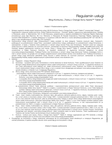 Regulamin usługi Blog Konkursu „Testuj z Orange Sony Xperia™ Tablet Z” 1. Niniejszy regulamin określa zasady świadczenia usługi „BLOG Konkursu Testuj z Orange Sony Xperia™ Tablet Z” (zwanej dalej ”Usługą”). Organizatorem Usługi jest spółka pod firmą „Polska Telefonia Komórkowa – Centertel” Spółka z ograniczoną odpowiedzialnością z siedzibą w Warszawie, adres: ul. Skierniewicka 10A, 01-230 Warszawa, zarejestrowana w rejestrze przedsiębiorców Krajowego Rejestru Sądowego prowadzonym przez Sąd Rejonowy dla m.st. Warszawy w Warszawie XII Wydział Gospodarczy Krajowego Rejestru Sądowego pod numerem KRS 0000006107, o kapitale zakładowym w wysokości 2.690.501.964,00 zł, numer identyfikacji podatkowej NIP: 527-020-68-72, adres e-mail: [email protected] (zwana dalej „PTK Centertel”). 2. Użytkowników Usługi (zwanych dalej „Użytkownikami”) należy podzielić na dwie kategorie: Testerów (zwanych dalej „Testerami”), publikujących za pośrednictwem Usługi Posty i pozostałych użytkowników Usługi, publikujących za pośrednictwem Usługi Komentarze, z zastrzeżeniem, iż każdy z Testerów może publikować w ramach Usługi również Posty oraz Komentarze. Testerem może być wyłącznie osoba fizyczna o pełnej zdolności do czynności prawnych, zamieszkała na terytorium Rzeczpospolitej Polskiej, zakwalifikowana przez PTK Centertel, będącą organizatorem konkursu pod nazwą „Testuj z Orange Sony Xperia™ Tablet Z” (zwanego dalej „Konkursem”), do uczestnictwa w Etapie Testowym Konkursu, na zasadach określonych w regulaminie Konkursu dostępnym na stronie www.testuj.orange.pl/xperiatabletz. Publikacji Postów oraz Komentarzy w ramach Usługi mogą dokonywać Testerzy posiadający konto email w ramach serwisu ww.google.com lub będący zarejestrowanymi użytkownikami serwisu www.facebook.com. Publikacji Komentarzy w ramach Usługi mogą dokonywać pełnoletnie osoby fizyczne o pełnej zdolności do czynności prawnych, zamieszkałe na terytorium Rzeczpospolitej Polskiej, będące zarejestrowanymi użytkownikami serwisu www.facebook.com. 3. Definicje: a) Regulamin - niniejszy Regulamin Usługi b) Komentarz - wyrażenie opinii przez Komentatora w formie tekstowej na temat Konkursu, Treści opublikowanych przez Testerów na Stronach Usługi dedykowanych poszczególnym seriom zadań konkursowych, o których mowa w § III ust. 11 regulaminu Konkursu (w tym Treści stanowiących wynik realizacji ww. zadań konkursowych wykonywanych przez Testerów), lub Postów lub Komentarzy innych Użytkowników Usługi w ramach Stron Usługi, w tym w ramach forum dostępnego pod adresem www.testuj.orange.pl/forum, w sposób określony w Artykule 2 ust. 5 niniejszego Regulaminu; c) Strony Usługi- strony utworzone przez PTK Centertel, dedykowane: - poszczególnym seriom zadań konkursowych wskazanych w § III ust. 11 regulaminu Konkursu, dostępne pod adresem: w przypadku Strony Usługi dedykowanej pierwszej serii zadań konkursowych, o których mowa w § III ust. 11 regulaminu Konkursu: www.testuj.orange.pl/xperiatabletz/1seria w przypadku Strony Usługi dedykowanej drugiej serii zadań konkursowych, o których mowa w § III ust. 11 regulaminu Konkursu: www.testuj.orange.pl/xperiatabletz/2seria w przypadku Strony Usługi dedykowanej trzeciej serii zadań konkursowych, o których mowa w § III ust. 11 regulaminu Konkursu: www.testuj.orange.pl/xperiatabletz/3seria za pośrednictwem których Tester dokonuje publikacji i rozpowszechniania zamieszczonych przez siebie Treści dotyczących testowanego tabletu Sony Xperia™ Tablet Z w związku z uczestnictwem w Etapie Testowym Konkursu, w tym Treści będących wynikiem realizacji zadań konkursowych danej serii, o których mowa w § III ust. 11 regulaminu Konkursu; Za pośrednictwem ww. Stron Usługi możliwa będzie również publikacja Komentarzy; - forum wymiany Postów i Komentarzy, dostępnemu pod adresem www.testuj.orange.pl/forum. d) Treści - treści i obiekty multimedialne (np. tekstowe, dane, pliki graficzne, elementy graficzne strony, zdjęcia, materiały audio i wideo, itp.), w tym utwory w rozumieniu ustawy z dnia 4 lutego 1994 r. o prawie autorskim i prawach pokrewnych (Dz.U. 1994, nr 24, poz. 83 ze zm.) oraz wizerunki osób fizycznych, jakie są zamieszczane przez Testera w ramach Stron Usługi dedykowanych poszczególnym seriom zadań konkursowych, dotyczące testowanego tabletu Sony Xperia™ Tablet Z, w tym Treści będące wynikiem realizacji zadań konkursowych poszczególnych serii, o których mowa w § III ust. 11 regulaminu Konkursu, w celu rozpowszechniania ich za pośrednictwem ww. Stron, w związku z uczestnictwem w Etapie Testowym Konkursu. e) Posty - treści i obiekty multimedialne (np. tekstowe, dane, pliki graficzne, elementy graficzne strony, zdjęcia, materiały audio i wideo, itp.), w tym utwory w rozumieniu ustawy z dnia 4 lutego 1994 r. o prawie autorskim i prawach pokrewnych (Dz.U. 1994, nr 24, poz. 83 ze zm.) oraz wizerunki osób fizycznych, jakie są zamieszczane przez Użytkowników w ramach forum wymiany Postów i Komentarzy dostępnego pod adresem www.testuj.orange.pl/forum, celem wyrażenia opinii na temat Konkursu, Treści opublikowanych przez Testerów, jak również Postów lub Komentarzy innych Użytkowników Usługi; f) Konkurs - konkurs pod nazwą „Testuj z Orange Sony Xperia™” Tablet Z”, którego organizatorem jest PTK Centertel, a którego regulamin dostępny jest na stronie www pod adresem www.testuj.orange.pl/xperiatabletz 4. Przystępując do korzystania z Usługi, Użytkownik zobowiązuje się do przestrzegania zasad określonych w niniejszym Regulaminie, jak również potwierdza, iż spełnia wszystkie warunki, które uprawniają go do korzystania z Usługi. Artykuł 2 Zasady użytkowania strona 1 z 5 Regulamin usługi Blog Konkursu „Testuj z Orange Sony Xperia™ Z” OGSM/PDF05/0613 Artykuł 1 Postanowienia ogólne 2. 3. 4. 5. Usługa