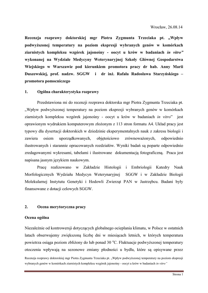 Wrocław, 26.08.14 Recenzja rozprawy doktorskiej mgr Piotra Zygmunta Trzeciaka pt. „Wpływ podwyższonej temperatury na poziom ekspresji wybranych genów w komórkach ziarnistych kompleksu wzgórek jajonośny - oocyt u krów w badaniach in vitro” wykonanej na Wydziale Medycyny Weterynaryjnej Szkoły Głównej Gospodarstwa Wiejskiego w Warszawie pod kierunkiem promotora pracy dr hab. Anny Marii Duszewskiej, prof. nadzw. SGGW dr inż. Rafała Radosława Starzyńskiego – i promotora pomocniczego 1. Ogólna charakterystyka rozprawy Przedstawiona mi do recenzji rozprawa doktorska mgr Piotra Zygmunta Trzeciaka pt. „Wpływ podwyższonej temperatury na poziom ekspresji wybranych genów w komórkach ziarnistych kompleksu wzgórek jajonośny - oocyt u krów w badaniach in vitro” jest oprawionym wydrukiem komputerowym złożonym z 113 stron formatu A4. Układ pracy jest typowy dla dysertacji doktorskich w dziedzinie eksperymentalnych nauk z zakresu biologii i zawiera osiem uporządkowanych, objętościowo zrównoważonych, odpowiednio ilustrowanych i starannie opracowanych rozdziałów. Wyniki badań są poparte odpowiednio zredagowanymi wykresami, tabelami i ilustrowane dokumentacją fotograficzną. Praca jest napisana jasnym językiem naukowym. Pracę realizowano w Zakładzie Histologii Morfologicznych Wydziału Medycyn Weterynaryjnej i Embriologii Katedry Nauk SGGW i w Zakładzie Biologii Molekularnej Instytutu Genetyki i Hodowli Zwierząt PAN w Jastrzębcu. Badani były finansowane z dotacji celowych SGGW. 2. Ocena merytoryczna pracy Ocena ogólna Niezależnie od kontrowersji dotyczących globalnego ocieplania klimatu, w Polsce w ostatnich latach obserwujemy zwiększoną liczbę dni w miesiącach letnich, w których temperatura powietrza osiąga poziom zbliżony do lub ponad 30 oC. Fluktuacje podwyższonej temperatury otoczenia wpływają na sezonowe zmiany płodności u bydła, które są opisywane przez Recenzja rozprawy doktorskiej mgr Piotra Zygmunta Trzeciaka pt. „Wpływ podwyższonej temperatury na poziom ekspresji wybranych genów w komórkach ziarnistych kompleksu wzgórek jajonośny - oocyt u krów w badaniach in vitro” Strona 1 praktykujących lekarzy weterynarii. Stanowią one istotny problem medyczny i są przyczyną wymiernych strat gospodarczych. Jedną z przyczyn takiego stanu jest wrażliwość komórek rozrodczych i zarodków we wczesnych etapach rozwoju na stres termiczny rozumiany jako kompleks zmian adaptacyjnych, które mają prowadzić do niwelacji ewentualnych skutków zaburzonej homeostazy termicznej. Istotnie, wykazano, że skutkiem stresu cieplnego jest zaburzony proces dojrzewania oocytów, spowodowany zaburzeniami dojrzewania cytoplazmatycznego, jądrowego, organizacji cytoszkieletu i egzekucją apoptozy co prowadzi do ograniczonej kompetencji biologicznej tych komórek niezbędnej do utworzenia prawidłowego zarodka. Jednak należy mieć na uwadze, ze zmiany adaptacyjne oocytów są ograniczone, ponieważ oocyt jest komórką transkrypcyjnie nieaktywną. W ocenianej rozprawie doktorskiej została sformułowana oryginalna hipoteza badawcza, która zakłada, że u krów negatywny wpływ stresu cieplnego na przedimplantacyjny rozwój zarodków jest uwarunkowany zmienioną ekspresją kluczowych genów sterujących procesem owulacji w transkrypcyjnie aktywnych komórkach ziarnistych wzgórka jajonośnego a nie bezpośrednim oddziaływaniem na oocyt. Komórki ziarniste są komórkami opiekuńczymi dla oocytów. Dlatego przyjęte założenie, że to właśnie komórka ziarnista w odpowiedzi na stres cieplny będzie spełniać rolę ochronną wobec oocytu jest logicznym i trafnym uzasadnieniem podjętych badań. Na szczególna uwagę również zasługuje dobór genów, których ekspresja w komórkach ziarnistych podlegała ocenie: receptor hormonu folikulotropowego, który po związaniu swojego liganda (FSH) aktywuje ścieżkę sygnalizacyjną prowadzącą do wzrostu aktywności cyklazy adenylowej, produkcji cAMP i utrzymywania odpowiedniego poziomu cAMP w oocycie; Wewnątrzkomórkowe stężenie cAMP decyduje o zahamowaniu lub wznowieniu podziału mejotycznego przez tę komórkę. Z kolei oocyt aktywnie wpływa na aktywację białek SMAD i kontrolę ekspresji genów kontrolujących proces owulacji i dyspersji komórek ziarnistych, miedzy innymi genu białka TSG-6, którego poziom transkrypcji i translacji był oceniany w tej pracy. Ocenie również podlegała ekspresja białka HSP-70, kluczowego w ochronie komórek przed stresem cieplnym. Recenzja rozprawy doktorskiej mgr Piotra Zygmunta Trzeciaka pt. „Wpływ podwyższonej temperatury na poziom ekspresji wybranych genów w komórkach ziarnistych kompleksu wzgórek jajonośny - oocyt u krów w badaniach in vitro” Strona 2 Najważniejszym osiągnieciem pracy jest wykazanie, że komórki ziarniste wzgórka jajonośnego odpowiadają na stres cieplny poprzez regulację ekspresji genów kluczowych dla procesów dojrzewania oocytów i odpowiedzi na stres termiczny. Odpowiedz ta jest zależna od czasu działania stresorów jak wykazano w porównaniu z badaniami innych autorów. Co ciekawe, wyniki pracy sugerują intensywną ochronę oocytu poprzez prawdopodobny parakrynny transport HSP-70, jednak ta ochrona nie zachowuje kompetencji oocytu umożliwiającej rozwój zarodków do stadium blastocysty. Obniżenie poziomu FSHR i podwyższenie poziomu TSG-6 w odpowiedzi na stres może sugerować przyspieszony proces odłączania komórek ziarnistych od oocytu i kształtowania struktur macierzy pozakomórkowej, co jest silną przesłanką do dalszych badań nad funkcjonalnym powiązaniami pomiędzy tymi dwoma rodzajami komórek w warunkach stresu a jednocześnie jak sugeruje Autor pracy białko TSG-6 i FSHR mogą służyć jako molekularne markery biologicznej kompetencji oocytów. Ten ostatni aspekt wynikający z podjętych badań może otwierać nową ścieżkę nieinwazyjnej, pośredniej oceny oocytów niezbędnej w tr