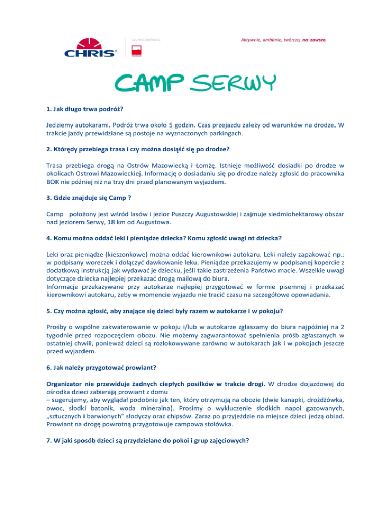 1. Jak długo trwa podróż? Jedziemy autokarami. Podróż trwa około 5 godzin. Czas przejazdu zależy od warunków na drodze. W trakcie jazdy przewidziane są postoje na wyznaczonych parkingach. 2. Którędy przebiega trasa i czy można dosiąść się po drodze? Trasa przebiega drogą na Ostrów Mazowiecką i Łomżę. Istnieje możliwość dosiadki po drodze w okolicach Ostrowi Mazowieckiej. Informację o dosiadaniu się po drodze należy zgłosić do pracownika BOK nie później niż na trzy dni przed planowanym wyjazdem. 3. Gdzie znajduje się Camp ? Camp położony jest wśród lasów i jezior Puszczy Augustowskiej i zajmuje siedmiohektarowy obszar nad jeziorem Serwy, 18 km od Augustowa. 4. Komu można oddać leki i pieniądze dziecka? Komu zgłosić uwagi nt dziecka? Leki oraz pieniądze (kieszonkowe) można oddać kierownikowi autokaru. Leki należy zapakować np.: w podpisany woreczek i dołączyć dawkowanie leku. Pieniądze przekazujemy w podpisanej kopercie z dodatkową instrukcją jak wydawać je dziecku, jeśli takie zastrzeżenia Państwo macie. Wszelkie uwagi dotyczące dziecka najlepiej przekazać drogą mailową do biura. Informacje przekazywane przy autokarze najlepiej przygotować w formie pisemnej i przekazać kierownikowi autokaru, żeby w momencie wyjazdu nie tracić czasu na szczegółowe opowiadania. 5. Czy można zgłosić, aby znające się dzieci były razem w autokarze i w pokoju? Prośby o wspólne zakwaterowanie w pokoju i/lub w autokarze zgłaszamy do biura najpóźniej na 2 tygodnie przed rozpoczęciem obozu. Nie możemy zagwarantować spełnienia próśb zgłaszanych w ostatniej chwili, ponieważ dzieci są rozlokowywane zarówno w autokarach jak i w pokojach jeszcze przed wyjazdem. 6. Jak należy przygotować prowiant? Organizator nie przewiduje żadnych ciepłych posiłków w trakcie drogi. W drodze dojazdowej do ośrodka dzieci zabierają prowiant z domu – sugerujemy, aby wyglądał podobnie jak ten, który otrzymują na obozie (dwie kanapki, drożdżówka, owoc, słodki batonik, woda mineralna). Prosimy o wykluczenie słodkich napoi gazowanych, „sztucznych i barwionych” słodyczy oraz chipsów. Zaraz po przyjeździe na miejsce dzieci jedzą obiad. Prowiant na drogę powrotną przygotowuje campowa stołówka. 7. W jaki sposób dzieci są przydzielane do pokoi i grup zajęciowych? Dzieci są przydzielane do pokoi i grup zajęciowych przez kierownika danej grupy wiekowej. Kierownik bierze pod uwagę płeć, wiek oraz w miarę możliwości sugestie rodziców. Uwagi dotyczące zakwaterowania lub grup zajęciowych należy zgłosić do pracownika biura obsługi klienta nie później niż na dwa tygodnie przed rozpoczęciem obozu. Uwagi przesłane w późniejszym terminie są zwykle trudne do uwzględnienia. Grupy zajęciowe mogą się różnić od grup zakwaterowania: w jednym pokoju mogą mieszkać osoby należące do różnych grup zajęciowych. Co za tym idzie (ale też rzadko się zdarza), inny wychowawca chodzi z dziećmi na zajęcia a inny opiekuje się pokojem. Jeśli nawet dojdzie do takiej sytuacji to, są to wychowawcy z jednej grupy wiekowej dobrze znani dzieciom. 8. Na jaką pomoc mogą liczyć dzieci i młodzież? Najprościej mówiąc na każdą. Najmłodsze dzieci mają na Campie przeróżne troski. Niektóre są drobne, jak samodzielne ubranie czy toaleta wieczorna, inne znacznie poważniejsze, jak kłopoty z zaśnięciem, tęsknota za rodzicami czy nieporozumienia z kolegami i koleżankami. Wychowawcy pracujący na Campie posiadają takie kompetencje, by radzić sobie ze wszystkimi takimi sytuacjami: doradzają oni w doborze odpowiedniego ubrania, uczą nastawiać odpowiednią temperaturę wody w kranie, a dziewczynkom pomagają myć i czesać włosy, jeśli jest taka potrzeba. Podstawą życia campowego jest solidna integracja na początku obozu (przeprowadzana w grupie za pomocą gier i zabaw nastawionych na poznanie i polubienie się), a także wyjątkowa atmosfera podczas trwania całego obozu, co zapobiega kłótniom i nieporozumieniom między dziećmi. Kadra ma także wyjątkowe sposoby na tęsknotę najmłodszych campowiczów. Są to przede wszystkim: wieczorne czytanie, przy którym dużo maluchów usypia (a to ogranicza wieczorne rozmowy telefoniczne, przy których najmłodsi najczęściej się rozklejają), specjalne maskotki „leczące” tęsknotę, badziki (znaczki) dla „lodołamaczy” przełamujących swoje lęki i inne formy. 9.Jak wygląda standardowy dzień zajęć na Campie? Między obozami występują różnice w planie dnia wynikające z programu. Poniższe uogólnienie nie uwzględnia wszystkich szczegółów oraz różnic. Pobudka – godzina uzależniona od obozu na którym przebywa dziecko (między 7:20 a 8:00 – wyjątek stanowi sytuacja w której wstajemy na odznakę pływacką, wtedy wstajemy wcześniej). Następnie jest śniadanie. Między śniadaniem i obiadem są dwa bloki zajęciowe lub jeden długi. Obiad. Między obiadem i kolacją są dwa bloki zajęciowe lub jeden długi. Kolacja. Po kolacji jest jeden blok zajęciowy lub impreza wieczorna. Zdarza się, że po ostatnim bloku mamy jeszcze imprezę wieczorną (typu ognisko, dyskoteka, itp.). Toaleta wieczorna. Dla najmłodszych dzieci czytanie bajek. Cisza nocna. 10. Jak wyglądają i jak długo trwają posiłki? Co w przypadku niejadków? Posiłki trwają około 30 minut. Dzięki szwedzkiemu stołowi zazwyczaj nie ma większych problemów z niejadkami, bo każde dziecko znajduje coś dla siebie. W trudniejszych sytuacjach, z dziećmi podpisywane są kontrakty, które zachęcają do zjedzenia odpowiedniej i pożywnej porcji, by potem móc zjeść np. coś słodkiego. Zazwyczaj jednak nie trzeba uciekać się do takich sposobów, ponieważ aktywność fizyczna dzieci podczas codziennych zajęć sprawia, że same chętnie jedzą. 11. Czy jest możliwość realizacji diety lub przestrzegania zastrzeżeń dietetycznych? Dzieci ze specjalnymi potrzeba