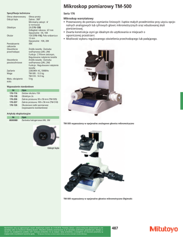 Mikroskop pomiarowy TM-500 Seria 176 Specyfikacja techniczna Obraz obserwowany Odczyt kąta Obiektyw Okular Powiększenie całkowite Oświetlenie przechodzące Oświetlenie powierzchniowe Zasilanie Waga Maks. obciążenie stołu Obraz prosty Zakres : 360° Minimalny odczyt : 6' (z noniusza) 2X (176-138) Odległość robocza : 67 mm Opcjonalne : 5X, 10X 15X (176-116), Pole widzenia ø 13 mm Opcjonalne : 10X, 20X 30X Mikroskop warsztatowy • Przeznaczony do pomiaru wymiarów liniowych i kątów małych przedmiotów przy użyciu opcjonalnych analogowych lub cyfrowych głowic mikrometrycznych oraz wbudowanej skali pierścieniowej. • Zwarta konstrukcja czyni go idealnym do użytkowania w miejscach o ograniczonej przestrzeni. • Możliwość wyboru regulowanego oświetlenia przechodzącego lub padającego. Źródło światła : Żarówka wolframowa (24V, 2W) Funkcje : Z filtrem zielonym, Regulowane natężenie światła Źródło światła : Żarówka wolframowa (24V, 2W) Funkcje : Regulowane natężenie światła 220/240V AC, 50/60Hz TM-505 : 13.5 kg TM-510 : 14.5 kg 5 kg Wyposażenie standardowe Nr 176-116 176-138 176-206 176-207 176-126 Opis Zestaw okularu 15X Obiektyw 2x Zakres przesuwu 50 x 50 mm (TM-505) Zakres przesuwu 100 x 50 mm (TM-510) Okularowe siatki pomiarowe (wyposażenie standardowe) Artykuły eksploatacyjne Nr 383038D Opis Żarówka halogenowa 24V, 2W TM-505 wyposażony w opcjonalne analogowe głowice mikrometryczne Odczyt kąta TM-505 wyposażony w opcjonalne głowice mikrometryczne Digimatic Wymienione ceny są sugerowanymi cenami detalicznymi (ważne do 31.05.2013). Produkty calowe i calowo-metryczne przeznaczone są do sprzedaży tylko na terytorium Wielkiej Brytanii. Wszystkie produkty przeznaczone są do sprzedaży podmiotom gospodarczym, dlatego w cenach nie uwzględniono podatku VAT. Ilustracje produktów nie są wiążące. Opisy produktów, a szczególnie ich kluczowe parametry są wiążące tylko na podstawie wyraźnej zgody. * W sprawie informacji na temat czasów dostaw, prosimy o kontakt z biurem Mitutoyo. 487 Mikroskop pomiarowy TM-500 Seria 176 Wymiary Model Nr Cena € Nr Cena € Uwagi Zakres przejazdu stołu XY (mm) Wymiary powierzchni górnej stołu XY Obszar efektywny stołu XY (mm) Maks. wysokość mierzonego przedmiotu TM-505 176-811CED 4 150,00 176-811CEE 4 150,00 176-811CEE tylko WB TM-510 176-812CED 5 450,00 176-812CEE 5 450,00 176-811CEE tylko WB 50 x 50 mm 100 x 50 mm 152 x 152 mm 240 x 152 mm 96 x 96 mm 154 x 96 mm 115 mm 107 mm TM-505 TM-510 488 Wymienione ceny są sugerowanymi cenami detalicznymi (ważne do 31.05.2013). Produkty calowe i calowo-metryczne przeznaczone są do sprzedaży tylko na terytorium Wielkiej Brytanii. Wszystkie produkty przeznaczone są do sprzedaży podmiotom gospodarczym, dlatego w cenach nie uwzględniono podatku VAT. Ilustracje produktów nie są wiążące. Opisy produktów, a szczególnie ich kluczowe parametry są wiążące tylko na podstawie wyraźnej zgody. * W sprawie informacji na temat czasów dostaw, prosimy o kontakt z biurem Mitutoyo. Mikroskop pomiarowy TM-500 Wyposażenie specjalne Nr 176-115 176-116 176-117 176-139 176-137 152-390 Opis Okular 10x (pole widzenia ø13 mm) Zestaw okularu 15X Okular 20 x (pole widzenia ø10 mm) Obiektyw 5X (W.D : 33 mm, N.A. : 0.10) Obiektyw 10x (W.D : 14 mm, N.A. : 0.14) Głowica mikrometryczna dla osi X 50 mm 152-389 Głowica mikrometryczna dla osi Y 50 mm 176-204 Przystawka dla czujnika zegarowego do pomiaru wysokości 176-106 Stolik obrotowy 66 mm 176-105 Uchwyt kłowy przechylny 172-197 Uchwyt kłowy przechylny 172-378 Pryzma z klamrą ( Przedmiot: maks, ø 25 mm) 176-107 Uchwyt z zaciskiem 990561 Docisk przedmiotu (2szt./zestaw) 176-366CED Pierścień oświetleniowy światłowodowy 164-163 Cyfrowe głowice mikrometryczne 0-50 mm 959149 Kabel Digimatic z przyciskiem danych (1 m) 959150 Kabel Digimatic z przyciskiem danych (2 m) 06ADV380C Kabel USB Input Tool Direct z przyciskiem danych (2 m) 377-085D Pierścień oświetleniowy LED 02AZD790C Kabel danych U-WAVE z przyciskiem danych 377-090-1DD Fluorescencyjny pierścień oświetleniowy 12AAE044 Adapter pierścieniowy dla pierścienia oświetlającego (dla TM-500) 176-203 Oświetlenie padające z dwoma żarówkami 176-344CED Oświetlenie światłowodowe dwudrożne 611635-031 Stalowa metryczna płytka wzorcowa 25 mm klasy 1 611675-031 Stalowa metryczna płytka wzorcowa 50 mm klasy 1 172-196 Stół obrotowy 100 mm 172-198 Stół obrotowy 100 mm z regulacją precyzyjną Seria 176 Wyposażenie Obiektywy i okulary Obiektyw Nr 176-137 176-138 176-139 10X 2X (1) 5X Okular 10X Okular 15X Okular 20X Cena € (176-115) (176-116) (176-117) 100X (1,3 mm) 150X (1,3 mm) 200X (1 mm) 295,00 20X (6,5 mm) 30X (6,5 mm) 40X (5 mm) 222,00 50X (2,6 mm) 75X (2,6 mm) 100X (2 mm) 295,00 Wyposażenie standardowe Liczba w nawiasach oznacza średnicę pola widzenia (1) 176-106 : dla stolika 50 x 50 mm 172-196 i 172-198 : dla stolika 100 x 50 mm Wyposażenie opcjonalne modeli calowych Nr 152-391 152-392 164-164 176-344CEE 377-090-1E Opis Głowica mikrometryczna dla osi X 2" Głowica mikrometryczna dla osi Y 2" Głowica mikrometryczna Digimatic Oświetlenie światłowodowe dwudrożne - tylko W.Brytania Fluorescencyjny pierścień oświetlający tylko Wielka Brytania 377-090 Wymienione ceny są sugerowanymi cenami detalicznymi (ważne do 31.05.2013). Produkty calowe i calowo-metryczne przeznaczone są do sprzedaży tylko na terytorium Wielkiej Brytanii. Wszystkie produkty przeznaczone są do sprzedaży podmiotom gospodarczym, dlatego w cenach nie uwzględniono podatku VAT. Ilustracje produktów nie są wiążące. Opisy produktów, a szczególnie ich kluczowe parametry są wiążące tylko na podstawie wyraźnej zgody. * W sprawie informacji na temat czasów dostaw, prosimy o kontakt z biurem Mitutoyo. 489 Płytki pomiarowe dla mikroskopu pomiarowego TM-500 Seria 176 Nr Opis Cena € 176-109 Gwinty metryczne (skok = 0,25 - 1 mm) 85,00 176-110* Gwint