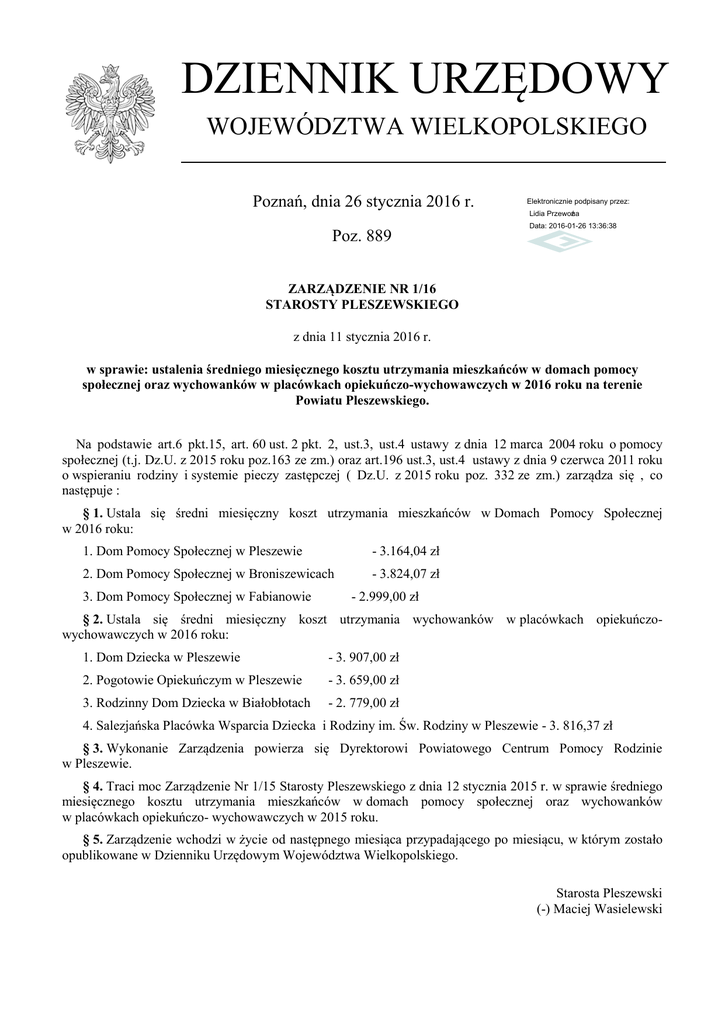 DZIENNIK URZĘDOWY WOJEWÓDZTWA WIELKOPOLSKIEGO Poznań, dnia 26 stycznia 2016 r. Elektronicznie podpisany przez: Lidia Przewoźna Poz. 889 Data: 2016-01-26 13:36:38 ZARZĄDZENIE NR 1/16 STAROSTY PLESZEWSKIEGO z dnia 11 stycznia 2016 r. w sprawie: ustalenia średniego miesięcznego kosztu utrzymania mieszkańców w domach pomocy społecznej oraz wychowanków w placówkach opiekuńczo-wychowawczych w 2016 roku na terenie Powiatu Pleszewskiego. Na podstawie art.6 pkt.15, art. 60 ust. 2 pkt. 2, ust.3, ust.4 ustawy z dnia 12 marca 2004 roku o pomocy społecznej (t.j. Dz.U. z 2015 roku poz.163 ze zm.) oraz art.196 ust.3, ust.4 ustawy z dnia 9 czerwca 2011 roku o wspieraniu rodziny i systemie pieczy zastępczej ( Dz.U. z 2015 roku poz. 332 ze zm.) zarządza się , co następuje : § 1. Ustala się średni miesięczny koszt utrzymania mieszkańców w Domach Pomocy Społecznej w 2016 roku: 1. Dom Pomocy Społecznej w Pleszewie - 3.164,04 zł 2. Dom Pomocy Społecznej w Broniszewicach - 3.824,07 zł 3. Dom Pomocy Społecznej w Fabianowie - 2.999,00 zł § 2. Ustala się średni miesięczny koszt utrzymania wychowanków w placówkach opiekuńczowychowawczych w 2016 roku: 1. Dom Dziecka w Pleszewie - 3. 907,00 zł 2. Pogotowie Opiekuńczym w Pleszewie - 3. 659,00 zł 3. Rodzinny Dom Dziecka w Białobłotach - 2. 779,00 zł 4. Salezjańska Placówka Wsparcia Dziecka i Rodziny im. Św. Rodziny w Pleszewie - 3. 816,37 zł § 3. Wykonanie Zarządzenia powierza się Dyrektorowi Powiatowego Centrum Pomocy Rodzinie w Pleszewie. § 4. Traci moc Zarządzenie Nr 1/15 Starosty Pleszewskiego z dnia 12 stycznia 2015 r. w sprawie średniego miesięcznego kosztu utrzymania mieszkańców w domach pomocy społecznej oraz wychowanków w placówkach opiekuńczo- wychowawczych w 2015 roku. § 5. Zarządzenie wchodzi w życie od następnego miesiąca przypadającego po miesiącu, w którym zostało opublikowane w Dzienniku Urzędowym Województwa Wielkopolskiego. Starosta Pleszewski (-) Maciej Wasielewski