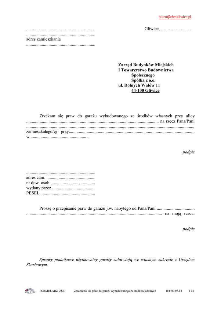 .............................................................. .............................................................. adres zamieszkania .............................................................. [email protected] Gliwice,............................ Zarząd Budynków Miejskich I Towarzystwo Budownictwa Społecznego Spółka z o.o. ul. Dolnych Wałów 11 44-100 Gliwice Zrzekam się praw do garażu wybudowanego ze środków własnych przy ulicy ....................................................................................................................... na rzecz Pana/Pani ....................................................................................................................................................... zamieszkałego/ej przy................................................................................................................. w .................................................. . podpis .............................................................. adres zam. ............................................ nr dow. osob. ....................................... wydany przez ...................................... PESEL ................................................. Proszę o przepisanie praw do garażu j.w. nabytego od Pana/Pani .................................. .......................................................................................................................... na moją rzecz. podpis Sprawy podatkowe użytkownicy garaży załatwiają we własnym zakresie z Urzędem Skarbowym. FORMULARZ ZSZ Zrzeczenie się praw do garażu wybudowanego ze środków własnych II/F:00.03.14 1z1