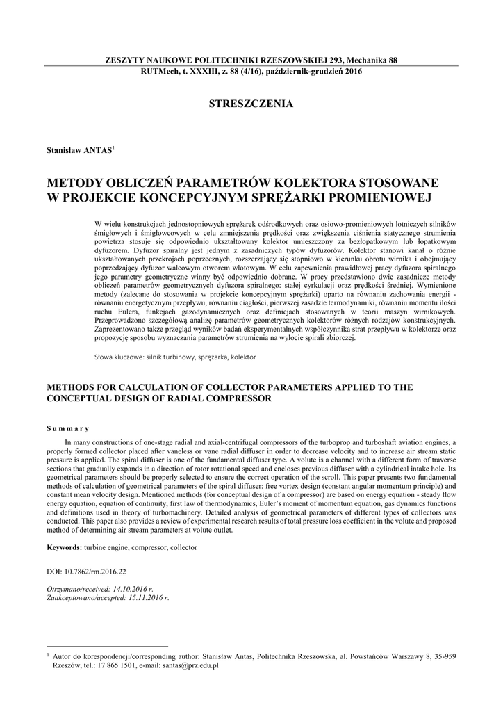 ZESZYTY NAUKOWE POLITECHNIKI RZESZOWSKIEJ 293, Mechanika 88 RUTMech, t. XXXIII, z. 88 (4/16), październik-grudzień 2016 STRESZCZENIA Stanisław ANTAS1 METODY OBLICZEŃ PARAMETRÓW KOLEKTORA STOSOWANE W PROJEKCIE KONCEPCYJNYM SPRĘŻARKI PROMIENIOWEJ W wielu konstrukcjach jednostopniowych sprężarek odśrodkowych oraz osiowo-promieniowych lotniczych silników śmigłowych i śmigłowcowych w celu zmniejszenia prędkości oraz zwiększenia ciśnienia statycznego strumienia powietrza stosuje się odpowiednio ukształtowany kolektor umieszczony za bezłopatkowym lub łopatkowym dyfuzorem. Dyfuzor spiralny jest jednym z zasadniczych typów dyfuzorów. Kolektor stanowi kanał o różnie ukształtowanych przekrojach poprzecznych, rozszerzający się stopniowo w kierunku obrotu wirnika i obejmujący poprzedzający dyfuzor walcowym otworem wlotowym. W celu zapewnienia prawidłowej pracy dyfuzora spiralnego jego parametry geometryczne winny być odpowiednio dobrane. W pracy przedstawiono dwie zasadnicze metody obliczeń parametrów geometrycznych dyfuzora spiralnego: stałej cyrkulacji oraz prędkości średniej. Wymienione metody (zalecane do stosowania w projekcie koncepcyjnym sprężarki) oparto na równaniu zachowania energii równaniu energetycznym przepływu, równaniu ciągłości, pierwszej zasadzie termodynamiki, równaniu momentu ilości ruchu Eulera, funkcjach gazodynamicznych oraz definicjach stosowanych w teorii maszyn wirnikowych. Przeprowadzono szczegółową analizę parametrów geometrycznych kolektorów różnych rodzajów konstrukcyjnych. Zaprezentowano także przegląd wyników badań eksperymentalnych współczynnika strat przepływu w kolektorze oraz propozycję sposobu wyznaczania parametrów strumienia na wylocie spirali zbiorczej. Słowa kluczowe: silnik turbinowy, sprężarka, kolektor METHODS FOR CALCULATION OF COLLECTOR PARAMETERS APPLIED TO THE CONCEPTUAL DESIGN OF RADIAL COMPRESSOR Summary In many constructions of one-stage radial and axial-centrifugal compressors of the turboprop and turboshaft aviation engines, a properly formed collector placed after vaneless or vane radial diffuser in order to decrease velocity and to increase air stream static pressure is applied. The spiral diffuser is one of the fundamental diffuser type. A volute is a channel with a different form of traverse sections that gradually expands in a direction of rotor rotational speed and encloses previous diffuser with a cylindrical intake hole. Its geometrical parameters should be properly selected to ensure the correct operation of the scroll. This paper presents two fundamental methods of calculation of geometrical parameters of the spiral diffuser: free vortex design (constant angular momentum principle) and constant mean velocity design. Mentioned methods (for conceptual design of a compressor) are based on energy equation - steady flow energy equation, equation of continuity, first law of thermodynamics, Euler’s moment of momentum equation, gas dynamics functions and definitions used in theory of turbomachinery. Detailed analysis of geometrical parameters of different types of collectors was conducted. This paper also provides a review of experimental research results of total pressure loss coefficient in the volute and proposed method of determining air stream parameters at volute outlet. Keywords: turbine engine, compressor, collector DOI: 10.7862/rm.2016.22 Otrzymano/received: 14.10.2016 r. Zaakceptowano/accepted: 15.11.2016 r. 1 Autor do korespondencji/corresponding author: Stanisław Antas, Politechnika Rzeszowska, al. Powstańców Warszawy 8, 35-959 Rzeszów, tel.: 17 865 1501, e-mail: [email protected] Tadeusz BALAWENDER2 Łukasz MICAŁ2 INFLUENCE OF FRICTION STIR WELDING TOOL GEOMETRY ON TENSILE STRENGTH OF THE JOINT Due to specific mechanical properties 2024 aluminum alloy is ideally suited for application in aerospace and automobile industries and because of its poor weldability is not widely used in other industries. To overcome this problem, a series of friction stir welding (FSW) experiments were conducted on 2024 aluminum alloy sheets by varying tools and key parameters of the process, i.e., rotation speed and travel rate of the weld tool. To investigate the influence of FSW process parameters on the mechanical strength of the joint, the tensile strength of the joint was examined as a function of FSW parameters for each tool. Optimum values of tool rotation speed and advance speed were determined for each tool and finally the optimum tool has been found. Keywords: friction stir welding, FSW tool geometry, 2024 aluminium alloy, tensile test WPŁYW GEOMETRII NARZĘDZIA DO ZGRZEWANIA TARCIOWEGO Z MIESZANIEM NA WYTRZYMAŁOŚĆ NA ROZCIĄGANIE POŁĄCZENIA Streszczenie Ze względu na odpowiednie właściwości mechaniczne, stop aluminium 2024 idealnie nadaje się do zastosowania w przemyśle lotniczym i samochodowym, natomiast ze względu na słabą spawalność nie jest szeroko stosowany w innych gałęziach przemysłu. Aby przezwyciężyć ten problem, przeprowadzono eksperymenty zgrzewania tarciowego z mieszaniem (ZTM) blach ze stopu aluminium 2024 z udziałem różnych narzędzi oraz w warunkach różnych najważniejszych parametrach procesu, to znaczy prędkości obrotowej i prędkości przemieszczania narzędzia zgrzewającego. Aby zbadać wpływ parametrów procesu ZTM na wytrzymałość mechaniczną połączenia, dla każdego narzędzia, określono wytrzymałość na rozciąganie w funkcji parametrów procesu ZTM. Optymalne wartości prędkości obrotowej oraz prędkości przemieszczania zostały określone dla każdego narzędzia, tak aby w końcu znaleźć optymalne narzędzie. Słowa kluczowe: zgrzewanie z przemieszaniem, geometria narzędzia do ZTM, stop aluminium 2024, test rozciągania DOI: 10.7862/rm.2016.23 Otrzymano/received: 10.10.2016 r. Zaakceptowano/accepted: 10.12.2016 r. Autor do korespondencji/corresponding author: Tadeusz Balawender, Politechnika Rzesz