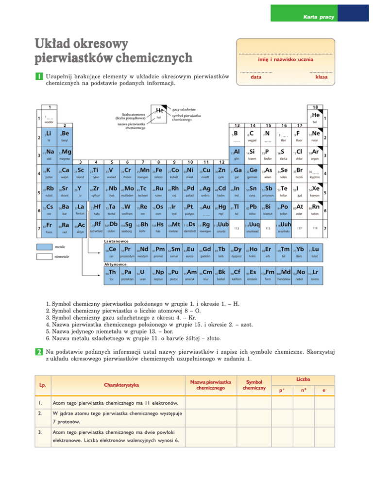 Karta pracy Układ okresowy pierwiastków chemicznych Uzupełnij brakujące elementy w układzie okresowym pierwiastków chemicznych na podstawie podanych informacji. .................................................................... imię i nazwisko ucznia ........................ data ................. klasa 1. Symbol chemiczny pierwiastka położonego w grupie 1. i okresie 1. – H. 2. Symbol chemiczny pierwiastka o liczbie atomowej 8 – O. 3. Symbol chemiczny gazu szlachetnego z okresu 4. – Kr. 4. Nazwa pierwiastka chemicznego położonego w grupie 15. i okresie 2. – azot. 5. Nazwa jedynego niemetalu w grupie 13. – bor. 6. Nazwa metalu szlachetnego w grupie 11. o barwie żółtej – złoto. Na podstawie podanych informacji ustal nazwy pierwiastków i zapisz ich symbole chemiczne. Skorzystaj z układu okresowego pierwiastków chemicznych uzupełnionego w zadaniu 1. Lp. Charakterystyka 1. Atom tego pierwiastka chemicznego ma 11 elektronów. 2. W jądrze atomu tego pierwiastka chemicznego występuje 7 protonów. 3. Atom tego pierwiastka chemicznego ma dwie powłoki elektronowe. Liczba elektronów walencyjnych wynosi 6. Nazwa pierwiastka chemicznego Symbol chemiczny Liczba p+ n0 e–