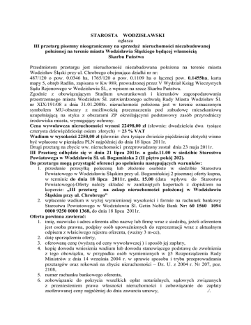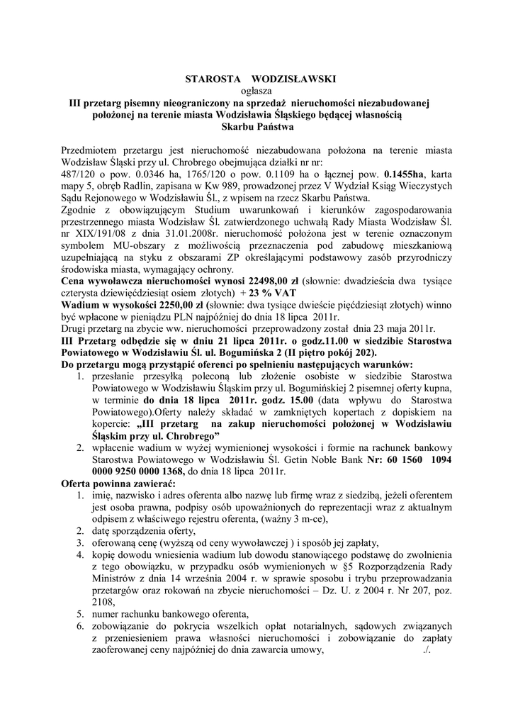 STAROSTA WODZISŁAWSKI ogłasza III przetarg pisemny nieograniczony na sprzedaż nieruchomości niezabudowanej położonej na terenie miasta Wodzisławia Śląskiego będącej własnością Skarbu Państwa Przedmiotem przetargu jest nieruchomość niezabudowana położona na terenie miasta Wodzisław Śląski przy ul. Chrobrego obejmująca działki nr nr: 487/120 o pow. 0.0346 ha, 1765/120 o pow. 0.1109 ha o łącznej pow. 0.1455ha, karta mapy 5, obręb Radlin, zapisana w Kw 989, prowadzonej przez V Wydział Ksiąg Wieczystych Sądu Rejonowego w Wodzisławiu Śl., z wpisem na rzecz Skarbu Państwa. Zgodnie z obowiązującym Studium uwarunkowań i kierunków zagospodarowania przestrzennego miasta Wodzisław Śl. zatwierdzonego uchwałą Rady Miasta Wodzisław Śl. nr XIX/191/08 z dnia 31.01.2008r. nieruchomość położona jest w terenie oznaczonym symbolem MU-obszary z możliwością przeznaczenia pod zabudowę mieszkaniową uzupełniającą na styku z obszarami ZP określającymi podstawowy zasób przyrodniczy środowiska miasta, wymagający ochrony. Cena wywoławcza nieruchomości wynosi 22498,00 zł (słownie: dwadzieścia dwa tysiące czterysta dziewięćdziesiąt osiem złotych) + 23 % VAT Wadium w wysokości 2250,00 zł (słownie: dwa tysiące dwieście pięćdziesiąt złotych) winno być wpłacone w pieniądzu PLN najpóźniej do dnia 18 lipca 2011r. Drugi przetarg na zbycie ww. nieruchomości przeprowadzony został dnia 23 maja 2011r. III Przetarg odbędzie się w dniu 21 lipca 2011r. o godz.11.00 w siedzibie Starostwa Powiatowego w Wodzisławiu Śl. ul. Bogumińska 2 (II piętro pokój 202). Do przetargu mogą przystąpić oferenci po spełnieniu następujących warunków: 1. przesłanie przesyłką poleconą lub złożenie osobiste w siedzibie Starostwa Powiatowego w Wodzisławiu Śląskim przy ul. Bogumińskiej 2 pisemnej oferty kupna, w terminie do dnia 18 lipca 2011r. godz. 15.00 (data wpływu do Starostwa Powiatowego).Oferty należy składać w zamkniętych kopertach z dopiskiem na kopercie: „III przetarg na zakup nieruchomości położonej w Wodzisławiu Śląskim przy ul. Chrobrego” 2. wpłacenie wadium w wyżej wymienionej wysokości i formie na rachunek bankowy Starostwa Powiatowego w Wodzisławiu Śl. Getin Noble Bank Nr: 60 1560 1094 0000 9250 0000 1368, do dnia 18 lipca 2011r. Oferta powinna zawierać: 1. imię, nazwisko i adres oferenta albo nazwę lub firmę wraz z siedzibą, jeżeli oferentem jest osoba prawna, podpisy osób upoważnionych do reprezentacji wraz z aktualnym odpisem z właściwego rejestru oferenta, (ważny 3 m-ce), 2. datę sporządzenia oferty, 3. oferowaną cenę (wyższą od ceny wywoławczej ) i sposób jej zapłaty, 4. kopię dowodu wniesienia wadium lub dowodu stanowiącego podstawę do zwolnienia z tego obowiązku, w przypadku osób wymienionych w §5 Rozporządzenia Rady Ministrów z dnia 14 września 2004 r. w sprawie sposobu i trybu przeprowadzania przetargów oraz rokowań na zbycie nieruchomości – Dz. U. z 2004 r. Nr 207, poz. 2108, 5. numer rachunku bankowego oferenta, 6. zobowiązanie do pokrycia wszelkich opłat notarialnych, sądowych związanych z przeniesieniem prawa własności nieruchomości i zobowiązanie do zapłaty zaoferowanej ceny najpóźniej do dnia zawarcia umowy, ./. -27. proponowany sposób zagospodarowania nieruchomości 8. oświadczenie, że oferent zapoznał się z warunkami przetargu w ogłoszeniu i przyjmuje je bez zastrzeżeń. Zasady przeprowadzenia przetargu: 1. część jawna przetargu odbędzie się w dniu 21 lipca 2011r. o godz. 11.00 w budynku Starostwa Powiatowego w Wodzisławiu Śl. przy ul. Bogumińskiej 2; o wyborze lub zamknięciu przetargu bez dokonania wyboru oferenta, uczestnicy zostaną powiadomieni w formie pisemnej, 2. oferty złożone po terminie lub bez dowodu wpłaty wadium nie będą rozpatrywane, 3. wadium przepada w razie uchylenia się oferenta, który przetarg wygrał, od zawarcia notarialnej umowy kupna na warunkach określonych w ofercie, albo nie uiszczenia całości ceny przed zawarciem tejże umowy; wadium złożone przez oferentów, których oferty nie zostaną przyjęte, zostanie zwrócone w terminie 3 dni od dnia rozstrzygnięcia przetargu; oferentowi, którego oferta została przyjęta wadium zostanie zaliczone na poczet ceny nabycia, 4. Ogłoszenie o przetargu zostało wywieszone na tablicy ogłoszeń w budynku tut. Starostwa w Wodzisławiu Śl. przy Bogumińskiej 2 oraz zamieszczone na stronie internetowej Starostwa www.powiatwodzislawski.bip.pl Osoby zainteresowane mogą się zapoznać z dodatkowymi informacjami o przedmiocie sprzedaży w godz. od 8.00-15.00 w Wydziale Gospodarki Nieruchomościami tut. Starostwa osobiście lub telefonicznie pod nr (032) 4539758 Starosta Powiatu Wodzisławskiego zastrzega sobie prawo swobodnego wyboru oferty, a także do odstąpienia od sprzedaży w każdym czasie lub unieważnienia przetargu bez podania przyczyn. JS/3