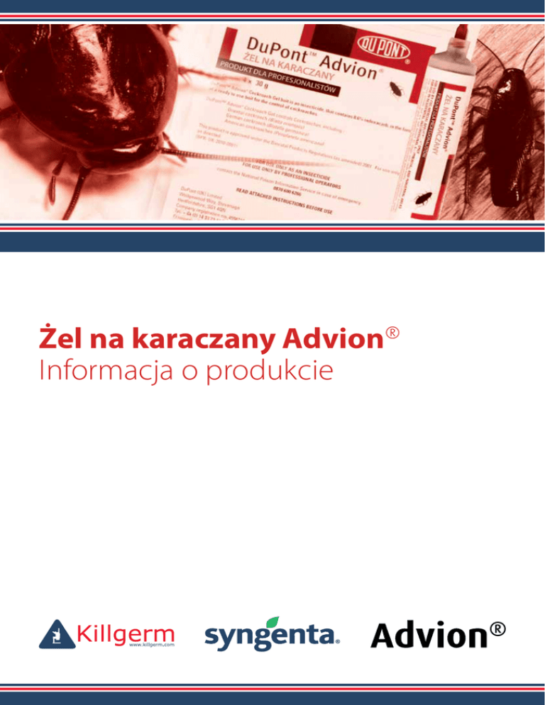 Żel na karaczany Advion® Informacja o produkcie Co to jest Advion? Advion jest efektywnym środkiem służącym do zwalczania karaczanów. Bardzo atrakcyjny dla szkodników preparat ma postać żelu i zawiera substancję czynną indoksakarb 0,6%. Dzięki swoim właściwościom i skuteczności Advion stanowi doskonałą alternatywę dla innych metod insektobójczych (na przykład oprysków). Oczywiście, w ramach zintegrowanego podejścia do kontroli szkodników możliwe jest równoległe stosowanie żelu i oprysków, te ostanie powinny być wykonywane jedynie jako „działania uzupełniające”. Informacje dotyczące substancji czynnej Indoksakarb jest związkiem z grupy oksadiazyn, który oddziałuje na układ nerwowy owada. Enzymy karaczana rozszczepiają cząsteczki indoksakarbu, w wyniku czego powstaje jeszcze mocniejszy insektycyd w tzw. „postaci metaaktywnej”. Ze względu na nowatorski sposób działania doskonale nadaje się do stosowania w sytuacjach, w których istnieje ryzyko wystąpienia efektu odporności na wcześniej stosowane środki. Indoksakarb jako jedyna substancja tego typu powoduje tzw. „efekt kaskadowy”, co znacznie zwiększa jego efektywność. Według amerykańskiej Agencji Ochrony Środowiska jest to jedyna stosowana w przynętach substancja czynna, którą cechuje zmniejszony wpływ na środowisko naturalne. Czy znajdująca się w żelu Advion substancja czynna jest obecna w innych produktach do zwalczania karaczanów dostępnych na rynku polskim? Nie. Advion jest jedynym dostępnym na rynku polskim i przeznaczonym do zwalczania karaczanów produktem zawierającym substancje czynną indoksakarb. Jakie gatunki karaczanów można zwalczać za pomocą żelu Advion? 6. Nimfa 5. Nimfa • N ie można aplikować żelu wewnątrz ani w pobliżu rur kanalizacyjnych. Czy Advion żel można stosować przeciwko innym gatunkom karaczanów? • Ż elu nie należy stosować w miejscach, w których preparat może mieć bezpośredni kontakt z żywnością, karmą dla zwierząt, narzędziami i sprzętem kuchennym, nie może być aplikowany również na powierzchniach przeznaczonych do produkcji żywności lub w ich pobliżu. Tak Czy Advion żel równie skutecznie zwalcza osobniki dorosłe i larwy? Tak Przed zastosowaniem żelu należy przeprowadzić dokładną inspekcję zainfekowanych pomieszczeń w celu oceny ogólnego poziomu infestacji, lokalizacji kryjówek szkodników i wyboru najbardziej odpowiednich miejsc do wykładania preparatu. • N ie wolno również stosować go w miejscach, które są regularnie czyszczone. • Advion żel należy aplikować w miejscach niedostępnych dla dzieci i zwierząt domowych. Przykłady miejsc, w których można wykładać żel Advion • Advion żel może być stosowany zarówno wewnątrz pomieszczeń, w których przechowywana jest żywność, jak i na terenach obiektów niezwiązanych z jej produkcją. Preparat można stosować w domach i budynkach mieszkalnych, obiektach przemysłowych, biurach, magazynach, pomieszczeniach kuchennych, szpitalach, szkołach, domach opieki, hotelach, autobusach, pociągach, samolotach, sklepach i obiektach komercyjnych oraz w miejscach, które mogą stanowić kryjówki dla karaczanów. • powierzchnie za kuchenkami i lodówkami; • Gdzie można stosować żel Advion? Żel Advion jest przeznaczony do stosowania np. w blokach mieszkalnych, domach prywatnych, obiektach handlowych i przemysłowych, budynkach użyteczności publicznej oraz środkach transportu. Jak należy aplikować Advion? Podczas korzystania z żelu zalecane jest stosowanie odpowiedniego aplikatora, co umożliwia precyzyjne dozowanie pożądanej ilości preparatu. Dawkowanie • Na 1 m2 powinny przypadać co najmniej 2 punkty z żelem; • Należy zwiększyć liczbę punktów wykładania żelu (do 5 punktów na 1 m2) w wypadkach: nasilenia infestacji, wyjątkowo zabrudzonych nawierzchni oraz w sytuacjach, w których mamy do czynienia z karaczanem wschodnim bądź przybyszką amerykańską. • Kropla żelu o średnicy 5 mm waży około 0,1 g; • Kropla żelu o średnicy 10 mm waży około 0,5 g; • Cienka warstwa żelu o długości 5 cm i szerokości 0,3 mm waży około 0,35 g. 4. Nimfa 3. Nimfa 2. Nimfa 1. Nimfa Gdzie nie należy używać żelu Advion? • Ż el można stosować tylko w miejscach niedostępnych dla dzieci, zwierząt domowych i innych zwierząt niedocelowych. Żel Advion jest przeznaczony do zwalczania następujących gatunków karaczanów: karaczan wschodni (Blatta orientalis), karaczan prusak (Blattella germanica) i przybyszka amerykańska (Periplaneta americana). Uwaga: Przeobrażenie w postać dorosłą Gdzie należy wykładać żel Advion? • Żel Advion może być również wykładany w odpowiednich stacjach, pod warunkiem, że będzie on odpowiednio zabezpieczony przed dziećmi i zwierzętami domowymi. Oczywiście, stacje należy umieszczać w miejscach aktywności szkodników. • Dawkowanie: od 0,2 g/m2 do 0,5 g/m2. • listwy podłogowe; • listwy sufitowe; • powierzchnie przy ścianach; • powierzchnie przy rurach CO; • miejsca przy kablach elektrycznych; Moją podstawową metodą kontroli są opryski. Dlaczego mam stosować Advion? Jest kilka powodów, dla których warto wybrać żel Advion: Skuteczność – żel Advion jest wysoce atrakcyjny dla szkodników, skuteczny i powoduje „efekt kaskadowy”. Jak sprawdza się żel w wysokich temperaturach? W temperaturze powyżej 50oC żel zaczyna topnieć i traci swoje właściwości. W związku z tym nie należy go stosować w miejscach i na powierzchniach, gdzie temperatura może przekroczyć wspomniany poziom (np. na kuchenkach gazowych, grillach, okapach, w saunach, na frytkownicach, zmywarkach czy rurach z gorącą wodą). Czy Advion można stosować na zewnątrz budynków? Tak, jednak Advion jest przede wszystkim przeznaczony do stosowania wewnątrz budynków. Czy należy zakładać odzież ochronną? Przy stosowaniu żelu Advion należy