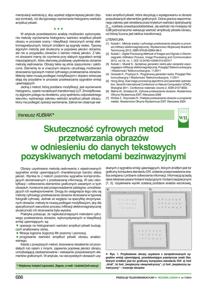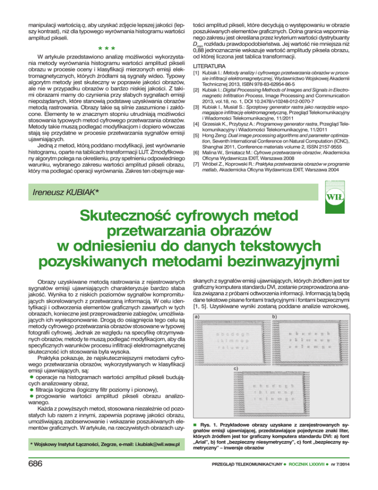 manipulacji wartością q, aby uzyskać zdjęcie lepszej jakości (lepszy kontrast), niż dla typowego wyrównania histogramu wartości amplitud pikseli. *** W artykule przedstawiono analizę możliwości wykorzystania metody wyrównania histogramu wartości amplitud pikseli obrazu w procesie oceny i klasyfikacji mierzonych emisji elektromagnetycznych, których źródłami są sygnały wideo. Typowy algorytm metody jest skuteczny w poprawie jakości obrazów, ale nie w przypadku obrazów o bardzo niskiej jakości. Z takimi obrazami mamy do czynienia przy słabych sygnałach emisji niepożądanych, które stanowią podstawę uzyskiwania obrazów metodą rastrowania. Obrazy takie są silnie zaszumione i zakłócone. Elementy te w znacznym stopniu utrudniają możliwości stosowania typowych metod cyfrowego przetwarzania obrazów. Metody takie muszą podlegać modyfikacjom i dopiero wówczas stają się przydatne w procesie przetwarzania sygnałów emisji ujawniających. Jedną z metod, którą poddano modyfikacji, jest wyrównanie histogramu, oparte na tablicach transformacji LUT. Zmodyfikowany algorytm polega na określeniu, przy spełnieniu odpowiedniego warunku, wybranego zakresu wartości amplitud pikseli obrazu, który ma podlegać operacji wyrównania. Zakres ten obejmuje war- tości amplitud pikseli, które decydują o występowaniu w obrazie poszukiwanych elementów graficznych. Dolna granica wspomnianego zakresu jest określana przez kryterium wartości dystrybuanty Dmin rozkładu prawdopodobieństwa. Jej wartość nie mniejsza niż 0,88 jednoznacznie wskazuje wartość amplitudy piksela obrazu, od której liczona jest tablica transformacji. Literatura [1] Kubiak I.: Metody analizy i cyfrowego przetwarzania obrazów w procesie infiltracji elektromagnetycznej, Wydawnictwo Wojskowej Akademii Technicznej 2013, ISBN 978-83-62954-86-5 [2] Kubiak I.: Digital Processing Methods of Images and Signals in Electromagnetic Infiltration Process, Image Processing and Communication 2013, vol.18, no. 1, DOI 10.2478/v10248-012-0070-7 [3] Kubiak I., Musiał S.: Sprzętowy generator rastra jako narzędzie wspomagające infiltrację elektromagnetyczną, Przegląd Telekomunikacyjny i Wiadomości Telekomunikacyjne, 11/2011 [4] Grzesiak K., Przybysz A.: Programowy generator rastra, Przegląd Telekomunikacyjny i Wiadomości Telekomunikacyjne, 11/2011 [5] Hong Zeng: Dual image processing algorithms and parameter optimization, Seventh International Conference on Natural Computation (ICNC), Shanghai 2011, Conference materials volume 2, ISSN 2157-9555 [6] Malina W., Smiatacz M.: Cyfrowe przetwarzanie obrazów, Akademicka Oficyna Wydawnicza EXIT, Warszawa 2008 [7] Wróbel Z., Koprowski R.: Praktyka przetwarzania obrazów w programie matlab, Akademicka Oficyna Wydawnicza EXIT, Warszawa 2004 Ireneusz Kubiak* Skuteczność cyfrowych metod przetwarzania obrazów w odniesieniu do danych tekstowych pozyskiwanych metodami bezinwazyjnymi Obrazy uzyskiwane metodą rastrowania z rejestrowanych sygnałów emisji ujawniających charakteryzuje bardzo słaba jakość. Wynika to z niskich poziomów sygnałów kompromitujących skorelowanych z przetwarzaną informacją. W celu identyfikacji i odtworzenia elementów graficznych zawartych w tych obrazach, konieczne jest przeprowadzenie zabiegów, umożliwiających ich wyeksponowanie. Drogą do osiągnięcia tego celu są metody cyfrowego przetwarzania obrazów stosowane w typowej fotografii cyfrowej. Jednak ze względu na specyfikę otrzymywanych obrazów, metody te muszą podlegać modyfikacjom, aby dla specyficznych warunków procesu infiltracji elektromagnetycznej skuteczność ich stosowania była wysoka. Praktyka pokazuje, że najskuteczniejszymi metodami cyfrowego przetwarzania obrazów, wykorzystywanych w klasyfikacji emisji ujawniających, są: operacje na histogramach wartości amplitud pikseli budujących analizowany obraz, filtracja logiczna (logiczny filtr poziomy i pionowy), progowanie wartości amplitud pikseli obrazu analizowanego. Każda z powyższych metod, stosowana niezależnie od pozostałych lub razem z innymi, zapewnia poprawę jakości obrazu, umożliwiającą zaobserwowanie i wskazanie poszukiwanych elementów graficznych. W artykule, na rzeczywistych obrazach uzy- skanych z sygnałów emisji ujawniających, których źródłem jest tor graficzny komputera standardu DVI, zostanie przeprowadzona analiza związana z próbami odtworzenia informacji. Informacją tą będą dane tekstowe pisane fontami tradycyjnymi i fontami bezpiecznymi [1, 5]. Uzyskiwane wyniki zostaną poddane analizie wzrokowej, • • • * Wojskowy Instytut Łączności, Zegrze, e-mail: [email protected] 686 Rys. 1. Przykładowe obrazy uzyskane z zarejestrowanych sygnałów emisji ujawniającej, przedstawiające pojedyncze znaki liter, których źródłem jest tor graficzny komputera standardu DVI: a) font „Arial”, b) font „bezpieczny niesymetryczny”, c) font „bezpieczny symetryczny” – inwersje obrazów PRZEGLĄD TELEKOMUNIKACYJNY ROCZNIK LXXXVII nr 7/2014 która będzie stanowić podstawę oceny fontów bezpiecznych pod względem ich skuteczności w ochronie danych niejawnych. Działaniu wybranych metod cyfrowego przetwarzania obrazów poddano obrazy, których przykładowe realizacje przedstawiono na rys.1 i rys. 2. Obrazy zawierają pojedyncze znaki liter fontów bezpiecznych i tradycyjnych oraz krótkie teksty pisane z użyciem wspomnianych fontów. W tym miejscu należy wspomnieć, że rejestrowane sygnały emisji ujawniających charakteryzowały się poziomami, które osiągnięto dla źródła w postaci kabla sygnałowego standardu DVI, w którym zaburzono ciągłość ekranu. Istotą analizy było bowiem pokazanie, że nawet w warunkach idealnych rozróżnienie znaków fontów bezpiecznych jest bardzo utrudnione. Rys. 2. Przykładowe obrazy uzyskane z zarejestrowanych sygnałów emisji ujawniającej, przedstawiające ciągi znaków liter (po dwa wiersze jednego fo