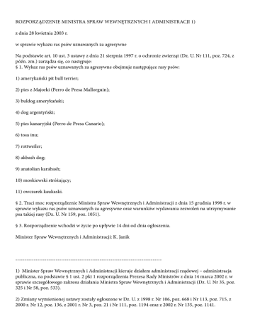 ROZPORZĄDZENIE MINISTRA SPRAW WEWNĘTRZNYCH I ADMINISTRACJI 1) z dnia 28 kwietnia 2003 r. w sprawie wykazu ras psów uznawanych za agresywne Na podstawie art. 10 ust. 3 ustawy z dnia 21 sierpnia 1997 r. o ochronie zwierząt (Dz. U. Nr 111, poz. 724, z późn. zm.) zarządza się, co następuje: § 1. Wykaz ras psów uznawanych za agresywne obejmuje następujące rasy psów: 1) amerykański pit bull terrier; 2) pies z Majorki (Perro de Presa Mallorguin); 3) buldog amerykański; 4) dog argentyński; 5) pies kanaryjski (Perro de Presa Canario); 6) tosa inu; 7) rottweiler; 8) akbash dog; 9) anatolian karabash; 10) moskiewski stróżujący; 11) owczarek kaukaski. § 2. Traci moc rozporządzenie Ministra Spraw Wewnętrznych i Administracji z dnia 15 grudnia 1998 r. w sprawie wykazu ras psów uznawanych za agresywne oraz warunków wydawania zezwoleń na utrzymywanie psa takiej rasy (Dz. U. Nr 159, poz. 1051). § 3. Rozporządzenie wchodzi w życie po upływie 14 dni od dnia ogłoszenia. Minister Spraw Wewnętrznych i Administracji: K. Janik -------------------------------------------------------------------------------1) Minister Spraw Wewnętrznych i Administracji kieruje działem administracji rządowej – administracja publiczna, na podstawie § 1 ust. 2 pkt 1 rozporządzenia Prezesa Rady Ministrów z dnia 14 marca 2002 r. w sprawie szczegółowego zakresu działania Ministra Spraw Wewnętrznych i Administracji (Dz. U. Nr 35, poz. 325 i Nr 58, poz. 533). 2) Zmiany wymienionej ustawy zostały ogłoszone w Dz. U. z 1998 r. Nr 106, poz. 668 i Nr 113, poz. 715, z 2000 r. Nr 12, poz. 136, z 2001 r. Nr 3, poz. 21 i Nr 111, poz. 1194 oraz z 2002 r. Nr 135, poz. 1141.