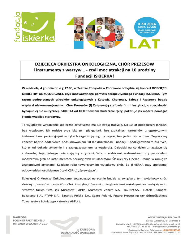 DZIECIĘCA ORKIESTRA ONKOLOGICZNA, CHÓR PREZESÓW i instrumenty z warzyw… - czyli moc atrakcji na 10 urodziny Fundacji ISKIERKA! W niedzielę, 4 grudnia br. o g.17.00, w Teatrze Rozrywki w Chorzowie odbędzie się koncert DZIECIĘCEJ ORKIESTRY ONKOLOGICZNEJ, czyli innowacyjnego pomysłu terapeutycznego Fundacji ISKIERKA. Tym razem podopiecznych ośrodków onkologicznych z Katowic, Chorzowa, Zabrza i Rzeszowa będzie wspierał niekonwencjonalny… Chór Prezesów (!) Zaśpiewają szefowie firm i instytucji, o specjalności bynajmniej nie muzycznej. ISKIERKA od 10 lat bowiem skutecznie łączy, pokazuje jak mądrze pomagać i łamie wszelkie stereotypy. To wyjątkowe wydarzenie społeczno-artystyczne ma już swoją tradycję. Od 10 lat podopieczni ISKIERKI bez kroplówek, ich rodzice oraz lekarze i pielęgniarki bez szpitalnych fartuchów, z egzotycznymi instrumentami perkusyjnymi w rękach organizują się, by zagrać ten jeden raz w roku. Tegoroczny koncert będzie dodatkowo podsumowaniem 10 lat działalności Fundacji i podziękowaniem dla tych, którzy od dekady aktywnie i z zaangażowaniem ją wspierają. Dzieciaki na co dzień zmagające się z chorobą, tego jednego dnia stają się artystami. Wraz z rodzicami, rodzeństwem czy personelem medycznym grali na instrumentach perkusyjnych w Filharmonii Śląskiej czy Operze - ramię w ramię ze znakomitymi artystami. Każdego roku towarzyszy im wyjątkowy chór. Bo ISKIERKA uczy społecznej odpowiedzialności biznesu ( czyli CSR-u) „śpiewająco”. Dziecięcej Orkiestrze Onkologicznej towarzyszyć na scenie będzie w związku z tym wyjątkowy chór, złożony z prezesów prawie 40 spółek i instytucji. Swoimi umiejętnościami wokalnymi pochwalą się m.in. szefowie takich firm, jak Microsoft Polska, Mostostal Zabrze S.A., Tax-Net.SA., Hotele Diament, Bakalland S.A., PTWP S.A., Sarantis Polska S.A., Segro Poland, Future Processing czy Górnośląskiego Towarzystwa Lotniczego Katowice AirPort. ARTYŚCI: Tradycyjnie już w muzyczną podróż poprowadzi gości dyrektor artystyczny projektu Piotr Sutt, a wspierać na scenie go będą muzycy Michał Kuźmiński oraz Karolina i Bartłomiej Sutt. Koncert „10 lat Fundacji ISKIERKA” to także występy znakomitych zespołów: RAZ DWA TRZY I KAPELI ZE WSI WARSZAWA. ASI MINA (pod tym pseudonimem ukrywa się katowiczanka Joanna Bonisławska) jest specjalistką od dźwięków nieoczywistych i nieobliczalnych. Przygotuje wraz z podopiecznymi fundacji utwory zagrane na instrumentach z warzyw oraz z recyklingu. AGNIESZKA TWARDOWSKA to utalentowana wokalistka, o której Marek Piekarczyk (jako juror The Voice of Poland) powiedział, że ma „bezcenny dar przekazywania uczuć”. Wykona razem z tą nietypową orkiestrą i chórem utwory, które z pewnością poruszą, ale i rozbawią. Gdyż jedna rzecz jest w koncertach ISKIERKI niezmienna: dobra zabawa, pozytywne doładowanie energetyczne w środku zimy i łamanie stereotypów. Czy tych o koncertach charytatywnych, czy tych dotyczących „biednych chorych dzieci”. Fundacja ISKIERKA od 10 lat udowadnia, że można inaczej. Tegoroczny koncert poprowadzą, z klasą i humorem, przyjaciele Fundacji ISKIERKA: Mirosław Neinert i Szymon Majewski. – Coroczny koncert to dla nas zawsze wielkie i ważne wydarzenie, a tegoroczny jest dla ISKIERKI szczególny. Działamy już 10 lat, ale zapewniam, że energii do pracy wystarczy nam jeszcze na wiele dekad. Szczególnie, jeśli będą się kończyły tak pozytywnie jak ten. Co roku do udziału w koncercie zapraszamy pewną grupę zawodową. Tym razem zaprosiliśmy szefów firm, które śmiało możemy nazwać naszymi przyjaciółmi. Mamy nadzieję, że wspólnie z nami przeżyją magiczne chwile, bo to, że ubawią się do łez, jest pewne – mówi Joanna Czernicka-Siwecka, Prezes Fundacji ISKIERKA. Podczas instrumentalnych, wokalnych i tanecznych występów odbędzie się również wręczenie statuetek „Przyjaciel Fundacji ISKIERKA” oraz prezentacja najważniejszych działań. Zespół pracowników wspierają bowiem w działaniach wolontariusze oraz partnerzy ze środowisk biznesowych, samorządowych, a także osoby ze świata nauki, sportu, sztuki, kultury i show biznesu. Wydarzenie w tym roku nie jest biletowane, ale będzie je można bezpłatnie obejrzeć on-line, poprzez stronę fundacji: www.fundacjaiskierka.pl Szczegółowe informacje dotyczące artystów, biorących udział w koncercie dostępne są na stronach: http://www.zespolrazdwatrzy.pl/ http://www.kzww.pl/ http://ultima-thule.pl/pl/2015/09/30/joanna_bronislawska/ http://agnieszkatwardowska.com/ Więcej informacji na temat samego projektu znajduje się pod adresem: http://fundacjaiskierka.pl/projekty/projekt-1/ DZIECIĘCA ORKIESTRA ONKOLOGICZNA tworzy się i koncertuje raz w roku. Wydała już trzy profesjonalne płyty (m.in. z Arturem Rojkiem, Natalią Kukulską, Miką Urbaniak, Me Myself And I, Renatą Przemyk, Arturem Andrusem, zespołem Raz Dwa Trzy). Gościła też na kultowej liście przebojów radiowej „Trójki”. *** Fundacja ISKIERKA, jako Organizacja Pożytku Publicznego (KRS: 0000248546) od 2006 roku zajmuje się tworzeniem systemów wsparcia finansowego, psychologicznego i społecznego dla dzieci z chorobą nowotworową i ich rodzin. To ponad 500 podopiecznych fundacji (w trakcie i po leczeniu onkologicznym) i systemowe działanie. Fundacja wspiera w procesie leczenia: kupując leki, sprzęt medyczny, remontując dziecięce oddziały szpitalne i finansując badania naukowe z zakresu skuteczniejszej diagnostyki onkologicznej. ISKIERKA pomaga chorym dzieciom i ich rodzinom przejść przez najtrudniejsze etapy leczenia poprzez innowacyjne projekty terapeutyczne i integracyjne. Organizuje letni wypoczynek i wspiera rehabilitację. W ramach wymiany dobrych praktyk i budowania społeczeństwa obywatelskiego, tworzy innowacyjne projekty z obszaru społecznej odpowiedzialności biznesu, prowadzi akcje i kampanie społeczne, orga