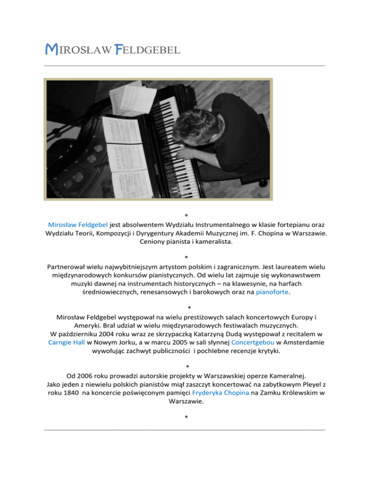 MIROSŁAW FELDGEBEL ________________________________________________________________ * Mirosław Feldgebel jest absolwentem Wydziału Instrumentalnego w klasie fortepianu oraz Wydziału Teorii, Kompozycji i Dyrygentury Akademii Muzycznej im. F. Chopina w Warszawie. Ceniony pianista i kameralista. * Partnerował wielu najwybitniejszym artystom polskim i zagranicznym. Jest laureatem wielu międzynarodowych konkursów pianistycznych. Od wielu lat zajmuje się wykonawstwem muzyki dawnej na instrumentach historycznych – na klawesynie, na harfach średniowiecznych, renesansowych i barokowych oraz na pianoforte. * Mirosław Feldgebel występował na wielu prestiżowych salach koncertowych Europy i Ameryki. Brał udział w wielu międzynarodowych festiwalach muzycznych. W październiku 2004 roku wraz ze skrzypaczką Katarzyną Dudą występował z recitalem w Carngie Hall w Nowym Jorku, a w marcu 2005 w sali słynnej Concertgebou w Amsterdamie wywołując zachwyt publiczności i pochlebne recenzje krytyki. * Od 2006 roku prowadzi autorskie projekty w Warszawskiej operze Kameralnej. Jako jeden z niewielu polskich pianistów miął zaszczyt koncertowad na zabytkowym Pleyel z roku 1840 na koncercie poświęconym pamięci Fryderyka Chopina na Zamku Królewskim w Warszawie. * ________________________________________________________________