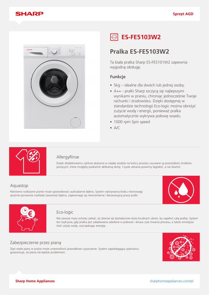 Sprzęt AGD ES-FE5103W2 Pralka ES-FE5103W2 Ta biała pralka Sharp ES-FE5101W2 zapewnia wygodną obsługę. Funkcje 5kg – idealne dla dwóch lub jednej osoby. A++ - pralki Sharp szczycą się najlepszymi wynikami w praniu, chroniąc jednocześnie Twoje rachunki i środowisko. Dzięki dostępnej w standardzie technologii Eco-logic można obniżyć zużycie wody i energii, ponieważ pralka automatycznie wykrywa połowę wsadu. 1000 rpm Spin speed A/C AllergyRinse Dzięki dodatkowemu cyklowi płukania w ciepłej wodzie na końcu procesu usuwane są pozostałości środków piorących, które mogłyby podrażnić delikatną skórę. Czyste ubrania powinny łagodzić, a nie drażnić. Aquastop Nierówno rozłożone pranie może spowodować uszkodzenie bębna. System wykrywania braku równowagi sprytnie ponownie rozkłada zawartość bębna, zapewniając jej równomierne i bezawaryjną pracę pralki. Eco-logic Nie zawsze masz ochotę czekać, aż zbierze się dostatecznie dużo brudnych ubrań, by zapełnić całą pralkę. System ten wykrywa, gdy pralka jest załadowana zaledwie w połowie i skraca czas trwania procesu, a także zmniejsza ilość użytej wody, oszczędzając energię. Zabezpieczenie przez pianą Zbyt wiele piany w pralce może uniemożliwić prawidłowe czyszczenie. System zapobiegający spienianiu gwarantuje, że piana nie będzie problemem. Sharp Home Appliances sharphomeappliances.com/pl Sprzęt AGD Kluczowe cechy Szybkość wirowania (obr./min) 1000 Thermojet Nie Start z opóźnieniem Nie Czas najkrótszego prania (min) 15 Sprawność energetyczna A++ Bęben o dużej pojemności i duże drzwi Nie Wydajność prania A Liczba programów 15 Wydajność wirowania C Kolor Biały Gwarancja (w latach) Dwa lata na części i robociznę System wykrywania braku równowagi Tak Maksymalny wsad do prania (kg) 5 Doublejet Nie Inne funkcje Typ wyświetlacza Wskaźnik elektroniczny Zmienna szybkość wirowania Nie Zmienna temperatura Nie Zabezpieczenie przed przepełnieniem Tak Objętość bębna 42 System wykrywania usterek Tak System Eco-Logic Tak Wskaźnik cyklu prania Tak NightWash Nie Wlot wody Zimna Stainmaster Nie Dodatkowe płukanie Tak Zabezpieczenie przed dziećmi Nie Namaczanie Nie Zabezpieczenie przez pianą Tak Łatwe prasowanie Nie Sharp Home Appliances sharphomeappliances.com/pl Sprzęt AGD Inne funkcje nieprzerwany Szeroko otwierane drzwi Tak Regulowane nóżki Tak Wskazówki dotyczące dozowania Nie Start/pauza Tak Poziom szumów podczas prania (dBA) 58 Poziom szumów podczas wirowania (dBA) 77 Masa produktu z opakowaniem (kg) 58.5 Masa produktu bez opakowania (kg) 57 Roczne zużycie energii (kWh/rok) 147 Roczne zużycie wody (w litrach) 9240 Wymiary i waga Wysokość (cm) 84.5 Szerokość (cm) 59.7 Głębokość (cm) 49.7 Mocy, zużycia i napięcia Prąd elektryczny (A) 10 Napięcie (V) / częstotliwość (Hz) 220-240V / 50Hz Moc (W) 2100 European article number Kod EAN Sharp Home Appliances Powered by TCPDF (www.tcpdf.org) 4974019873459 sharphomeappliances.com/pl