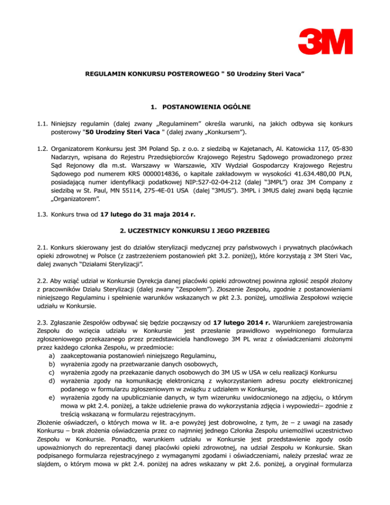 REGULAMIN KONKURSU POSTEROWEGO " 50 Urodziny Steri Vaca” 1. POSTANOWIENIA OGÓLNE 1.1. Niniejszy regulamin (dalej zwany „Regulaminem” określa warunki, na jakich odbywa się konkurs posterowy "50 Urodziny Steri Vaca " (dalej zwany „Konkursem”). 1.2. Organizatorem Konkursu jest 3M Poland Sp. z o.o. z siedzibą w Kajetanach, Al. Katowicka 117, 05-830 Nadarzyn, wpisana do Rejestru Przedsiębiorców Krajowego Rejestru Sądowego prowadzonego przez Sąd Rejonowy dla m.st. Warszawy w Warszawie, XIV Wydział Gospodarczy Krajowego Rejestru Sądowego pod numerem KRS 0000014836, o kapitale zakładowym w wysokości 41.634.480,00 PLN, posiadającą numer identyfikacji podatkowej NIP:527-02-04-212 (dalej “3MPL”) oraz 3M Company z siedzibą w St. Paul, MN 55114, 275-4E-01 USA (dalej “3MUS”). 3MPL i 3MUS dalej zwani będą łącznie „Organizatorem”. 1.3. Konkurs trwa od 17 lutego do 31 maja 2014 r. 2. UCZESTNICY KONKURSU I JEGO PRZEBIEG 2.1. Konkurs skierowany jest do działów sterylizacji medycznej przy państwowych i prywatnych placówkach opieki zdrowotnej w Polsce (z zastrzeżeniem postanowień pkt 3.2. poniżej), które korzystają z 3M Steri Vac, dalej zwanych “Działami Sterylizacji”. 2.2. Aby wziąć udział w Konkursie Dyrekcja danej placówki opieki zdrowotnej powinna zgłosić zespół złożony z pracowników Działu Sterylizacji (dalej zwany “Zespołem”). Złoszenie Zespołu, zgodnie z postanowieniami niniejszego Regulaminu i spełnienie warunków wskazanych w pkt 2.3. poniżej, umożliwia Zespołowi wzięcie udziału w Konkursie. 2.3. Zgłaszanie Zespołów odbywać się będzie począwszy od 17 lutego 2014 r. Warunkiem zarejestrowania Zespołu do wzięcia udziału w Konkursie jest przesłanie prawidłowo wypełnionego formularza zgłoszeniowego przekazanego przez przedstawiciela handlowego 3M PL wraz z oświadczeniami złożonymi przez każdego członka Zespołu, w przedmiocie: a) zaakceptowania postanowień niniejszego Regulaminu, b) wyrażenia zgody na przetwarzanie danych osobowych, c) wyrażenia zgody na przekazanie danych osobowych do 3M US w USA w celu realizacji Konkursu d) wyrażenia zgody na komunikację elektroniczną z wykorzystaniem adresu poczty elektronicznej podanego w formularzu zgłoszeniowym w związku z udziałem w Konkursie, e) wyrażenia zgody na upublicznianie danych, w tym wizerunku uwidocznionego na zdjęciu, o którym mowa w pkt 2.4. poniżej, a także udzielenie prawa do wykorzystania zdjęcia i wypowiedzi– zgodnie z treścią wskazaną w formularzu rejestracyjnym. Złożenie oświadczeń, o których mowa w lit. a-e powyżej jest dobrowolne, z tym, że – z uwagi na zasady Konkursu – brak złożenia oświadczenia przez co najmniej jednego Członka Zespołu uniemożliwi uczestnictwo Zespołu w Konkursie. Ponadto, warunkiem udziału w Konkursie jest przedstawienie zgody osób upoważnionych do reprezentacji danej placówki opieki zdrowotnej, na udział Zespołu w Konkursie. Skan podpisanego formularza rejestracyjnego z wymaganymi zgodami i oświadczeniami, należy przesłać wraz ze slajdem, o którym mowa w pkt 2.4. poniżej na adres wskazany w pkt 2.6. poniżej, a oryginał formularza rejestracyjnego z wymaganymi zgodami i oświadczeniami należy przesłać – listem poleconym – na adres 3MPL wskazany w pkt 1.2. powyżej (z dopiskiem Konkurs "50 Urodziny Steri Vaca ") lub przekazać za pośrednictwem Przedstawiciela Handlowego 3MPL. 2.4. Konkurs polega na przygotowaniu i przesłaniu na adres wskazany poniżej: a) zdjęcia urządzenia 3M Steri Vac wraz z Zespołem; b) krótkiej wypowiedzi (dwa, trzy zdania) przedstawiającej zalety korzystania z 3M Steri Vac lub opisującej narzędzia sterylizowane w 3M Steri Vac lub inną ciekawą wypowiedź związaną z 3M Steri Vac – forma dowolna; c) określenia miejsca gdzie zrobiono zdjęcie, (nazwa placówki zdrowotnej), oraz imion, nazwisk oraz stanowisk członków Zespołu. Wszystkie powyższe informacje muszą znaleźć się na jednym slajdzie Power Point. Zdjęcie, o którym mowa w pkt a) powinno być wykonane w niskiej rozdzielczości (min. 2 MPix ), w tym mogą być wykonane, najlepiej apartem fotograficznym wbudowanym w telefon komórkowy. Nie zezwala się stosowania fotomontaży polegających na łączeniu elementów zdjęcia pochodzących z różnych plików, natomiast poszczególne zdjęcie może być przyciete lub edytowane. 2.5. Slajdy (zawierające zdjęcie i wszystkie elementy, o których mowa w pkt 2.4. a-c powyżej), powinny być przesłane w następujących terminach: a) aby były wzięte pod uwagę dla celów przyznania Nagrody Głównej (zdefiniowanej w pkt 3.1. poniżej) powinny być przesłane od dnia 17lutego nie później niż do dnia 28 lutego 2014 r. (decyduje data otrzymania przez Organizatora). b) aby były wzięte pod uwagę dla celów przyznania Nagrody Dodatkowej (zdefiniowanej w pkt 3.1. poniżej), powinny być przesłane od dnia 17 lutego nie później niż do dnia 31 marca 2014 r. (decyduje data wysłania), a które zostały otrzymane przez Organizatora nie później niż do 05 kwietnia 2014 r. Dla uniknięcia wątpliwości, wskazuje się, że slajdy (zawierające zdjęcie i wszystkie elementy, o których mowa w pkt 2.4. a-c powyżej), dostarczone po terminie wskazanym w pkt a) powyżej, będą uwzględnione tylko dla celów przyznania Nagrody Dodatkowej. 2.6. Slajdy (zawierające zdjęcie i wszystkie elementy, o których mowa w pkt 2.4. a-c powyżej) należy przesłać na adres [email protected] lub przekazać za pośrednictwem Przedstawiciela Handlowego 3MPL. 2.7 Poprzez przystąpienie do uczestnictwa w Konkursie, Zespoły zobowiązane są do przesyłania wyłącznie slajdów (zawierajcych zdjęcie i wszystkie elementy, o których mowa w pkt 2.4. a-c powyżej), które ani też nie naruszają praw osób trzecich, jak również są zgodne z powszechnie obowiązującymi przespiami prawa, w tym w szczególności ustawy o wyrobach medycznych (Dz.U. z 201