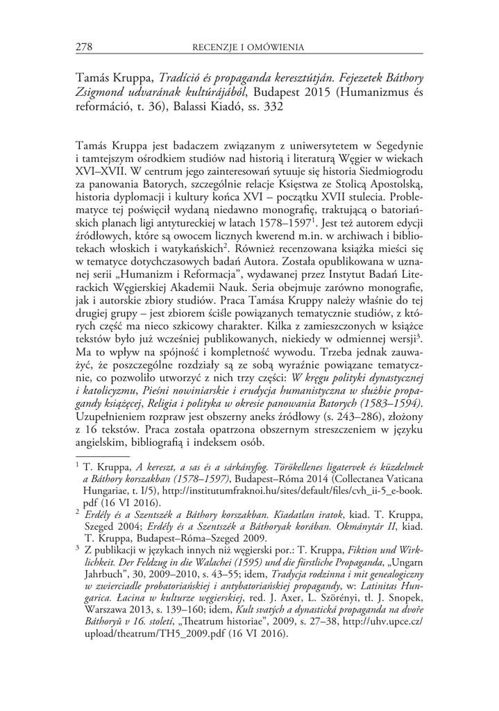 278 RECENZJE I OMÓWIENIA Tamás Kruppa, Tradíció és propaganda keresztútján. Fejezetek Báthory Zsigmond udvarának kultúrájából, Budapest 2015 (Humanizmus és reformáció, t. 36), Balassi Kiadó, ss. 332 Tamás Kruppa jest badaczem związanym z uniwersytetem w Segedynie i tamtejszym ośrodkiem studiów nad historią i literaturą Węgier w wiekach XVI–XVII. W centrum jego zainteresowań sytuuje się historia Siedmiogrodu za panowania Batorych, szczególnie relacje Księstwa ze Stolicą Apostolską, historia dyplomacji i kultury końca XVI – początku XVII stulecia. Problematyce tej poświęcił wydaną niedawno monografię, traktującą o batoriańskich planach ligi antytureckiej w latach 1578–15971. Jest też autorem edycji źródłowych, które są owocem licznych kwerend m.in. w archiwach i bibliotekach włoskich i watykańskich2. Również recenzowana książka mieści się w tematyce dotychczasowych badań Autora. Została opublikowana w uznanej serii „Humanizm i Reformacja”, wydawanej przez Instytut Badań Literackich Węgierskiej Akademii Nauk. Seria obejmuje zarówno monografie, jak i autorskie zbiory studiów. Praca Tamása Kruppy należy właśnie do tej drugiej grupy – jest zbiorem ściśle powiązanych tematycznie studiów, z których część ma nieco szkicowy charakter. Kilka z zamieszczonych w książce tekstów było już wcześniej publikowanych, niekiedy w odmiennej wersji3. Ma to wpływ na spójność i kompletność wywodu. Trzeba jednak zauważyć, że poszczególne rozdziały są ze sobą wyraźnie powiązane tematycznie, co pozwoliło utworzyć z nich trzy części: W kręgu polityki dynastycznej i katolicyzmu, Pieśni nowiniarskie i erudycja humanistyczna w służbie propagandy książęcej, Religia i polityka w okresie panowania Batorych (1583–1594). Uzupełnieniem rozpraw jest obszerny aneks źródłowy (s. 243–286), złożony z 16 tekstów. Praca została opatrzona obszernym streszczeniem w języku angielskim, bibliografią i indeksem osób. 1 T. Kruppa, A kereszt, a sas és a sárkányfog. Törökellenes ligatervek és küzdelmek a Báthory korszakban (1578–1597), Budapest–Róma 2014 (Collectanea Vaticana Hungariae, t. I/5), http://institutumfraknoi.hu/sites/default/files/cvh_ii-5_e-book. pdf (16 VI 2016). 2 Erdély és a Szentszék a Báthory korszakban. Kiadatlan iratok, kiad. T. Kruppa, Szeged 2004; Erdély és a Szentszék a Báthoryak korában. Okmánytár II, kiad. T. Kruppa, Budapest–Róma–Szeged 2009. 3 Z publikacji w językach innych niż węgierski por.: T. Kruppa, Fiktion und Wirk lichkeit. Der Feldzug in die Walachei (1595) und die fürstliche Propaganda, „Ungarn Jahrbuch”, 30, 2009–2010, s. 43–55; idem, Tradycja rodzinna i mit genealogiczny w zwierciadle probatoriańskiej i antybatoriańskiej propagandy, w: Latinitas Hungarica. Łacina w kulturze węgierskiej, red. J. Axer, L. Szörényi, tł. J. Snopek, Warszawa 2013, s. 139–160; idem, Kult svatých a dynastická propaganda na dvoře Báthoryů v 16. století, „Theatrum historiae”, 2009, s. 27–38, http://uhv.upce.cz/ upload/theatrum/TH5_2009.pdf (16 VI 2016). RECENZJE I OMÓWIENIA 279 We wstępie Autor dokonał przeglądu opinii historiografii o panowaniu Zygmunta Batorego. Jak stwierdził, na ocenie rządów tego władcy zaciążyły negatywne opinie historyków, począwszy od Istvána Szamosközyego, powtarzane w XIX i w pierwszej połowie XX w., szczególnie w historiografii protestanckiej. Wyjątek od tego podejścia stanowiły prace Endre Veressa, a następnie – po II wojnie światowej – rzymskie edycje źródłowe jezuity o. László Lukácsa, z których zresztą Autor obficie korzysta. Negatywne i stereotypowe oceny Zygmunta Batorego dotyczyły również całego rodu Batorych, wyjątkiem pozostał jedynie król Stefan Batory. Pomimo osiągnięć badawczych w ostatnich dekadach (m.in. szkoła segedyńska), wiele jest tematów nieopisanych w odniesieniu do okresu batoriańskiego w historii Siedmiogrodu. Celem, jaki postawił sobie Autor, było omówienie panowania Zygmunta Batorego z perspektywy historii kultury i historii idei. W praktyce koncentruje się przede wszystkim na latach 1587–1598, z wieloma odniesieniami do czasu rządów Stefana Batorego. Pierwsze cztery rozdziały recenzowanej książki dotyczą genezy, kształtowania się i funkcjonowania propagandowego wizerunku Zygmunta Batorego. Jako jego źródła Autor wskazuje zakorzeniony w tradycji węgierskiej kult władców i wodzów (św. Stefana, św. Władysława, Jana Hunyadyego, rozwijający się w połowie XVI w. „kult” Macieja Korwina), a także późnośredniowieczną duchowość franciszkańską (Osvát Laskai, Pelbárt Temes vári, Anonim Kartuski), która miała oddziaływać na wspierających księcia Zygmunta autorów jezuickich (Istvána Szantó, Jánosa Lelesziego) i stanowić tło ideologii batoriańskiej, przejawiającej się m.in. w pietas Bathoriana (rola kultu maryjnego, kult św. Jerzego, tradycja krucjatowa, patronat nad jezuitami i franciszkanami), idei wybraństwa i przedmurza, a także w retoryce patriotycznej. Ów rys pobożności szedł w parze z legendą rodową Batorych. Szczególne miejsce zajmował w niej etos rycerski: udział przodków w krucjacie za króla Andrzeja II, legendarna postać protoplasty Vida (Bátora) – pogromcy smoka czy też postaci dwóch Stefanów Batorych – poległego pod Warną królewskiego chorążego oraz wojewody siedmiogrodzkiego, zwycięzcy wojska osmańskiego w bitwie na Chlebowym Polu. Co znamienne, mimo częstych odwołań do Hunyadych – dodatkowo uargumentowanych faktem pochówku Jana Hunyadyego w katedrze w Alba Iulia – Batorowie nie wykorzystywali w propagandzie swego z nimi spokrewnienia. Zarówno Stefan Batory, jak i jego bratanek znajdowali się w sytuacji, w której musieli stawić czoła rozpowszechnionym w Europie negatywnym opiniom na swój temat i podjąć wysiłek w celu zmiany tych sądów.