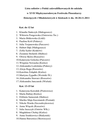 Lista solistów z Polski zakwalifikowanych do udziału w XVII Międzynarodowym Festiwalu Piosenkarzy Dziecięcych i Młodzieżowych w Kielcach w dn. 18-20.11.2011 Kat. do 12 lat 1. Klaudia Stańczyk (Małogoszcz) 2. Wiktoria Pongowska (Ostrowiec Św.) 3. Maria Bińkowska (Łódź) 4. Paulina Król (Puławy) 5. Julia Trojanowska (Parczew) 6. Hubert Bąk (Małogoszcz) 7. Zofia Sydor (Kraków) 8. Zuzanna Stolarek (Słubice) 9. Oliwia Skóra (Rzeszów) 10.Katarzyna Golecka (Parczew) 11.Wirginia Nowacka (Kielce) 12.Aleksandra Łodzińska (Puławy) 13.Alicja Rega (Rzeszów) 14.Karolina Żołądek (Kielce) 15.Martyna Zygadło (Woźniki Śl.) 16.Aleksandra Stawarz (Rzeszów) 17.Aleksandra Janczarek (Wieluń) Kat. 13-15 lat 1. Katarzyna Kawałek (Piotrowice) 2. Marta Rabiej (Kielce) 3. Elżbieta Samosiuk (Słubice) 4. Marika Maja Kaczmarek (Poznań) 5. Nikola Warda (Szczedrzykowice) 6. Anna Wiącek (Rzeszów) 7. Julia Jaszczyk (Ostrów Wlk.) 8. Magdalena Chołuj (Kielce) 9. Anna Szutkiewicz (Białystok) 10.Hanna Barsznica (Skoroszyce) Kat. 16-20 lat 1. Monika Malczak (Kazimierz Dolny) 2. Eliza Szyłow (Suwałki) 3. Daria Grabowska (Radziejów) 4. Kacper Andrzejewski (Łódź) 5. Filip Wnuk (Małogoszcz) 6. Katarzyna Laszkowska (Suwałki) 7. Monika Mioduszewska (Łódź) 8. Natalia Gadzina (Złocieniec) 9. Sylwia Zelek (Limanowa) 10.Natalia Młodzik (Radziejów) 11.Filip Rychcik (Zakroczym) 12.Ewelina Kisiel (Łódź) 13.Klaudia Ziobro (Wrocław) 14.Urszula Żukowska (Suwałki) 15.Bartłomiej Kawałek (Piotrowice) 16.Aneta Królak (Radziejów)