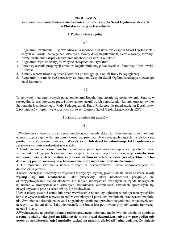 REGULAMIN zwolnień i usprawiedliwiania nieobecności uczniów Zespołu Szkół Ogólnokształcących w Płońsku na zajęciach szkolnych. I Postanowienia ogólne. §1 1. Regulamin zwalniania i usprawiedliwiania nieobecności uczniów Zespołu Szkół Ogólnokształcących w Płońsku na zajęciach szkolnych, zwany dalej Regulaminem, określa zasady, terminy i formę zwalniania i usprawiedliwiania nieobecności ucznia w szkole. 2. Regulamin wprowadzany jest w życie zarządzeniem Dyrektora. 3. Prawo zgłaszania propozycji zmian w Regulaminie mają: Nauczyciele, Samorząd Uczniowski i Rodzice. 4. Zmiany wprowadzane są przez Dyrektora po zasięgnięciu opinii Rady Pedagogicznej. 5. Regulamin nie może być sprzeczny ze Statutem Zespołu Szkół Ogólnokształcących, zwanego dalej Statutem. §2 W sprawach nieuregulowanych postanowieniami Regulaminu stosuje się postanowienia Statutu, w szczególności zaś dotyczące praw i obowiązków uczniów, ich nagradzania i karania oraz uprawnień Samorządu Uczniowskiego, Rady Pedagogicznej, Rady Rodziców do przedstawiania Dyrektorowi ZSO wniosków i opinii we wszystkich sprawach Zespołu Szkół Ogólnokształcących (ZSO). II. Zasady zwalniania uczniów §3 1.Wychowawca klasy, a w razie jego nieobecności wicedyrektor, lub dyrektor ma prawo zwolnić ucznia z części zajęć w danym dniu na osobistą, pisemną lub w sytuacjach nagłych na telefoniczną prośbę rodzica/opiekuna prawnego. Wicedyrektor lub dyrektor odnotowuje fakt zwolnienia w zeszycie zwolnień w sekretariacie szkoły. 2. Każde zwolnienie ucznia musi być odnotowane przez wychowawcę najszybciej, jak to możliwe, w dzienniku lekcyjnym. Na stronie monitorującej frekwencję wychowawca wpisuje - nieobecność usprawiedliwioną. Jeżeli w dniu zwolnienia wychowawca lub dyrektor (wicedyrektor) nie będzie o niej poinformowany, wychowawca nie może usprawiedliwić nieobecności. 3. Od momentu zwolnienia ucznia z zajęć za bezpieczeństwo ucznia odpowiada jego rodzic/opiekun prawny. 4.Jeżeli uczeń jest nieobecny na zajęciach z przyczyn wynikających z działalności na rzecz szkoły wpisuje się mu nieobecność. Jako przyczyny takiej nieobecności przyjmuje się: a) przygotowywanie się do akademii lub innych uroczystości szkolnych za zgodą nauczyciela b) udział w uroczystościach szkolnych, konkursach, olimpiadach, zawodach sportowych itp. c) wykonywanie prac na rzecz szkoły lub środowiska. Ucznia należy zwolnić ustnie lub przez wywieszenie na tablicy ogłoszeń w pokoju nauczycielskim kartki z wywieszeniem nazwisk uczniów zwalnianych i powodem zwolnienia oraz czasem zwolnienia. Zwolnienia dokonuje nauczyciel angażujący ucznia po uprzednim uzgodnieniu z nauczycielami uczącymi w danym dniu. Taka nieobecność nie brana jest pod uwagę przy obliczaniu frekwencji ucznia i klasy. 5.Wychowawca, na prośbę pisemną rodzica/prawnego opiekuna, może zwolnić ucznia do autobusu z ósmej godziny lekcyjnej na kilkanaście minut przed dzwonkiem jedynie w przypadku gdy uczeń po zakończeniu zajęć musiałby czekać na autobus dłużej niż jedną godzinę. Zwolnienie to może dotyczyć całego okresu lub roku. Fakt ten wychowawca odnotowuje w dzienniku lekcyjnym, na stronach „Uwagi i spostrzeżenia…”, a zwolnienia przechowuje w dokumentacji wychowawcy. III Zasady usprawiedliwiania nieobecności. §4 1. Usprawiedliwienie nieobecności na zajęciach szkolnych uczniów w wieku do 18 lat musi być dokonywane wyłącznie w formie pisemnej przez rodziców. 2. Uczniowie pełnoletni mogą sami usprawiedliwiać swoją nieobecność w szkole w formie pisemnej z podaniem przyczyny nieobecności. 3. Jeśli okaże się, że usprawiedliwienie dostarczone przez ucznia wychowawcy jest niezgodne z prawdą, nauczyciel może odmówić usprawiedliwienia nieobecności na zajęciach. 4. Uczniowie dostarczający nieprawdziwe usprawiedliwienia ponoszą kary przewidziane w Statucie Szkoły. 5. Każda nieobecność jednogodzinna lub kilkugodzinna /niecałodniowa/ ucznia w szkole musi być poprzedzona telefonem od rodziców lub pisemnym oświadczeniem rodzica usprawiedliwiającym nieobecność. 6. Nieobecność automatycznie staje się nieusprawiedliwioną i jest traktowana jak wagary, jeśli uczeń samowolnie opuści szkołę bez pisemnego lub telefonicznego usprawiedliwienia (zwolnienia) w dniu nieobecności. Takiej nieobecności wychowawca nie może już usprawiedliwić. 7. W przypadku nieobecności ciągłej trwającej powyżej tygodnia wychowawca klasy zobowiązany jest skontaktować się telefonicznie z rodzicami/prawnymi opiekunami/ lub uczniem pełnoletnim i wyjaśnić zaistniałą sytuację. III Formy usprawiedliwiania nieobecności. §5 1. Usprawiedliwienie nieobecności ucznia na zajęciach musi mieć formę oświadczenia pisemnego. 2. W wyjątkowych sytuacjach /nagła choroba rodzica, opiekuna prawnego, zdarzenia losowe uniemożliwiające dostarczenie w terminie oświadczenia/ oświadczenie może zostać przekazane ustnie. 3. Oświadczenie musi zawierać: A. imię i nazwisko ucznia, B. numer klasy, do której uczęszcza, C. dzień /czas/ nieobecności, D. powód nieobecności, E. datę wystawienia, F. czytelny podpis osoby składającej oświadczenie. 2 IV Terminy usprawiedliwiania nieobecności §6 1. Oświadczenie na piśmie usprawiedliwiające nieobecność uczeń dostarcza wychowawcy klasy w ciągu tygodnia od powrotu do szkoły, nie później niż na pierwszej godzinie do dyspozycji wychowawcy. 2. Oświadczenia na piśmie usprawiedliwiające nieobecność ucznia w szkole dostarczone po terminie określonym powyżej nie są podstawą do usprawiedliwienia uczniowi nieobecności. IV Postanowienia końcowe §7 1. W przypadku dłuższej niż dwutygodniowa nieobecności w szkole /pobyt w sanatorium lub szpitalu/, ucznia obowiązują określone wyżej zasady usprawiedliwiania nieobecności. 2. Nieobecność, o której mowa w § 5. pkt. 1, odnotowuje się w dzienniku lekcyjnym, ale nie wp
