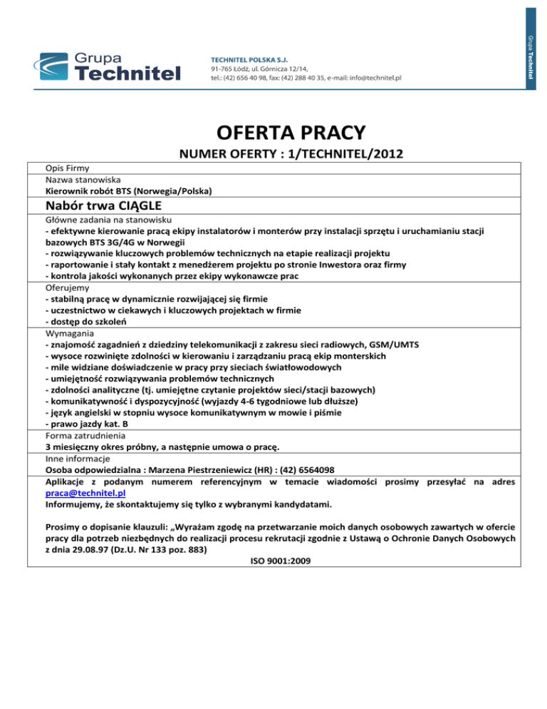 OFERTA PRACY NUMER OFERTY : 1/TECHNITEL/2012 Opis Firmy Nazwa stanowiska Kierownik robót BTS (Norwegia/Polska) Nabór trwa CIĄGLE Główne zadania na stanowisku - efektywne kierowanie pracą ekipy instalatorów i monterów przy instalacji sprzętu i uruchamianiu stacji bazowych BTS 3G/4G w Norwegii - rozwiązywanie kluczowych problemów technicznych na etapie realizacji projektu - raportowanie i stały kontakt z menedżerem projektu po stronie Inwestora oraz firmy - kontrola jakości wykonanych przez ekipy wykonawcze prac Oferujemy - stabilną pracę w dynamicznie rozwijającej się firmie - uczestnictwo w ciekawych i kluczowych projektach w firmie - dostęp do szkoleń Wymagania - znajomość zagadnień z dziedziny telekomunikacji z zakresu sieci radiowych, GSM/UMTS - wysoce rozwinięte zdolności w kierowaniu i zarządzaniu pracą ekip monterskich - mile widziane doświadczenie w pracy przy sieciach światłowodowych - umiejętność rozwiązywania problemów technicznych - zdolności analityczne (tj. umiejętne czytanie projektów sieci/stacji bazowych) - komunikatywność i dyspozycyjność (wyjazdy 4-6 tygodniowe lub dłuższe) - język angielski w stopniu wysoce komunikatywnym w mowie i piśmie - prawo jazdy kat. B Forma zatrudnienia 3 miesięczny okres próbny, a następnie umowa o pracę. Inne informacje Osoba odpowiedzialna : Marzena Piestrzeniewicz (HR) : (42) 6564098 Aplikacje z podanym numerem referencyjnym w temacie wiadomości prosimy przesyłać na adres [email protected] Informujemy, że skontaktujemy się tylko z wybranymi kandydatami. Prosimy o dopisanie klauzuli: „Wyrażam zgodę na przetwarzanie moich danych osobowych zawartych w ofercie pracy dla potrzeb niezbędnych do realizacji procesu rekrutacji zgodnie z Ustawą o Ochronie Danych Osobowych z dnia 29.08.97 (Dz.U. Nr 133 poz. 883) ISO 9001:2009