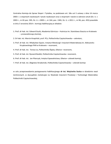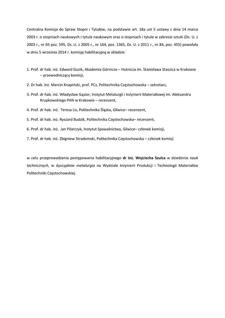 Centralna Komisja do Spraw Stopni i Tytułów, na podstawie art. 18a ust 5 ustawy z dnia 14 marca 2003 r. o stopniach naukowych i tytule naukowym oraz o stopniach i tytule w zakresie sztuki (Dz. U. z 2003 r., nr 65 poz. 595, Dz. U. z 2005 r., nr 164, poz. 1365, Dz. U. z 2011 r., nr 84, poz. 455) powołała w dniu 5 września 2014 r. komisję habilitacyjną w składzie: 1. Prof. dr hab. inż. Edward Guzik, Akademia Górniczo – Hutnicza im. Stanisława Staszica w Krakowie – przewodniczący komisji, 2. Dr hab. inż. Marcin Knapiński, prof. PCz, Politechnika Częstochowska – sekretarz, 3. Prof. dr hab. inż. Władysław Gąsior, Instytut Metalurgii i Inżynierii Materiałowej im. Aleksandra Krupkowskiego PAN w Krakowie – recenzent, 4. Prof. dr hab. inż. Teresa Lis, Politechnika Śląska, Gliwice– recenzent, 5. Prof. dr hab. inż. Ryszard Budzik, Politechnika Częstochowska– recenzent, 6. Prof. dr hab. inż. Jan Pilarczyk, Instytut Spawalnictwa, Gliwice– członek komisji, 7. Prof. dr hab. inż. Zbigniew Stradomski, Politechnika Częstochowska – członek komisji w celu przeprowadzenia postępowania habilitacyjnego dr inż. Wojciecha Szulca w dziedzinie nauk technicznych, w dyscyplinie metalurgia na Wydziale Inżynierii Produkcji i Technologii Materiałów Politechniki Częstochowskiej.