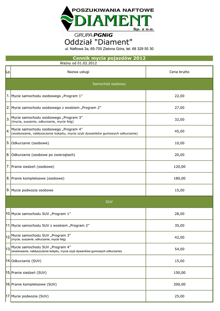 Oddział "Diament" ul. Naftowa 3a, 65-705 Zielona Góra, tel. 68 329 55 30 Cennik mycia pojazdów 2012 Ważny od 01.02.2012 Lp. Nazwa usługi Cena brutto Samochód osobowy 1. Mycie samochodu osobowego „Program 1” 22,00 2. Mycie samochodu osobowego z woskiem „Program 2” 27,00 3. 4. Mycie samochodu osobowego „Program 3” 32,00 (mycie, suszenie, odkurzanie, mycie felg) Mycie samochodu osobowego „Program 4” (woskowanie, nabłyszczenie kokpitu, mycie szyb dywaników gumowych odkurzanie) 45,00 5. Odkurzanie (osobowe) 10,00 6. Odkurzanie (osobowe po zwierzętach) 20,00 7. Pranie siedzeń (osobowe) 120,00 8. Pranie kompleksowe (osobowe) 180,00 9. Mycie podwozia osobowe 15,00 SUV 10. Mycie samochodu SUV „Program 1” 28,00 11. Mycie samochodu SUV z woskiem „Program 2” 35,00 12. 13. Mycie samochodu SUV „Program 3” (mycie, suszenie, odkurzanie, mycie felg) Mycie samochodu SUV „Program 4” (woskowanie, nabłyszczenie kokpitu, mycie szyb dywaników gumowych odkurzanie) 14. Odkurzanie (SUV) 42,00 54,00 15,00 15. Pranie siedzeń (SUV) 150,00 16. Pranie kompleksowe (SUV) 200,00 17. Mycie podwozia (SUV) 25,00 BUS 18. Mycie samochodu BUS „Program 1” 33,00 19. Mycie samochodu BUS z woskiem „Program 2” 40,00 20. 21. Mycie samochodu BUS „Program 3” 48,00 (mycie, suszenie, odkurzanie, mycie felg) Mycie samochodu BUS „Program 4” (woskowanie, nabłyszczenie kokpitu, mycie szyb dywaników gumowych odkurzanie) 22. Odkurzanie (BUS) 71,00 20,00 23. Pranie siedzeń (BUS) 200,00 24. Pranie kompleksowe (BUS) 250,00 25. Mycie podwozia (BUS) 30,00 Samochód ciężarowy 26. Mycie pojazdu ciężarowego z przyczepą 136,00 27. Mycie pojazdu ciężarowego skrzyniowego 110,00 28. Kosmetyka ciągnika siodłowego (np.: nabłyszczenie kokpitu, mycie szyb / dywaników gumowych) 29. Mycie ciągnika siodłowego Podstawowe 70,00 75,00 30. Mycie ciągnika siodłowego Kompleksowe 140,00 31. Pranie siedzeń (ciężarowe) 120,00 32. Pranie kompleksowe (ciężarowe) 180,00 33. Odkurzanie (ciężarowe) 20,00 34. Mycie podwozia ciężarowe 55,00 35. Mycie wywrotek 150,00 Sprzęt budowalny 36. Mycie sprzętu budowlanego gabarytowego 250,00 37. Ciągnik - traktor 130,00 38. Mycie walca 160,00 39. Mycie koparki kołowej 200,00 40. Mycie koparki gąsienicowej 240,00 41. Mycie spycharki 200,00 42. Mycie równiarki 160,00 Sprzęt specjalistyczny 43. Mycie dźwigu 190,00 44. Mycie sprzętu specjalistycznego 310,00 Dodatkowe usługi 45. Mycie okien wewnątrz 10,00 46. Czyszczenie plastików wewnątrz 10,00 47. Mycie przyczepki campingowej 50,00 48. Mycie przyczepki campingowej „Kompleksowe” * - cena może ulec zmianie w zależności od poziomu zabrudzenia i wielkości pojazdu. 100,00