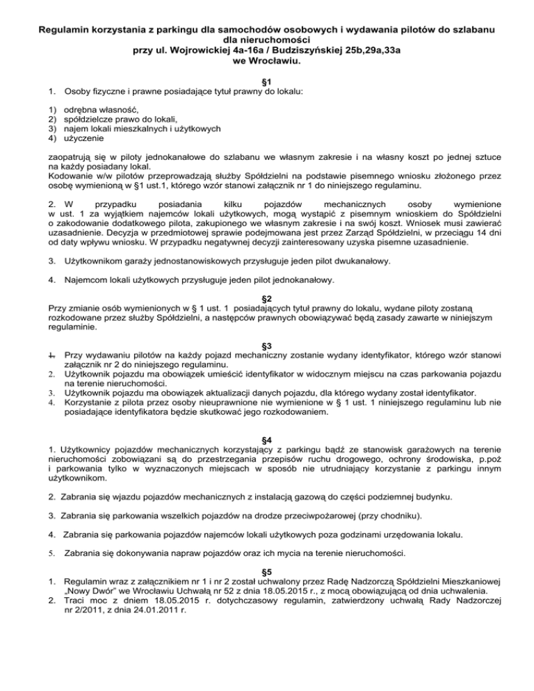 Regulamin korzystania z parkingu dla samochodów osobowych i wydawania pilotów do szlabanu dla nieruchomości przy ul. Wojrowickiej 4a-16a / Budziszyńskiej 25b,29a,33a we Wrocławiu. §1 1. Osoby fizyczne i prawne posiadające tytuł prawny do lokalu: 1) 2) 3) 4) odrębna własność, spółdzielcze prawo do lokali, najem lokali mieszkalnych i użytkowych użyczenie zaopatrują się w piloty jednokanałowe do szlabanu we własnym zakresie i na własny koszt po jednej sztuce na każdy posiadany lokal. Kodowanie w/w pilotów przeprowadzają służby Spółdzielni na podstawie pisemnego wniosku złożonego przez osobę wymienioną w §1 ust.1, którego wzór stanowi załącznik nr 1 do niniejszego regulaminu. 2. W przypadku posiadania kilku pojazdów mechanicznych osoby wymienione w ust. 1 za wyjątkiem najemców lokali użytkowych, mogą wystąpić z pisemnym wnioskiem do Spółdzielni o zakodowanie dodatkowego pilota, zakupionego we własnym zakresie i na swój koszt. Wniosek musi zawierać uzasadnienie. Decyzja w przedmiotowej sprawie podejmowana jest przez Zarząd Spółdzielni, w przeciągu 14 dni od daty wpływu wniosku. W przypadku negatywnej decyzji zainteresowany uzyska pisemne uzasadnienie. 3. Użytkownikom garaży jednostanowiskowych przysługuje jeden pilot dwukanałowy. 4. Najemcom lokali użytkowych przysługuje jeden pilot jednokanałowy. §2 Przy zmianie osób wymienionych w § 1 ust. 1 posiadających tytuł prawny do lokalu, wydane piloty zostaną rozkodowane przez służby Spółdzielni, a następców prawnych obowiązywać będą zasady zawarte w niniejszym regulaminie. 1. 2. 3. 4. §3 Przy wydawaniu pilotów na każdy pojazd mechaniczny zostanie wydany identyfikator, którego wzór stanowi załącznik nr 2 do niniejszego regulaminu. Użytkownik pojazdu ma obowiązek umieścić identyfikator w widocznym miejscu na czas parkowania pojazdu na terenie nieruchomości. Użytkownik pojazdu ma obowiązek aktualizacji danych pojazdu, dla którego wydany został identyfikator. Korzystanie z pilota przez osoby nieuprawnione nie wymienione w § 1 ust. 1 niniejszego regulaminu lub nie posiadające identyfikatora będzie skutkować jego rozkodowaniem. §4 1. Użytkownicy pojazdów mechanicznych korzystający z parkingu bądź ze stanowisk garażowych na terenie nieruchomości zobowiązani są do przestrzegania przepisów ruchu drogowego, ochrony środowiska, p.poż i parkowania tylko w wyznaczonych miejscach w sposób nie utrudniający korzystanie z parkingu innym użytkownikom. 2. Zabrania się wjazdu pojazdów mechanicznych z instalacją gazową do części podziemnej budynku. 3. Zabrania się parkowania wszelkich pojazdów na drodze przeciwpożarowej (przy chodniku). 4. Zabrania się parkowania pojazdów najemców lokali użytkowych poza godzinami urzędowania lokalu. 5. Zabrania się dokonywania napraw pojazdów oraz ich mycia na terenie nieruchomości. §5 1. Regulamin wraz z załącznikiem nr 1 i nr 2 został uchwalony przez Radę Nadzorczą Spółdzielni Mieszkaniowej „Nowy Dwór” we Wrocławiu Uchwałą nr 52 z dnia 18.05.2015 r., z mocą obowiązującą od dnia uchwalenia. 2. Traci moc z dniem 18.05.2015 r. dotychczasowy regulamin, zatwierdzony uchwałą Rady Nadzorczej nr 2/2011, z dnia 24.01.2011 r. Załącznik nr 1 Wniosek o zakodowanie pilota ……………………………………………. (jednokanałowego bądź dwukanałowego )do szlabanu wjazdowego dla nieruchomości nr 40 1. Wnioskodawca – osoba fizyczna i prawna posiadająca tytuł prawny do lokalu / lokali podać tytuł/ tytuły (np. : prawo odrębnej własności lokalu*, spółdzielcze własnościowe prawo do lokalu, spółdzielcze lokatorskie prawo do lokalu, najem, użyczenie): ………………………………………………………………………………………………………………………………………………..…….………………… …..…………..………………………………………………………………………………………….…………………………………………………...……… ………………………………………………………………………………………………..………………………….............................................. 1) Imię i Nazwisko ……………………………………………………………………………………. 2) Adres zameldowania: 3) ul. ………………………………………………………………………………………….……………. 4) Kod pocztowy …………..…………………………… 5) Adres do korespondencji: ul. ………………………………………………………………………………………….……………. 6) Kod pocztowy …………..…………………………. 7) Marka pojazdu ……………………………….…………………………………….……………… 8) Nr rejestracyjny …………………………………………………………..………………………. Wrocław, dnia………………………………… Podpis wnioskodawcy ……………………………. 2. Decyzja Zarządu Spółdzielni Mieszkaniowej „Nowy Dwór”: 1) Zarząd Spółdzielni Mieszkaniowej „Nowy Dwór” w dniu …………….…………..,wyraża zgodę na zakodowanie pilota ……………………………….. oraz wjazd i parkowanie pojazdu mechanicznego ‐ marki …………………………………………………………………, nr rejestracyjny …………………………, na parkingu przynależnym do nieruchomości nr 40 przy ul. Wojrowickiej 4a‐16a/Budziszyńskiej 25b,29a,33a we Wrocławiu. 2) Numer zezwolenia …………………( wpisują służby Spółdzielni) 3) Kod pilota …………………………………………………………..…………………………….………………… ( wpisują służby Spółdzielni) …………