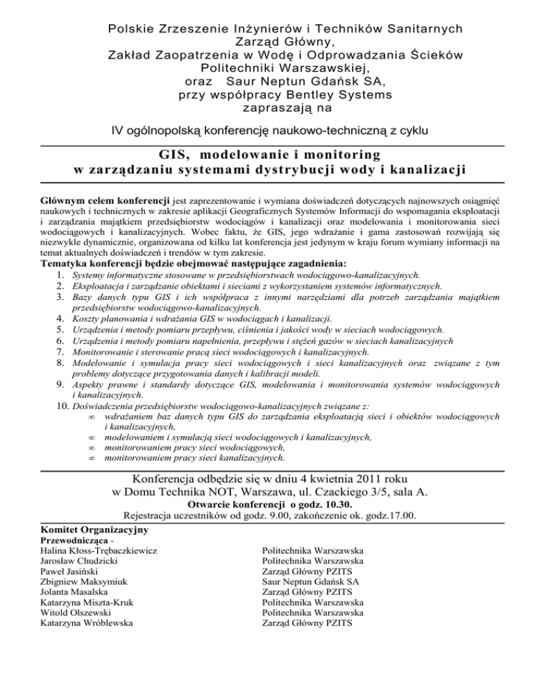 Polskie Zrzeszenie InŜynierów i Techników Sanitarnych Zarząd Główny, Zakład Zaopatrzenia w Wodę i Odprowadzania Ścieków Politechniki Warszawskiej, oraz Saur Neptun Gdańsk SA, przy współpracy Bentley Systems zapraszają na IV ogólnopolską konferencję naukowo-techniczną z cyklu GIS, modelowanie i monitoring w zarządzaniu systemami dystrybucji wody i kanalizacji Głównym celem konferencji jest zaprezentowanie i wymiana doświadczeń dotyczących najnowszych osiągnięć naukowych i technicznych w zakresie aplikacji Geograficznych Systemów Informacji do wspomagania eksploatacji i zarządzania majątkiem przedsiębiorstw wodociągów i kanalizacji oraz modelowania i monitorowania sieci wodociągowych i kanalizacyjnych. Wobec faktu, Ŝe GIS, jego wdraŜanie i gama zastosowań rozwijają się niezwykle dynamicznie, organizowana od kilku lat konferencja jest jedynym w kraju forum wymiany informacji na temat aktualnych doświadczeń i trendów w tym zakresie. Tematyka konferencji będzie obejmować następujące zagadnienia: 1. Systemy informatyczne stosowane w przedsiębiorstwach wodociągowo-kanalizacyjnych. 2. Eksploatacja i zarządzanie obiektami i sieciami z wykorzystaniem systemów informatycznych. 3. Bazy danych typu GIS i ich współpraca z innymi narzędziami dla potrzeb zarządzania majątkiem przedsiębiorstw wodociągowo-kanalizacyjnych. 4. Koszty planowania i wdraŜania GIS w wodociągach i kanalizacji. 5. Urządzenia i metody pomiaru przepływu, ciśnienia i jakości wody w sieciach wodociągowych. 6. Urządzenia i metody pomiaru napełnienia, przepływu i stęŜeń gazów w sieciach kanalizacyjnych 7. Monitorowanie i sterowanie pracą sieci wodociągowych i kanalizacyjnych. 8. Modelowanie i symulacja pracy sieci wodociągowych i sieci kanalizacyjnych oraz związane z tym problemy dotyczące przygotowania danych i kalibracji modeli. 9. Aspekty prawne i standardy dotyczące GIS, modelowania i monitorowania systemów wodociągowych i kanalizacyjnych. 10. Doświadczenia przedsiębiorstw wodociągowo-kanalizacyjnych związane z: • wdraŜaniem baz danych typu GIS do zarządzania eksploatacją sieci i obiektów wodociągowych i kanalizacyjnych, • modelowaniem i symulacją sieci wodociągowych i kanalizacyjnych, • monitorowaniem pracy sieci wodociągowych, • monitorowaniem pracy sieci kanalizacyjnych. Konferencja odbędzie się w dniu 4 kwietnia 2011 roku w Domu Technika NOT, Warszawa, ul. Czackiego 3/5, sala A. Otwarcie konferencji o godz. 10.30. Rejestracja uczestników od godz. 9.00, zakończenie ok. godz.17.00. Komitet Organizacyjny Przewodnicząca Halina Kłoss-Trębaczkiewicz Jarosław Chudzicki Paweł Jasiński Zbigniew Maksymiuk Jolanta Masalska Katarzyna Miszta-Kruk Witold Olszewski Katarzyna Wróblewska Politechnika Warszawska Politechnika Warszawska Zarząd Główny PZITS Saur Neptun Gdańsk SA Zarząd Główny PZITS Politechnika Warszawska Politechnika Warszawska Zarząd Główny PZITS Komitet Naukowy Przewodniczący Prof. dr hab. inŜ. Marian Kwietniewski Dr inŜ. Henryk Bylka Prof. dr hab. inŜ. Wojciech Dąbrowski Dr inŜ. Maciej Grzenda Prof. dr hab. inŜ. Zbigniew Heidrich Prof. dr hab. inŜ. Krzysztof Knapik Prof. dr hab. inŜ. Andrzej Królikowski Prof. dr hab. inŜ. Karol Kuś Prof. dr hab. inŜ. Janusz Łomotowski Dr inŜ. ElŜbieta Osuch-Pajdzińska Prof. dr hab. inŜ. Zbigniew Siwoń Prof. nzw. dr hab. inŜ. Andrzej Urbaniak Prof. nzw. dr hab. Marek Zawilski Politechnika Warszawska Politechnika Poznańska Politechnika Krakowska Politechnika Warszawska Politechnika Warszawska Politechnika Krakowska Politechnika Krakowska Politechnika Śląska Uniwersytet Przyrodniczy we Wrocławiu Politechnika Warszawska Politechnika Wrocławska Politechnika Poznańska Politechnika Łódzka Wymagania dotyczące referatów: 1. Tytuł referatu z krótkim streszczeniem w języku polskim (do 0,5 strony A4) i adresami autorów prosimy przesłać do dnia 01.02.2011r. 2. Po uzyskaniu akceptacji Komitetu Naukowego konferencji (do 10.02.2011r.) pełny tekst referatu naleŜy przesyłać do dnia 20.03.2011 r. na adres e-mail: [email protected] Sposób przygotowania referatu: • tekst w formacie DOC (MS Word) z odstępem między wierszami 1 • zdjęcia i rysunki w formacie JPG lub TIF (rozdzielczość min. 300 dpi) wskazane jest załączenie rysunków i zdjęć w oddzielnych (zewnętrznych) plikach • objętość artykułu do 12 stron A-4 • tytuł i streszczenie artykułu w języku polskim i angielskim • autor referatu jest zwolniony z kosztów uczestnictwa w konferencji – w przypadku kilku autorów, zwolnienie dotyczy jednej osoby. Referaty po pozytywnych recenzjach będą opublikowane w formie ksiąŜkowej. Przewidujemy równieŜ opublikowanie wybranych referatów wyróŜnionych przez recenzentów w czasopiśmie punktowanym z listy MNiSW. Opłata za udział 1 osoby w konferencji wynosi 395 zł + 23 % VAT, dla członków PZITS 350 zł + 23 % VAT i dla studentów 100 zł + 23 % VAT. Na opłatę składają się koszty organizacji konferencji, materiałów konferencyjnych w formie ksiąŜkowej, poczęstunku w trakcie obrad oraz obiadu. Opłata za udział w konferencji nie obejmuje kosztów dojazdów oraz noclegów. Opłatę prosimy przekazać na konto bankowe Zarządu Głównego PZITS – konto – Millennium Bank SA nr 42116022020000000028827575 z dopiskiem na przelewie „GIS 2011” Prosimy o potwierdzenie uczestnictwa przesyłając pocztą na adres Komitetu Organizacyjnego - ZG PZITS, ul. Czackiego 3/5, 00-043 Warszawa, faksem na nr 22 826-28-94 lub e-mailem na adres [email protected], [email protected] – wypełnioną KARTĘ ZGŁOSZENIA UCZESTNICTWA, której formularz załączamy. Prosimy równieŜ o dołączenie kopii dowodu wpłaty na nasze konto bankowe. Informacje dodatkowe • Konferencji towarzyszyć będzie wystawa tematyczna. • W załączeniu przesyłamy Kartę Zgłoszenia Uczestnictwa w konferencji zawierającą informację na temat • • waru