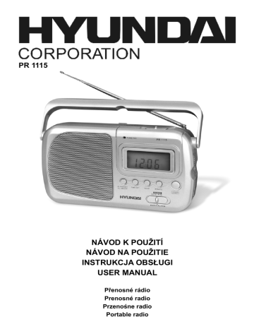 PR 1115 NÁVOD K POUŽITÍ NÁVOD NA POUŽITIE INSTRUKCJA OBSŁUGI USER MANUAL Přenosné rádio Prenosné radio Przenośne radio Portable radio POPIS 1. Přepínač Rádio/Alarm a vypínač Zap./Vyp. 2. Číselná stupnice 3. LCD indikátor 4. TELESKOPICKÁ anténa 5. Zdířka pro SLUCHÁTKA 6. Ovládací prvek Nastavení alarmu zap./vyp. 7. Ovládací prvek Nastavení času 8. Ovládací prvek Hodiny 9. Ovládací prvek Minuty 10. Ovládací prvek Osvětlení 11. Ovládací prvek HLASITOST 12. Přepínač PÁSMO 13. Ovládací prvek pro ladění 14. Ovládací prvek pro jemné ladění 15. Prostor pro baterie 16. Rukojeť NAPÁJENÍ 1. Zapojte síťovou napájecí šňůru, která je součástí dodávky, do zásuvky AC POWER na zadní straně přístroje. Druhý konec síťové napájecí šňůry zapojte do síťové zásuvky a zapněte přívod střídavého napájecího napětí do této zásuvky. Parametry napětí v síťové zásuvce musí odpovídat požadavkům přístroje. 2. Před odpojením napájecí šňůry od přístroje vždy vytáhněte napájecí šňůru ze síťové zásuvky. 3. Pokud přístroj nepoužíváte, vytáhněte napájecí šňůru ze zásuvky. PROVOZ NA BATERIE 1. Otevřete kryt prostoru pro baterie a vložte do něj 4 baterie UM-3 (články AA/R6 nebo podob- ného typu); dbejte na dodržení správné polarity, která je vyznačena v prostoru pro baterie. 2. Pokud nebudete přístroj delší dobu používat, vytáhněte z něj baterie. 3. Vybité baterie nenechávejte v přístroji - mohlo by dojít k úniku elektrolytu. 4. Pokud má být přístroj napájen z baterií, vytáhněte napájecí šňůru ze síťové zásuvky. Po při pojení napájecí šňůry do síťové zásuvky je napájení z baterií automaticky odpojeno. OVLÁDÁNÍ RÁDIA - Nastavte vypínač Zap./Vyp. do polohy „ON“. - Pomocí přepínače PÁSMO vyberte požadované frekvenční pásmo. - Pomocí ovládacího prvku pro ladění nalaďte požadovanou rozhlasovou stanici. - Pomocí ovládacího prvku pro jemné ladění můžete stanici jemně doladit. - Nastavte hlasitost pomocí ovládacího prvku Hlasitost. - Pokud chcete rádio vypnout, nastavte vypínač Zap./Vyp. do polohy „OFF“. - Po naladění signálu FM se rozsvítí indikátor FM Mono. - Roztáhněte Teleskopickou anténu a nastavte ji do polohy, při které je příjem FM rádia nejlepší. CZ - 2 CZ OVLÁDÁNÍ HODIN - Za normálních okolností se na LCD displeji zobrazuje čas ve formě hodin a minut. - Současným stiskem tlačítek Nastavení času a Hodiny můžete nastavit požadovaný počet hodin. - Současným stiskem tlačítek Nastavení času a Minuty můžete nastavit požadovaný počet minut. BUDÍK - Pokud stisknete tlačítko Nastavení alarmu, zobrazí se na displeji ikona, která indikuje zapnutí alarmu. Po dalším stisku tohoto tlačítka tato ikona zmizí, což znamená, že alarm je vypnutý. - Po stisknutí a podržení tlačítka Nastavení alarmu se na LCD displeji zobrazí nastavený čas alarmu. - Současným stiskem tlačítek Nastavení alarmu a Hodiny můžete nastavit požadovaný počet hodin pro alarm. - Současným stiskem tlačítek Nastavení času a Minuty můžete nastavit požadovaný počet minut pro alarm. SLUCHÁTKA Zástrčka sluchátek by měla mít průměr 3,5 mm; připojte tuto zástrčku do zdířky SLUCHÁTKA (3). Po připojení sluchátek se automaticky odpojí reproduktory. VAROVÁNÍ Pokud přístroj nepoužíváte, odpojte jej vytažením síťové šňůry ze zásuvky. Nevystavujte se nebezpečí zasažení elektrickým proudem, které hrozí v případě demontáže krytu přístroje. Uvnitř přístroje nejsou žádné součásti, které byste mohli sami opravit. Abyste předešli nebezpečí vzniku požáru nebo zasažení elektrickým proudem, nevystavujte přístroj dešti ani vlhkosti. Neponořujte přístroj do vody ani jiné tekutiny. Nepoužívejte přístroj v případě, že je poškozena síťová napájecí šňůra. Výměnu napájecí šňůry musí provést výrobce nebo osoba, kterou výrobce k provedení tohoto úkonu autorizoval. VAROVÁNÍ - ODKAPÁVAJÍCÍ VODA / VENTILACE Tento výrobek nesmí přijít do styku s odkapávající nebo stříkající vodou. Nestavte na přístroj žádné předměty naplněné vodou (např. vázy, atd.). Je zakázáno jakýmkoliv způsobem vyřazovat z činnosti normální ventilaci přístroje. Symbol blesku varuje uživatele před přítomností neizolovaného nebezpečného napětí pod krytem výrobku, které je dostatečně velké na to, aby pro člověka představovalo riziko úrazu elektrickým proudem. Symbol vykřičníku upozorňuje uživatele na důležité provozní pokyny . Abyste snížili riziko úrazu elektrickým proudem, neotvírejte kryt. Přenechejte servis kvalifikovaném servisnímu personál. CZ - 3 POZNÁMKA: Změna technických specifikací vyhrazena bez upozornění. Informace o ochraně životního prostředí Udělali jsme to nejlepší pro snížení množství obalů a zajistili jsme jejich snadné rozdělení na 3 materiály: lepenka, papírová drť a roztažený polyetylén. Tento přístroj obsahuje materiály, které mohou být po demontáži specializovanou společností recyklovány. Dodržujte prosím místní nařízení týkající se nakládání s balícími materiály, vybitými bateriemi a starým zařízením. Likvidace starého elektrického a elektronického zařízení Tento symbol na výrobku, jeho příslušenství nebo na jeho obalu označuje, že s výrobkem nesmí být nakládáno jako s domácím odpadem. Prosím dopravte tento výrobek na příslušné sběrné místo, kde bude provedena recyklace takového elektrického a elektronického zařízení. V Evropské unii a v ostatních evropských zemích existují sběrná místa pro použité elektrické a elektronické zařízení. Tím, že zajistíte správnou likvidaci výrobku, můžete před