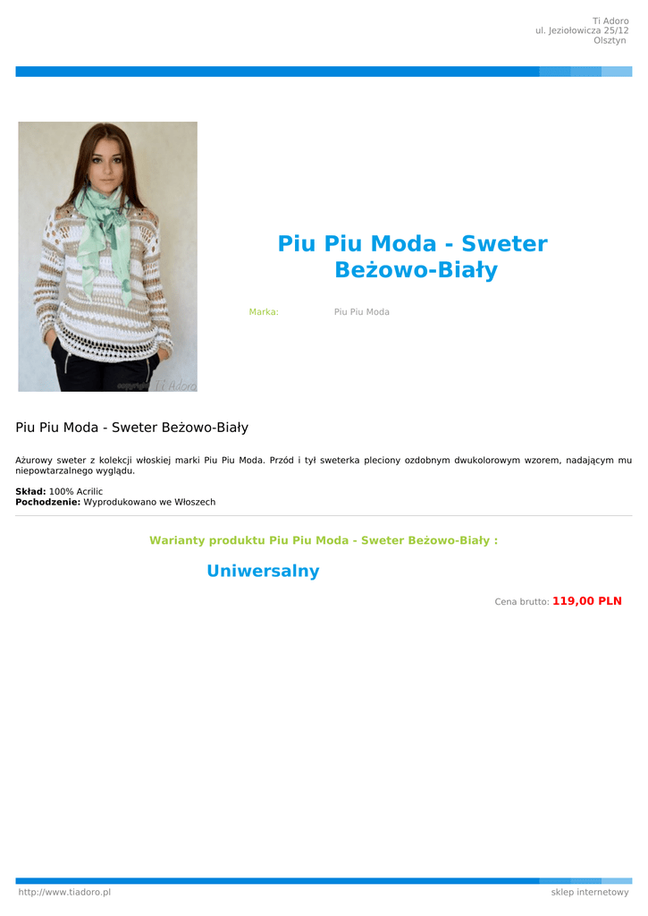 Ti Adoro ul. Jeziołowicza 25/12 Olsztyn Piu Piu Moda - Sweter Beżowo-Biały Marka: Piu Piu Moda Piu Piu Moda - Sweter Beżowo-Biały Ażurowy sweter z kolekcji włoskiej marki Piu Piu Moda. Przód i tył sweterka pleciony ozdobnym dwukolorowym wzorem, nadającym mu niepowtarzalnego wyglądu. Skład: 100% Acrilic Pochodzenie: Wyprodukowano we Włoszech Warianty produktu Piu Piu Moda - Sweter Beżowo-Biały : Uniwersalny Cena brutto: http://www.tiadoro.pl 119,00 PLN sklep internetowy