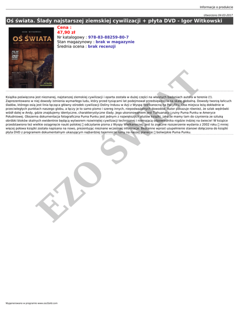 Informacje o produkcie Utworzono 04-03-2017 Oś świata. Ślady najstarszej ziemskiej cywilizacji + płyta DVD - Igor Witkowski Cena : 47,90 zł IA T Nr katalogowy : 978-83-88259-80-7 Stan magazynowy : brak w magazynie Średnia ocena : brak recenzji EZ O ŚW Książka poświęcona jest nieznanej, najstarszej ziemskiej cywilizacji i oparta została w dużej części na własnych badaniach autora w terenie (!). Zaprezentowano w niej dowody istnienia wymarłego ludu, który przed tysiącami lat podejmował przedsięwzięcia na skalę globalną. Dowody tworzą łańcuch śladów, którego osią jest linia łącząca główny ośrodek cywilizacji Doliny Indusu w Azji z Wyspą Wielkanocną na Pacyfiku. Oba miejsca leżą dokładnie w przeciwległych punktach naszego globu, a łączy je to samo pismo i szereg innych, niepodważalnych dowodów. Autor pokazuje również, że szlak wędrówki wiódł dalej w Andy, gdzie znajdujemy identyczne, charakterystyczne ślady. Jego ukoronowaniem jest Tiahuanaco i ruiny Puma Punku w Ameryce Południowej. Obszerna dokumentacja fotograficzna Puma Punku jest jednym z największych atutów książki, jako że mamy tam do czynienia ze sztuką obróbki bloków skalnych ewidentnie będącą wytworem rozwiniętej cywilizacji technicznej i niemającą odpowiednika nigdzie indziej na świecie! W książce przedstawiono też wielkie osiągnięcie nauki polskiej odczytanie pisma z Wyspy Wielkanocnej. Jest to znaczne rozszerzenie wydania z 2002 roku mniej więcej połowa książki została napisana na nowo, prezentując nieznane wcześniej informacje. Bezcenne wprost uzupełnienie stanowi dołączona do książki płyta DVD z programem dokumentalnym ukazującym najbardziej tajemnicze ruiny na naszej planecie boliwijskie Puma Punku. Wygenerowano w programie www.oscGold.com