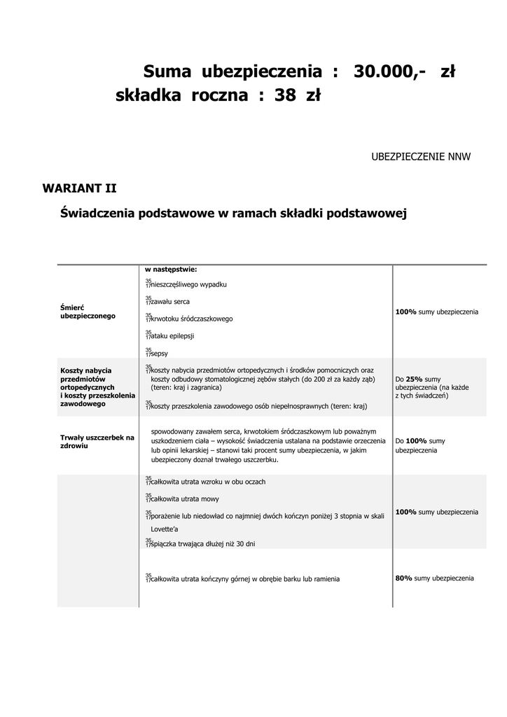 Suma ubezpieczenia : 30.000,- zł składka roczna : 38 zł UBEZPIECZENIE NNW WARIANT II Świadczenia podstawowe w ramach składki podstawowej w następstwie: nieszczęśliwego wypadku Śmierć ubezpieczonego zawału serca krwotoku śródczaszkowego 100% sumy ubezpieczenia ataku epilepsji sepsy Koszty nabycia przedmiotów ortopedycznych i koszty przeszkolenia zawodowego Trwały uszczerbek na zdrowiu koszty nabycia przedmiotów ortopedycznych i środków pomocniczych oraz koszty odbudowy stomatologicznej zębów stałych (do 200 zł za każdy ząb) (teren: kraj i zagranica) koszty przeszkolenia zawodowego osób niepełnosprawnych (teren: kraj) spowodowany zawałem serca, krwotokiem śródczaszkowym lub poważnym uszkodzeniem ciała – wysokość świadczenia ustalana na podstawie orzeczenia lub opinii lekarskiej – stanowi taki procent sumy ubezpieczenia, w jakim ubezpieczony doznał trwałego uszczerbku. Do 25% sumy ubezpieczenia (na każde z tych świadczeń) Do 100% sumy ubezpieczenia całkowita utrata wzroku w obu oczach całkowita utrata mowy porażenie lub niedowład co najmniej dwóch kończyn poniżej 3 stopnia w skali 100% sumy ubezpieczenia Lovette’a śpiączka trwająca dłużej niż 30 dni całkowita utrata kończyny górnej w obrębie barku lub ramienia 80% sumy ubezpieczenia całkowita utrata kończyny dolnej w obrębie stawu biodrowego lub kości udowej 75% sumy ubezpieczenia całkowita utrata obu nerek całkowita utrata kończyny górnej w obrębie łokcia lub przedramienia Trwałe uszkodzenie ciała całkowita utrata kończyny dolnej w obrębie stawu kolanowego, podudzia lub 60% sumy ubezpieczenia stawów skokowych całkowita utrata ręki całkowita utrata wzroku w jednym oku 50% sumy ubezpieczenia całkowita utrata słuchu w obu uszach całkowita utrata stopy całkowita utrata macicy 40% sumy ubezpieczenia całkowita utrata jednej nerki 35% sumy ubezpieczenia całkowita utrata słuchu w jednym uchu 30% sumy ubezpieczenia całkowita utrata kciuka 22% sumy ubezpieczenia całkowita utrata jajnika lub jądra całkowita utrata śledziony 20% sumy ubezpieczenia całkowita utrata nosa całkowita utrata palucha całkowita utrata małżowiny usznej 15% sumy ubezpieczenia Trwałe uszkodzenie ciała całkowita utrata palców ręki: II, III, IV, V 8% – za każdy palec całkowita utrata palców stopy: II, III, IV, V 3% – za każdy palec w przypadku utraty do 9 zębów stałych 2% – za każdy utracony ząb stały za wszystkie utracone zęby stałe – w przypadku utraty powyżej 20% sumy ubezpieczenia 9 zębów stałych złamania w obrębie kręgosłupa – dotyczy trzonów, łuków kręgów (z wyłączeniem kości ogonowej) 11% sumy ubezpieczenia za każdy krąg złamania kości udowej niestabilne złamania miednicy 10% sumy ubezpieczenia zwichnięcie stawu biodrowego złamania kości ramiennej zwichnięcie stawu barkowego 7% sumy ubezpieczenia złamania w obrębie kości podudzia (jednej lub obu) złamania kości sklepienia i podstawy czaszki zwichnięcie w obrębie stawu łokciowego 5% sumy ubezpieczenia zwichnięcie stawu kolanowego (z wyłączeniem zwichnięcia rzepki) złamania łopatki, obojczyka, mostka – za każdą kość stabilne złamania miednicy Złamania kości lub zwichnięcia stawów zwichnięcie w stawach skokowych złamania w obrębie stopy z wyłączeniem kości palców złamania rzepki złamania w obrębie kości przedramienia (jednej lub obu) 4,5% sumy ubezpieczenia 4% sumy ubezpieczenia złamania kości twarzoczaszki złamania kości ogonowej 3,5% sumy ubezpieczenia złamania w obrębie kości ręki z wyłączeniem kości palców złamania w obrębie kciuka 3% sumy ubezpieczenia zwichnięcie kciuka złamania w obrębie kręgosłupa – dotyczy wyrostków poprzecznych, kolczystych kręgów – za każdy krąg złamanie w obrębie palucha 2,5% sumy ubezpieczenia (na każde z tych świadczeń) złamania w obrębie kości palców ręki: II–V zwichnięcia stawów w obrębie palców ręki: II–V 2% sumy ubezpieczenia za każdy palec złamania w obrębie kości palców stopy: II–V złamanie zęba stałego, w przypadku złamania do 9 zębów stałych 0,5% sumy ubezpieczenia za każdy złamany ząb stały za wszystkie złamane zęby stałe, w przypadku złamania powyżej 9 zębów 5% sumy ubezpieczenia stałych • w przypadku operacyjnego leczenia złamania lub zwichnięcia dodatkowe świadczenie w wysokości Oparzenia lub odmrożenia oparzenie II st. oparzenie III st. 2% sumy ubezpieczenia – powyżej 30% powierzchni ciała – powyżej 10% powierzchni ciała 20% sumy ubezpieczenia oparzenie dróg oddechowych leczone w szpitalu oparzenie III st. – powyżej 5% do 10% powierzchni ciała 10% sumy ubezpieczenia oparzenie II st. – powyżej 15% do 30% powierzchni ciała 7% sumy ubezpieczenia odmrożenie II st. albo wyższy – więcej niż jednego palca ręki lub palca stopy, Oparzenia lub odmrożenia odmrożenie nosa lub ucha oparzenie II st. powyżej 1% do 15% powierzchni ciała 4% sumy ubezpieczenia oparzenie III st. do 5% powierzchni ciała odmrożenie II st. albo wyższy – jednego palca ręki lub palca stopy oparzenie II st. Do 1% powierzchni ciała Wstrząśnienia lub podejrzenia wstrząśnienia mózgu Pogryzienia, pokąsania, ukąszenia (wymagające hospitalizacji) 2 dni hospitalizacji 1% sumy ubezpieczenia 3 dni hospitalizacji 2% sumy ubezpieczenia 4 dni hospitalizacji 3% sumy ubezpieczenia pogryzienia przez psa pokąsania przez inne zwierzęta 10% sumy ubezpieczenia ukąszenia przez owady zatrucie gazami, substancjami i produktami chemicznymi, porażenie prądem, piorunem, które to stany wymagały hospitalizacji Brak trwałego uszczerbku na zdrowiu 1,5% sumy ubezpieczenia 5% sumy ubezpieczenia lub następstwo urazów ciała następstwo urazów ciała z jednego nieszczęśliwego wypadku lub zdarzenia objętego umową ubezpieczenia, które wymagało interwencji lekarskiej w placówce medycznej połączonej z dalszym leczeniem i wymagającej co n