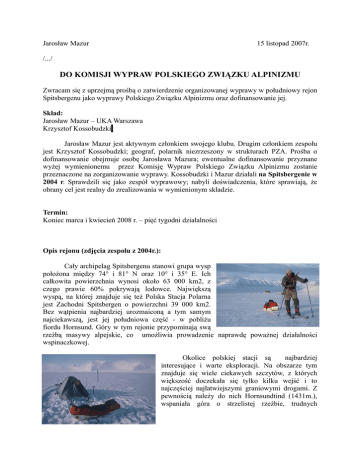 Jarosław Mazur 15 listopad 2007r. /.../ DO KOMISJI WYPRAW POLSKIEGO ZWIĄZKU ALPINIZMU Zwracam się z uprzejmą prośbą o zatwierdzenie organizowanej wyprawy w południowy rejon Spitsbergenu jako wyprawy Polskiego Związku Alpinizmu oraz dofinansowanie jej. Skład: Jarosław Mazur – UKA Warszawa Krzysztof Kossobudzki Jarosław Mazur jest aktywnym członkiem swojego klubu. Drugim członkiem zespołu jest Krzysztof Kossobudzki; geograf, polarnik niezrzeszony w strukturach PZA. Prośba o dofinansowanie obejmuje osobę Jarosława Mazura; ewentualne dofinansowanie przyznane wyżej wymienionemu przez Komisję Wypraw Polskiego Związku Alpinizmu zostanie przeznaczone na zorganizowanie wyprawy. Kossobudzki i Mazur działali na Spitsbergenie w 2004 r. Sprawdzili się jako zespół wyprawowy; nabyli doświadczenia, które sprawiają, że obrany cel jest realny do zrealizowania w wymienionym składzie. Termin: Koniec marca i kwiecień 2008 r. – pięć tygodni działalności Opis rejonu (zdjęcia zespołu z 2004r.): Cały archipelag Spitsbergenu stanowi grupa wysp położona między 74° i 81° N oraz 10° i 35° E. Ich całkowita powierzchnia wynosi około 63 000 km2, z czego prawie 60% pokrywają lodowce. Największą wyspą, na której znajduje się też Polska Stacja Polarna jest Zachodni Spitsbergen o powierzchni 39 000 km2. Bez wątpienia najbardziej urozmaiconą a tym samym najciekawszą, jest jej południowa część - w pobliżu fiordu Hornsund. Góry w tym rejonie przypominają swą rzeźbą masywy alpejskie, co umożliwia prowadzenie naprawdę poważnej działalności wspinaczkowej. Okolice polskiej stacji są najbardziej interesujące i warte eksploracji. Na obszarze tym znajduje się wiele ciekawych szczytów, z których większość doczekała się tylko kilku wejść i to najczęściej najłatwiejszymi graniowymi drogami. Z pewnością należy do nich Hornsundtind (1431m.), wspaniała góra o strzelistej rzeźbie, trudnych graniach i przeszło 1000 metrowej ścianie północnej, która według dostępnych informacji nie ma jeszcze ani jednego przejścia. Szczyt ten został po raz pierwszy zdobyty w roku 1938 przez Niemców, natomiast Polacy po raz pierwszy osiągnęli wierzchołek w roku 1958. W grupie tej był Andrzej Zawada, J. Piotrowski, R. Schramm. Jest to najwyższa góra w tej części wyspy, jednak trzeba pamiętać, iż okoliczne pasma często wypiętrzają się wprost z morza, co jeszcze bardziej podnosi ich atrakcyjność i sprawia, że przewyższenia są naprawdę duże, dając możliwość zrobienia konkretnych przejść. Poza Hornsundtindem z celów godnych polecenia, na pewno można wymienić Bautaen (483m.) będący pionowym monolitem, położonym w południowo-wschodniej części fiordu nad zatoką Brepollen; Gnalberget, 759 metrową ścianę wznoszącą się nad północnym brzegiem Hornsundu, w paśmie Sofiekammen, czy blisko 1000 metrową wschodnią ścianę Tindeggi. W pobliżu stacji polarnej z wartych zauważenia są rejony w masywie Sofiekammen z najwyższym wzniesieniem o wysokości 925m. Formalności: Ze wspinaniem w tym regionie wiąże się kilka formalności. Cały omawiany teren jest rezerwatem przyrody i na przebywanie w jego granicach oraz prowadzenie jakiejkolwiek działalności, potrzebna jest zgoda gubernatora wyspy. Nie uzyskamy jej jeśli nie przedstawimy ubezpieczenia, odpowiednich środków łączności, GPS-a oraz broni (gdyż Spitsbergen przez cały rok, a zimą i wiosną w szczególności, opanowany jest przez białe niedźwiedzie, które ludzi zbytnio się nie boją, wykazując przy tym zainteresowanie wszystkim, co ma związek z człowiekiem). Gdy spełnimy wszystkie te warunki nie będzie większych trudności z pozwoleniem, bo miejscowa administracja jest przychylna wszelkim wyprawom eksploratorskim, co wiąże się chyba z zamiłowaniem Norwegów do podobnych przedsięwzięć. Plan, cel wyjazdu: Wyprawa ma charakter rekonesansu i poczynienia rozpoznania przed wyprawą na północną ścianę Hornsuntindu. Plan obejmuje dojście na nartach z Longerbyern (stolica archipelagu) pod Hornsundtind, wejście na szczyt, obejście masywu, rozpoznanie drogi podejścia pod północną - dziewiczą ścianę oraz sporządzenie jej dokumentacji fotograficznej. Jednym słowem, po tej wyprawie mam zamiar zainteresować środowisko – znajomych ideą zdobycia północnej ściany. Żeby to było realne konieczna jest wyprawa rekonesansowa. Wiadomości, znane środowisku o Hornsundtindzie są zdawkowe; góra i jej północna ściana jawią się jako tajemniczy cel. Wiadomo, że prawie 200 kilometrowe dojście pod górę jest trudne oraz angażujące czasowo oraz, że najlepszy termin na działanie to kwiecień. To tyle. Na podstawie takich przesłanek żaden poważny zespół wspinaczkowy nie zaangażuje środków finansowych oraz czasu na wyprawę na ścianę, o której wiadomo tylko tyle, że jest do tej pory niezdobyta. Zebrane doświadczenia będą niezwykle pomocne przy zorganizowaniu wyprawy wspinaczkowej na północną ścianę w 2009 r. Podczas akcji wspinaczkowej liderem zespołu będzie Jarosław Mazur – poniżej częściowy wykaz przejść i wspinaczek: ALPY: Piz Badile – Nordkante IV 850 m, Mont Blanc du Tacul – Filar Gervasuttiego 800 m, Blatier – Diamenty Prezydenta (?), Grand Charmoz - Droga Mumorego IV (do grani pod blok szczytowy), Peign - Verdon Memorial (?), Peign – Les Lepidoptere V, Peign – Eperon North V TATRY LATO: Organy – Przyjdźmy Tutaj z Dziewczynami A2+ (udział przy realizacji nowej drogi), Organy – Obława A2+ (udział przy realizacji nowej drogi), Granaty – Środkowe Żebro IV, Granaty – Prawe Żebro IV, Granaty – Filar Staszla V+, Wschodnia Kościelca – Sokala – Gąsiecki V, Zachodnia Kościelca – Droga Stanisławskiego V, Zachodnia Kościelca – Sprężyna (?), Zachodnia Kościelca – Droga Fiuta III, Płyta Lerskiego oraz Grań Kościelców od Mylnej Przełęczy do Przełęczy Kościelc