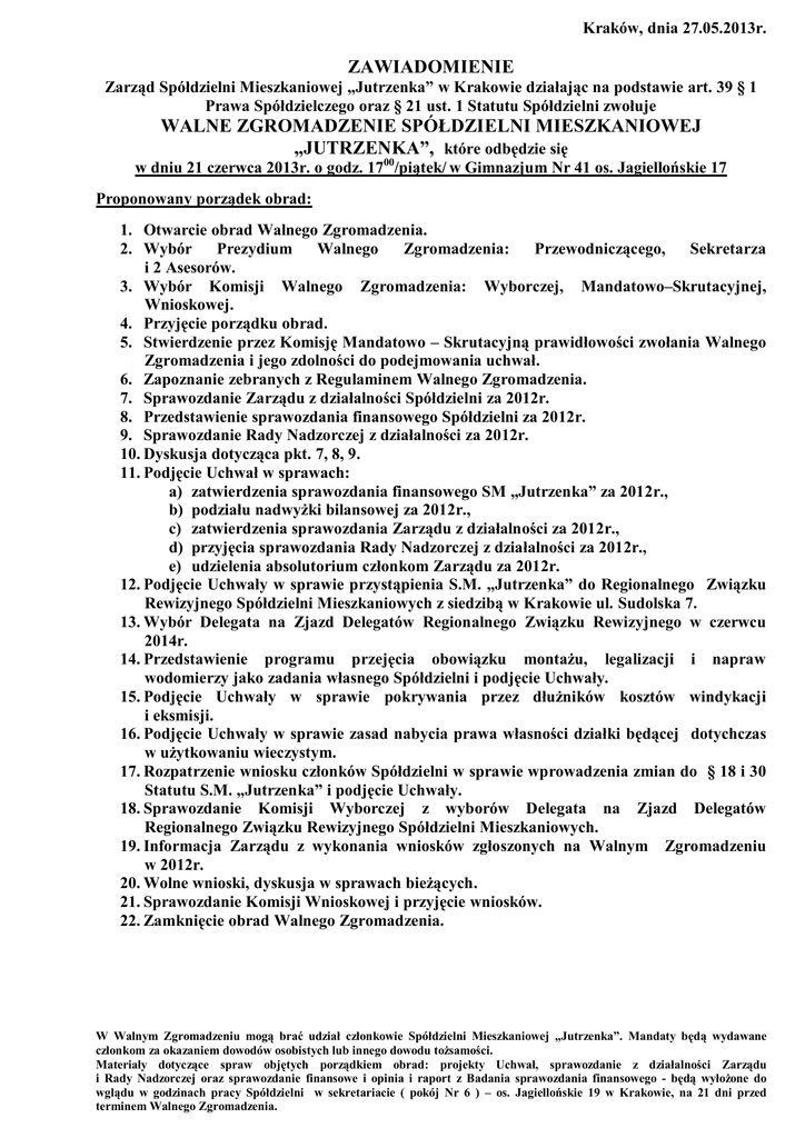 Kraków, dnia 27.05.2013r. ZAWIADOMIENIE Zarząd Spółdzielni Mieszkaniowej „Jutrzenka” w Krakowie działając na podstawie art. 39 § 1 Prawa Spółdzielczego oraz § 21 ust. 1 Statutu Spółdzielni zwołuje WALNE ZGROMADZENIE SPÓŁDZIELNI MIESZKANIOWEJ „JUTRZENKA”, które odbędzie się w dniu 21 czerwca 2013r. o godz. 1700/piątek/ w Gimnazjum Nr 41 os. Jagiellońskie 17 Proponowany porządek obrad: 1. Otwarcie obrad Walnego Zgromadzenia. 2. Wybór Prezydium Walnego Zgromadzenia: Przewodniczącego, Sekretarza i 2 Asesorów. 3. Wybór Komisji Walnego Zgromadzenia: Wyborczej, Mandatowo–Skrutacyjnej, Wnioskowej. 4. Przyjęcie porządku obrad. 5. Stwierdzenie przez Komisję Mandatowo – Skrutacyjną prawidłowości zwołania Walnego Zgromadzenia i jego zdolności do podejmowania uchwał. 6. Zapoznanie zebranych z Regulaminem Walnego Zgromadzenia. 7. Sprawozdanie Zarządu z działalności Spółdzielni za 2012r. 8. Przedstawienie sprawozdania finansowego Spółdzielni za 2012r. 9. Sprawozdanie Rady Nadzorczej z działalności za 2012r. 10. Dyskusja dotycząca pkt. 7, 8, 9. 11. Podjęcie Uchwał w sprawach: a) zatwierdzenia sprawozdania finansowego SM „Jutrzenka” za 2012r., b) podziału nadwyżki bilansowej za 2012r., c) zatwierdzenia sprawozdania Zarządu z działalności za 2012r., d) przyjęcia sprawozdania Rady Nadzorczej z działalności za 2012r., e) udzielenia absolutorium członkom Zarządu za 2012r. 12. Podjęcie Uchwały w sprawie przystąpienia S.M. „Jutrzenka” do Regionalnego Związku Rewizyjnego Spółdzielni Mieszkaniowych z siedzibą w Krakowie ul. Sudolska 7. 13. Wybór Delegata na Zjazd Delegatów Regionalnego Związku Rewizyjnego w czerwcu 2014r. 14. Przedstawienie programu przejęcia obowiązku montażu, legalizacji i napraw wodomierzy jako zadania własnego Spółdzielni i podjęcie Uchwały. 15. Podjęcie Uchwały w sprawie pokrywania przez dłużników kosztów windykacji i eksmisji. 16. Podjęcie Uchwały w sprawie zasad nabycia prawa własności działki będącej dotychczas w użytkowaniu wieczystym. 17. Rozpatrzenie wniosku członków Spółdzielni w sprawie wprowadzenia zmian do § 18 i 30 Statutu S.M. „Jutrzenka” i podjęcie Uchwały. 18. Sprawozdanie Komisji Wyborczej z wyborów Delegata na Zjazd Delegatów Regionalnego Związku Rewizyjnego Spółdzielni Mieszkaniowych. 19. Informacja Zarządu z wykonania wniosków zgłoszonych na Walnym Zgromadzeniu w 2012r. 20. Wolne wnioski, dyskusja w sprawach bieżących. 21. Sprawozdanie Komisji Wnioskowej i przyjęcie wniosków. 22. Zamknięcie obrad Walnego Zgromadzenia. W Walnym Zgromadzeniu mogą brać udział członkowie Spółdzielni Mieszkaniowej „Jutrzenka”. Mandaty będą wydawane członkom za okazaniem dowodów osobistych lub innego dowodu tożsamości. Materiały dotyczące spraw objętych porządkiem obrad: projekty Uchwał, sprawozdanie z działalności Zarządu i Rady Nadzorczej oraz sprawozdanie finansowe i opinia i raport z Badania sprawozdania finansowego - będą wyłożone do wglądu w godzinach pracy Spółdzielni w sekretariacie ( pokój Nr 6 ) – os. Jagiellońskie 19 w Krakowie, na 21 dni przed terminem Walnego Zgromadzenia.
