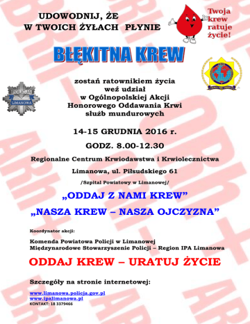 UDOWODNIJ, ŻE W TWOICH ŻYŁACH PŁYNIE zostań ratownikiem życia weź udział w Ogólnopolskiej Akcji Honorowego Oddawania Krwi służb mundurowych 14-15 GRUDNIA 2016 r. GODZ. 8.00-12.30 Regionalne Centrum Krwiodawstwa i Krwiolecznictwa Limanowa, ul. Piłsudskiego 61 /Szpital Powiatowy w Limanowej/ „ODDAJ Z NAMI KREW” „NASZA KREW – NASZA OJCZYZNA” Koordynator akcji: Komenda Powiatowa Policji w Limanowej Międzynarodowe Stowarzyszenie Policji – Region IPA Limanowa ODDAJ KREW – URATUJ ŻYCIE Szczegóły na stronie internetowej: www.limanowa.policja.gov.pl www.ipalimanowa.pl KONTAKT: 18 3379466