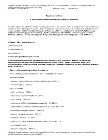 Zapytanie ofrtowe o wartości szacunkowej poniżej 30 000 Euro - nadzór inwestorski - remont nawierzchni placów przy budynku Urzędu Gminy oraz boisku Orlik 2012 Nr sprawy ; ZP/DB/01/2015 Fredropol, dnia 22 kwietnia 2015 r. Zapytanie ofertowe o wartości szacunkowej zamówienia poniżej 30 000 EURO W związku z zamiarem udzielenia zamówienia na podstawie art. 4 pkt 8 ustawy z dnia 29 stycznia 2004 r. Prawo zamówień publicznych (tekst jednolity Dz. U. z 2013 r. 907 z późniejszymi zmianami) zwracamy się o przedstawienie oferty cenowej na usługę: pełnienie nadzoru inwestorskiego na zadaniu pn. „Remont (przebudowa) nawierzchni placów przy budynku administracyjnym Urzędu Gminy i boisku sportowym „Orlik 2012” ” realizowanego w ramach działania „Odnowa i rozwój wsi” objętego Programem Rozwoju Obszarów Wiejskich na lata 2007-2013”. 1. Nazwa i adres zamawiającego: GMINA FREDROPOL 37-734 Fredropol 15 www.fredropol.pl 2. Określenie przedmiotu zamówienia: Przedmiotem zamówienia jest pełnienie nadzoru inwestorskiego na zadaniu „Remont (przebudowa) nawierzchni placów przy budynku administracyjnym Urzędu Gminy i boisku sportowym „Orlik 2012”” realizowanego w ramach działania „Odnowa i rozwój wsi” objętego Programem Rozwoju Obszarów Wiejskich na lata 2007-2013”. 1. Zakres robót budowlanych objętych nadzorem ; Prace przy budynku administracyjnym – dz. nr 315/3 315/9 obr.Fredropol Roboty rozbiórkowe ; - rozebranie nawierzchni z mas mineralno-bitumicznych – 35,00 m2, - wywiezienie gruzu – 2,10 m3, Plac przy budynku ; - roboty pomiarowe – 0,06 ha, - mechaniczne wykonanie koryta – 597,33 m2, - roboty ziemne – 268,80 m3, - mechaniczne profilowanie i zagęszczanie podłoża – 597,33 m2, - warstwa dolna podbudowy z kruszyw naturalnych gr. 20 cm – 597,33 m2, - podbudowa betonowa z dylatacja – 546,27 m2, - ława pod krawężniki betonowa – 9,16 m3, - krawężniki betonowe – 161,21 m, - nawierzchnia z kostki brukowej betonowej grubości 8 cm – 546,27 m2, Przepusty pod jezdnią ; - rozebranie przepustów – 14,00 m, Zapytanie ofrtowe o wartości szacunkowej poniżej 30 000 Euro - nadzór inwestorski - remont nawierzchni placów przy budynku Urzędu Gminy oraz boisku Orlik 2012 Zapytanie ofrtowe o wartości szacunkowej poniżej 30 000 Euro - nadzór inwestorski - remont nawierzchni placów przy budynku Urzędu Gminy oraz boisku Orlik 2012 - wywiezienie gruzu – 2,64 m3, - kanały z rur polietylenowych – 16,00 m, - zasypanie wykopów – 19,48 m3, - podbudowa z kruszywa łamanego – 24,00 m2, - odbudowa wlotów przepustu – 5,00 m3, - bariery ochronne stalowe jednostronne – 8,00 m, Prace przy boisku sportowym „Orlik 2012” – dz. nr 315/12, 316, 337/3, 338/5, 420 obr.Fredropol - roboty pomiarowe – 0,11 ha, - rozbiórka nawierzchni z płyt żelbetowych – 880,00 m2 , - roboty ziemne – 433,30 m3, - profilowanie i zagęszczanie podłoża – 1083,24 m2, - wykonanie i zagęszczenie mechaniczne warstwy odsączającej – 1083,24 m2, - warstwa dolna podbudowy z kruszyw naturalnych gr. 20 cm – 1083,24 m2, - podbudowa betonowa z dylatacja – 1083,24 m2, - rowki pod krawężniki – 352,40 m, - ława pod krawężniki betonowa – 20,09 m3, - krawężniki betonowe – 352,40 m, - nawierzchnia z kostki brukowej betonowej grubości 8 cm – 1083,24 m2, Wartość nadzorowanych robót wynosi brutto ; 198 217,19 PLN Zapytanie ofrtowe o wartości szacunkowej poniżej 30 000 Euro - nadzór inwestorski - remont nawierzchni placów przy budynku Urzędu Gminy oraz boisku Orlik 2012