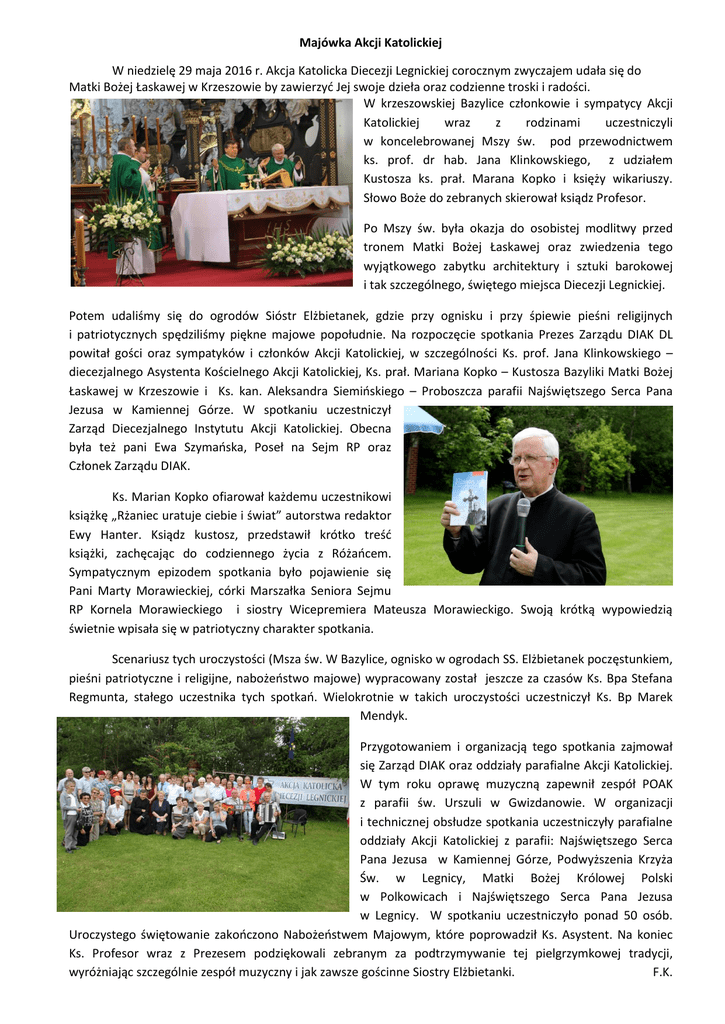 Majówka Akcji Katolickiej W niedzielę 29 maja 2016 r. Akcja Katolicka Diecezji Legnickiej corocznym zwyczajem udała się do Matki Bożej Łaskawej w Krzeszowie by zawierzyć Jej swoje dzieła oraz codzienne troski i radości. W krzeszowskiej Bazylice członkowie i sympatycy Akcji Katolickiej wraz z rodzinami uczestniczyli w koncelebrowanej Mszy św. pod przewodnictwem ks. prof. dr hab. Jana Klinkowskiego, z udziałem Kustosza ks. prał. Marana Kopko i księży wikariuszy. Słowo Boże do zebranych skierował ksiądz Profesor. Po Mszy św. była okazja do osobistej modlitwy przed tronem Matki Bożej Łaskawej oraz zwiedzenia tego wyjątkowego zabytku architektury i sztuki barokowej i tak szczególnego, świętego miejsca Diecezji Legnickiej. Potem udaliśmy się do ogrodów Sióstr Elżbietanek, gdzie przy ognisku i przy śpiewie pieśni religijnych i patriotycznych spędziliśmy piękne majowe popołudnie. Na rozpoczęcie spotkania Prezes Zarządu DIAK DL powitał gości oraz sympatyków i członków Akcji Katolickiej, w szczególności Ks. prof. Jana Klinkowskiego – diecezjalnego Asystenta Kościelnego Akcji Katolickiej, Ks. prał. Mariana Kopko – Kustosza Bazyliki Matki Bożej Łaskawej w Krzeszowie i Ks. kan. Aleksandra Siemińskiego – Proboszcza parafii Najświętszego Serca Pana Jezusa w Kamiennej Górze. W spotkaniu uczestniczył Zarząd Diecezjalnego Instytutu Akcji Katolickiej. Obecna była też pani Ewa Szymańska, Poseł na Sejm RP oraz Członek Zarządu DIAK. Ks. Marian Kopko ofiarował każdemu uczestnikowi książkę „Rżaniec uratuje ciebie i świat” autorstwa redaktor Ewy Hanter. Ksiądz kustosz, przedstawił krótko treść książki, zachęcając do codziennego życia z Różańcem. Sympatycznym epizodem spotkania było pojawienie się Pani Marty Morawieckiej, córki Marszałka Seniora Sejmu RP Kornela Morawieckiego i siostry Wicepremiera Mateusza Morawieckigo. Swoją krótką wypowiedzią świetnie wpisała się w patriotyczny charakter spotkania. Scenariusz tych uroczystości (Msza św. W Bazylice, ognisko w ogrodach SS. Elżbietanek poczęstunkiem, pieśni patriotyczne i religijne, nabożeństwo majowe) wypracowany został jeszcze za czasów Ks. Bpa Stefana Regmunta, stałego uczestnika tych spotkań. Wielokrotnie w takich uroczystości uczestniczył Ks. Bp Marek Mendyk. Przygotowaniem i organizacją tego spotkania zajmował się Zarząd DIAK oraz oddziały parafialne Akcji Katolickiej. W tym roku oprawę muzyczną zapewnił zespół POAK z parafii św. Urszuli w Gwizdanowie. W organizacji i technicznej obsłudze spotkania uczestniczyły parafialne oddziały Akcji Katolickiej z parafii: Najświętszego Serca Pana Jezusa w Kamiennej Górze, Podwyższenia Krzyża Św. w Legnicy, Matki Bożej Królowej Polski w Polkowicach i Najświętszego Serca Pana Jezusa w Legnicy. W spotkaniu uczestniczyło ponad 50 osób. Uroczystego świętowanie zakończono Nabożeństwem Majowym, które poprowadził Ks. Asystent. Na koniec Ks. Profesor wraz z Prezesem podziękowali zebranym za podtrzymywanie tej pielgrzymkowej tradycji, wyróżniając szczególnie zespół muzyczny i jak zawsze gościnne Siostry Elżbietanki. F.K.