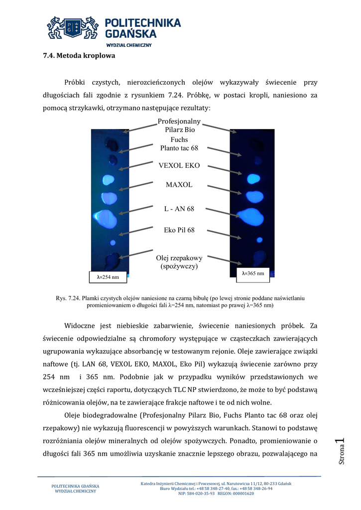 7.4. Metoda kroplowa Próbki czystych, nierozcieńczonych olejów wykazywały świecenie przy długościach fali zgodnie z rysunkiem 7.24. Próbkę, w postaci kropli, naniesiono za pomocą strzykawki, otrzymano następujące rezultaty: Profesjonalny Pilarz Bio Fuchs Planto tac 68 VEXOL EKO MAXOL L - AN 68 Eko Pil 68 Olej rzepakowy (spożywczy) λ=254 nm λ=365 nm Rys. 7.24. Plamki czystych olejów naniesione na czarną bibułę (po lewej stronie poddane naświetlaniu promieniowaniem o długości fali λ=254 nm, natomiast po prawej λ=365 nm) Widoczne jest niebieskie zabarwienie, świecenie naniesionych próbek. Za świecenie odpowiedzialne są chromofory występujące w cząsteczkach zawierających ugrupowania wykazujące absorbancję w testowanym rejonie. Oleje zawierające związki naftowe (tj. LAN 68, VEXOL EKO, MAXOL, Eko Pil) wykazują świecenie zarówno przy 254 nm i 365 nm. Podobnie jak w przypadku wyników przedstawionych we wcześniejszej części raportu, dotyczących TLC NP stwierdzono, że może to być podstawą różnicowania olejów, na te zawierające frakcje naftowe i te od nich wolne. Oleje biodegradowalne (Profesjonalny Pilarz Bio, Fuchs Planto tac 68 oraz olej długości fali 365 nm umożliwia uzyskanie znacznie lepszego obrazu, pozwalającego na POLITECHNIKA GDAŃSKA WYDZIAŁ CHEMICZNY Katedra Inżynierii Chemicznej i Procesowej, ul. Narutowicza 11/12, 80-233 Gdańsk Biuro Wydziału tel.: +48 58 348-27-40, fax.: +48 58 348-26-94 NIP: 584-020-35-93 REGON: 000001620 Strona rozróżniania olejów mineralnych od olejów spożywczych. Ponadto, promieniowanie o 1 rzepakowy) nie wykazują fluorescencji w powyższych warunkach. Stanowi to podstawę jednoznaczną i bezsporną wizualną analizę zawartości grup naftowych w badanych produktach olejowych. Dodatkowo olej Vexol Eko charakteryzuje się większą intensywnością świecenia w świetle z zakresu UV (w porównaniu do pozostałych próbek), co najprawdopodobniej wynika z większej zawartości związków absorbujących promieniowanie w tym zakresie długości fali. Stwierdzono, że analizę i różnicowanie olejów na czarnej bibule należy przeprowadzać bezzwłocznie po naniesieniu próbek., tzn. próbki od razu po ich naniesieniu należy analizować pod lampą UV. W przeciwnym przypadku dochodzi do zaniku charakterystycznego świecenia na skutek wnikania substancji w strukturę nośnika (bibuły). Przykład analizy wykonanej po ok. 30 min od naniesienia próbek na powierzchnię bibuły przedstawiono na rysunku 7.25. Rys. 7.25. Plamki czystych olejów po ok. 30 min od naniesienia na czarną bibułę (po lewej stronie poddane naświetlaniu promieniowaniem o długości fali λ=254 nm, po prawej λ=365 nm) Na zdjęciach (Rys. 7.25.) wykonanych po czasie 30 min widoczne jest świecenie oleju L - AN 68, jednakże wynika ono tylko i wyłącznie z faktu, iż naniesiono większą ilość tego oleju w stosunku do pozostałych próbek. Przebadano komercyjnie dostępne oleje typu Profesjonalny Pilarz oraz Eco Pil 68 Strona 2 (Rys. 7.26.), posiadające wymagane certyfikaty dotyczące użytkowania. POLITECHNIKA GDAŃSKA WYDZIAŁ CHEMICZNY Katedra Inżynierii Chemicznej i Procesowej, ul. Narutowicza 11/12, 80-233 Gdańsk Biuro Wydziału tel.: +48 58 348-27-40, fax.: +48 58 348-26-94 NIP: 584-020-35-93 REGON: 000001620 Rys. 7.26. Plamki olejów: Profesjonalny Pilarz, Profesjonalny Pilarz S/H/Eko oraz Profesjonalny Pilarz Bio naniesionych na czarną bibułę, ujawnione pod wpływem promieniowania o długości fali λ=254 nm oraz 365 nm. Na podstawie wykonanej analizy stwierdzono, że oleje: Profesjonalny Pilarz H oraz Profesjonalny Pilarz Bio są olejami estrowymi, w pełni biodegradowalnymi, Strona 3 natomiast pozostałe próbki reprezentują oleje mineralne. POLITECHNIKA GDAŃSKA WYDZIAŁ CHEMICZNY Katedra Inżynierii Chemicznej i Procesowej, ul. Narutowicza 11/12, 80-233 Gdańsk Biuro Wydziału tel.: +48 58 348-27-40, fax.: +48 58 348-26-94 NIP: 584-020-35-93 REGON: 000001620 7.5. NP - TLC Wykonano analizę TLC w układzie faz normalnych (NP), stosując rozdzielanie 3stopniowe, dla następujących próbek olejów: Profesjonalny Pilarz Eko (1), Profesjonalny Pilarz H (2), Profesjonalny Pilarz S (3), Profesjonalny Pilarz (4), Fuchs PLANTO tac 68 (5), Olej kujawski (6). Chromatogramy rozwijano kolejno heksanem, toluenem (do ok. 2/3 wysokości płytki) oraz mieszaniną DCM : MeOH (95:5 v/v) (do ok. 1/3 wysokości płytki). Chromatogramy wywoływano jodem, w celu ujawnienia wyników w świetle widzialnym. Po każdym etapie rozdziału, płytki umieszczono w eksykatorze z jodem. Faza ruchoma: heksan 3 2 1 6 5 4 Rys. 7.27. Chromatogram NP-TLC, faza stacjonarna: Silicagel 60F254, Merck HX 43185734 faza ruchoma: heksan, rozdzielane próbki: Profesjonalny Pilarz Eko (1); Profesjonalny Pilarz H (2); Profesjonalny Pilarz S (3); Profesjonalny Pilarz (4); Fuchs PLANTO tac 68 (5); Olej kujawski (6); stężenie 1 mg/ml; wizualizacja: jod Faza ruchoma: toluen 3 Strona 1 4 2 POLITECHNIKA GDAŃSKA WYDZIAŁ CHEMICZNY Katedra Inżynierii Chemicznej i Procesowej, ul. Narutowicza 11/12, 80-233 Gdańsk Biuro Wydziału tel.: +48 58 348-27-40, fax.: +48 58 348-26-94 NIP: 584-020-35-93 REGON: 000001620 6 5 4 Rys. 7.28. Chromatogram NP-TLC, faza stacjonarna: Silicagel 60F254, Merck HX 43185734 faza ruchoma: toluen, rozdzielane próbki: Profesjonalny Pilarz Eko (1); Profesjonalny Pilarz H (2), R f = 0,390; Profesjonalny Pilarz S (3); Profesjonalny Pilarz (4); Fuchs PLANTO tac 68 (5), R f = 0,295; Olej kujawski (6), Rf = 0,329; stężenie 1 mg/ml; wizualizacja: jod Faza ruchoma: DCM:MeOH (95:5 v/v) 3 2 1 6 5 4 Rys. 7.29. Chromatogram NP-TLC, faza stacjonarna: Silicagel 60F254, Merck HX 43185734 faza ruchoma: DCM:MeOH (95:5 v/v), rozdzielane próbki: Profesjonalny Pilarz Eko (1); Profesjonalny Pilarz H (2), Rf = 0,929; Profesjonalny Pilarz S (3); Profesjonalny Pilarz (4); Fuchs PLANTO tac 68 (5), R f = 0,900; Olej kujawski (6), Rf = 0,917; stężenie 1 mg/ml; 