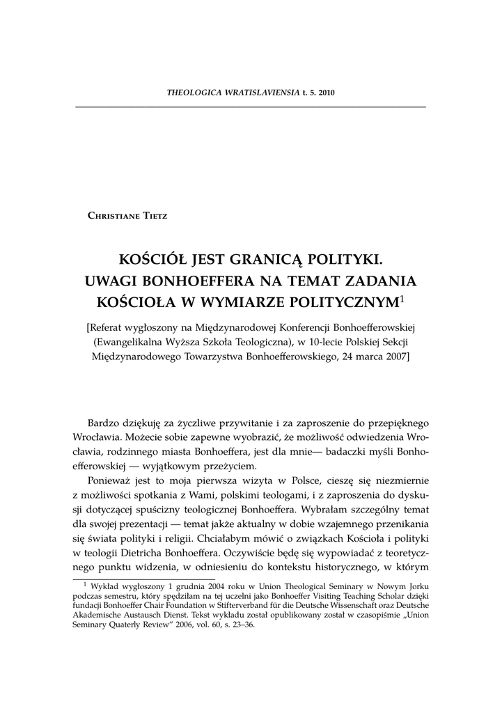 THEOLOGICA WRATISLAVIENSIA t. 5. 2010 ——————————————————————————————————— Christiane Tietz KOŚCIÓŁ JEST GRANICĄ POLITYKI. UWAGI BONHOEFFERA NA TEMAT ZADANIA KOŚCIOŁA W WYMIARZE POLITYCZNYM1 [Referat wygłoszony na Międzynarodowej Konferencji Bonhoefferowskiej (Ewangelikalna Wyższa Szkoła Teologiczna), w 10-lecie Polskiej Sekcji Międzynarodowego Towarzystwa Bonhoefferowskiego, 24 marca 2007] Bardzo dziękuję za życzliwe przywitanie i za zaproszenie do przepięknego Wrocławia. Możecie sobie zapewne wyobrazić, że możliwość odwiedzenia Wrocławia, rodzinnego miasta Bonhoeffera, jest dla mnie— badaczki myśli Bonhoefferowskiej — wyjątkowym przeżyciem. Ponieważ jest to moja pierwsza wizyta w Polsce, cieszę się niezmiernie z możliwości spotkania z Wami, polskimi teologami, i z zaproszenia do dyskusji dotyczącej spuścizny teologicznej Bonhoeffera. Wybrałam szczególny temat dla swojej prezentacji — temat jakże aktualny w dobie wzajemnego przenikania się świata polityki i religii. Chciałabym mówić o związkach Kościoła i polityki w teologii Dietricha Bonhoeffera. Oczywiście będę się wypowiadać z teoretycznego punktu widzenia, w odniesieniu do kontekstu historycznego, w którym 1 Wykład wygłoszony 1 grudnia 2004 roku w Union Theological Seminary w Nowym Jorku podczas semestru, który spędziłam na tej uczelni jako Bonhoeffer Visiting Teaching Scholar dzięki fundacji Bonhoeffer Chair Foundation w Stifterverband für die Deutsche Wissenschaft oraz Deutsche Akademische Austausch Dienst. Tekst wykładu został opublikowany został w czasopiśmie „Union Seminary Quaterly Review” 2006, vol. 60, s. 23–36. 76 Christiane Tietz Bonhoeffer rozwijał swoje idee. Mam jednak nadzieję, że słuchając moich uwag odkryjecie niejednokrotnie aktualność jego myśli. W dalszej części naszego spotkania zapraszam do dyskusji na temat współczesnego znaczenia teologii politycznej Bonhoeffera. Na razie jednak skupmy się ściśle na jego ideach. Jak wiecie, Dietrich Bonhoeffer uczestniczył w spisku, którego celem było przeprowadzenie zamachu na Adolfa Hitlera. Jego stanowisko dotyczące zadania Kościoła w wymiarze politycznym wydaje się zatem jednoznaczne: chrześcijanie powinni stawiać opór władzy! Nie powinni wahać się przed podjęciem walki z rządem — nawet przy użyciu radykalnych środków. W tym świetle Bonhoeffer jawi się jako swego rodzaju rewolucjonista teologiczny. Jednak to nie takie proste! Wypowiadając się na temat zadania Kościoła w wymiarze politycznym, Bonhoeffer nie nawoływał wyłącznie do czynnego oporu2 . Mówił również o tym, że władza państwowa jest konieczna i że trzeba okazywać posłuszeństwo rządowi. Teksty Bonhoeffera ukazują specyficzne podejście do politycznego zadania Kościoła, które postaram się omówić szczegółowo w dalszej części wykładu. I. Uwagi na temat zadania Kościoła w wymiarze politycznym we wczesnych pismach Bonhoeffera W styczniu 1933 roku Adolf Hitler został wybrany na kanclerza Niemiec. W kwietniu tego roku rząd niemiecki wprowadził tak zwany „paragraf aryjski”, który zakazywał wszystkim Żydom podejmowania pracy na posadach państwowych. Wkrótce potem rozgorzała dyskusja, czy paragraf aryjski należy również zastosować w Kościele, usuwając ochrzczonych Żydów „ze stanowisk związanych z przywództwem kościelnym”3 . Te decyzje wywarły niebawem wpływ na bezpośrednie otoczenie Dietricha Bonhoeffera. Mąż jego siostry i jeden z jego najbliższych przyjaciół mieli żydowskie pochodzenie. Bonhoeffer zareagował bezzwłocznie w artykule pod tytułem Kościół a kwestia żydowska4 . Bonhoeffer był teologiem luterańskim, a w tradycyjnej teologii luterańskiej koncepcja państwa — określana mianem doktryny o dwóch królestwach lub dwóch urzędach — ma zwykle dwa aspekty. Z jednej strony państwo ma swoją wartość 2 Por. Protestantismus ohne Reformation. W: DBW 15, s. 442, gdzie Bonhoeffer stwierdza, że od niektórych osób można wymagać gotowości do stawienia oporu, a innym należy pozwolić na ucieczkę (a nawet ją nakazać) i że Bóg nie powołuje wszystkich do męczeństwa. (Dalsze cytaty z tego dzieła Bonhoeffera pochodzą z angielskiego tłumaczenia pt. Protestantism without Reformation. W: No Rusty Swords. New York 1965 (przyp. red.). 3 D. Bonhoeffer, The Jewish-Christian Question as Status Confessionis. W: DBW 12, s. 359. 4 D. Bonhoeffer, The Church and the Jewish Question. W: DBWE 12, s. 361–373. Kościół jest granicą polityki... 77 oraz swoje prawa, ponieważ przyjmuje się, że zostało ono ustanowione przez Boga (Rz 13,1). Uznaje się państwo za niezbędną strukturę, której celem jest egzekwowanie porządku i sprawiedliwości. Władza państwowa musi z konieczności opierać się na sile i surowości, a nie na przebaczeniu i miłości bliźniego. Za pośrednictwem państwa Bóg sprawuje opatrznościowe rządy nad światem. Z drugiej strony zgodnie z luterańskim punktem widzenia państwo ma pewne ograniczenia, ponieważ nigdy nie jest źródłem zbawienia ludzkości. Istnieje coś ponad państwem; jak wierzą chrześcijanie, jest ktoś ponad państwem, a mianowicie Bóg, który znaczy dla ludzkości o wiele więcej niż samo państwo. Podsumowując stanowisko luterańskie, można wyrazić to w następujący sposób — państwo ma swoje prawa i pewną rolę do odegrania, ponieważ zostało ustanowione przez Boga, ale ma również swoje granice, ponieważ zostało ustanowione przez Boga. Jako teolog luterański Bonhoeffer dowodzi, że państwo jest instytucją ustanowioną i uprawomocnioną przez Boga. Bóg chce, aby państwo istniało, ponieważ dbając o porządek i sprawiedliwość państwo przyczynia się do zachowania świata5 . W roku 1933 Bonhoeffer konkluduje, że Kościół „nie ma prawa wywierać bezpośredniego wpływu na państwo pr