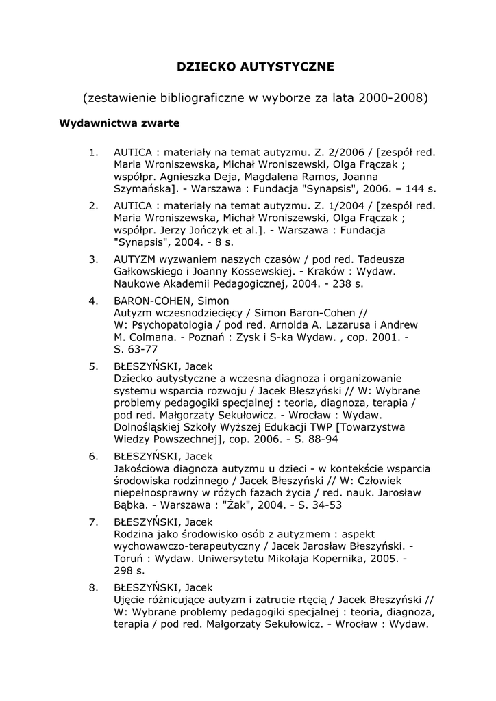 DZIECKO AUTYSTYCZNE (zestawienie bibliograficzne w wyborze za lata 2000-2008) Wydawnictwa zwarte 1. AUTICA : materiały na temat autyzmu. Z. 2/2006 / [zespół red. Maria Wroniszewska, Michał Wroniszewski, Olga Frączak ; współpr. Agnieszka Deja, Magdalena Ramos, Joanna Szymańska]. - Warszawa : Fundacja "Synapsis", 2006. – 144 s. 2. AUTICA : materiały na temat autyzmu. Z. 1/2004 / [zespół red. Maria Wroniszewska, Michał Wroniszewski, Olga Frączak ; współpr. Jerzy Jończyk et al.]. - Warszawa : Fundacja "Synapsis", 2004. - 8 s. 3. AUTYZM wyzwaniem naszych czasów / pod red. Tadeusza Gałkowskiego i Joanny Kossewskiej. - Kraków : Wydaw. Naukowe Akademii Pedagogicznej, 2004. - 238 s. 4. BARON-COHEN, Simon Autyzm wczesnodziecięcy / Simon Baron-Cohen // W: Psychopatologia / pod red. Arnolda A. Lazarusa i Andrew M. Colmana. - Poznań : Zysk i S-ka Wydaw. , cop. 2001. S. 63-77 5. BŁESZYŃSKI, Jacek Dziecko autystyczne a wczesna diagnoza i organizowanie systemu wsparcia rozwoju / Jacek Błeszyński // W: Wybrane problemy pedagogiki specjalnej : teoria, diagnoza, terapia / pod red. Małgorzaty Sekułowicz. - Wrocław : Wydaw. Dolnośląskiej Szkoły Wyższej Edukacji TWP [Towarzystwa Wiedzy Powszechnej], cop. 2006. - S. 88-94 6. BŁESZYŃSKI, Jacek Jakościowa diagnoza autyzmu u dzieci - w kontekście wsparcia środowiska rodzinnego / Jacek Błeszyński // W: Człowiek niepełnosprawny w różych fazach życia / red. nauk. Jarosław Bąbka. - Warszawa : "Żak", 2004. - S. 34-53 7. BŁESZYŃSKI, Jacek Rodzina jako środowisko osób z autyzmem : aspekt wychowawczo-terapeutyczny / Jacek Jarosław Błeszyński. Toruń : Wydaw. Uniwersytetu Mikołaja Kopernika, 2005. 298 s. 8. BŁESZYŃSKI, Jacek Ujęcie różnicujące autyzm i zatrucie rtęcią / Jacek Błeszyński // W: Wybrane problemy pedagogiki specjalnej : teoria, diagnoza, terapia / pod red. Małgorzaty Sekułowicz. - Wrocław : Wydaw. Dolnośląskiej Szkoły Wyższej Edukacji TWP [Towarzystwa Wiedzy Powszechnej], cop. 2006. - S. 146-150 9. BŁESZYŃSKI, Jacek Wykorzystanie metody Ułatwionej Komunikacji / Jacek Jarosław Błeszyński // W: Alternatywne i wspomagające metody komunikacji / pod red. Jacka Błeszyńskiego. - Kraków : "Impuls", 2006. - S. 411-422 10. BOBKOWICZ-LEWARTOWSKA, Lucyna Autyzm dziecięcy : zagadnienia diagnozy i terapii / Lucyna Bobkowicz-Lewartowska. - Wyd. 2. - Kraków : "Impuls", 2005. - 155 s. 11. CEŚLICKI, Wiesław Wpływ rehabilitacji w wodzie na usprawnianie dzieci z mózgowym porażeniem dziecięcym, zespołem Downa i dzieci z autyzmem / Wiesław Cieślicki // W: Dziecko z zaburzeniami w rozwoju : konteksty diagnostyczne i terapeutyczne / pod red. nauk. Beaty Cytowskiej i Barbary Winczury. - Kraków : "Impuls", 2006. - S. 231-241 12. CZAPIGA, Alina Analiza treści i poziomu graficznego rysunków wykonywanych spontanicznie i według instrukcji przez dzieci autystyczne / Alina Czapiga // W: Wczesna diagnoza i terapia dzieci z utrudnieniami w rozwoju : interdyscyplinarne problemy / pod red. Joanny Kruk-Lasockiej i Małgorzaty Sekułowicz. - Wrocław : Dolnośląska Szkoła Wyższa Edukacji Towarzystwa Wiedzy Powszechnej, 2004. - S. 68-75 13. DANIELEWICZ, Dorota Funkcjonowanie psychospołeczne nastolatków i dorosłych osób z autyzmem / Dorota Danielewicz // W: Psychologia rehabilitacyjna : wybrane zagadnienia / pod red. Tadeusza Gałkowskiego i Ewy Pisuli. - Warszawa : Wydaw. Instytutu Psychologii PAN [Polskiej Akademii Nauk], 2006. - S. 171-183 14. DRUGIE opowieści terapeutów / komentuje Hanna Olechnowicz. - Warszawa : Wydawnictwa Szkolne i Pedagogiczne, 2000. 208 s. 15. DZIECKO o specjalnych potrzebach edukacyjnych / pod red. nauk. Czesława Kosakowskiego i Marzenny Zaorskiej. - Toruń : "Akapit", 2000. – 222 s. 16. GAŁKOWSKI, Tadeusz Zaburzenia komunikacji u dzieci z autyzmem / Tadeusz Gałkowski // W: Zaburzenia mowy / pod red. Stanisława Grabiasa. - Lublin : Wydaw. UMCS [Uniwersytetu Marii CurieSkłodowskiej], 2001. - S. 357-363 17. GAŁKOWSKI, Tadeusz Przystosowanie społeczne małych dzieci z autyzmem / Tadeusz Gałkowski, Ewa Pisula ; Akademia Wychowania Fizycznego Józefa Piłsudskiego w Warszawie. - Warszawa : AWF, 2004. 112 s. 18. GAŁKOWSKI, Tadeusz Zdolności porozumiewania się w autyzmie i ich wspomaganie / Tadeusz Gałkowski // W: Podstawy neurologopedii : podręcznik akademicki / pod red. Tadeusza Gałkowskiego, Elżbiety Szeląg i Grażyny Jastrzębowskiej. - Opole : Wydaw. Uniwersytetu Opolskiego, 2005. - S. 736-749 19. GRANDIN, Temple Myślenie obrazami oraz inne relacje z mojego życia z autyzmem / Temple Grandin. - Warszawa : "Fraszka Edukacyjna" : Fundacja "Synapsis", cop. 2006. - 310 s. 20. GROCHOWSKA, Joanna Metoda Ułatwionej Komunikacji : studium przypadku / Joanna Grochowska, Angelika Łasocha, Renata Werpachowska // W: Alternatywne i wspomagające metody komunikacji / pod red. Jacka J. Błeszyńskiego. - Kraków : "Impuls", 2006. - S. 423450 21. GROCHOWSKA, Joanna Standardy postępowania diagnostyczno-terapeutycznego we wczesnej interwencji autyzmu dziecięcego i zaburzeń pokrewnych w ujęciu psychiatrycznym / Joanna Grochowska // W: Wczesne wspomaganie rozwoju dziecka od chwili wykrycia niepełnosprawności do podjęcia nauki w szkole / pod red. Teresy Serafin. - Warszawa : Ministerstwo Edukacji Narodowej i Sportu, 2005. - S. 165-170 22. GRODZKA, Magdalena Dziecko autystyczne : dziennik terapeuty / Magdalena Grodzka. - Warszawa : Wydaw. Naukowe PWN, 2000. - 101 s. 23. IGNASIAK, Roman Formuła warsztatu terapii zajęciowej / Roman Ignasiak, Piotr Krawczyk // W: Wybrane formy terapii i rehabilitacji osób z autyzmem / pod red. nauk. Ewy Pisuli i Doroty Danielewicz. Kraków : "Impuls", 2005. - S. 245-270 24. JACKSON, Luke Świry, dziwadła i Zespół Aspergera : przewodnik użytkownika dojrzewania / Luke Jackson . - Warszawa : "Fraszka Edukacyjna" : we współpr. z Fundacją "Synapsis", 2005. 164 s. 25. JUTRZYNA, Ewelina Dziecko autystyczne w kręgu muzyki / Eweli
