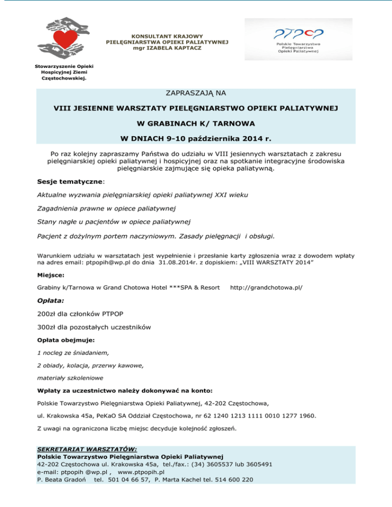 KONSULTANT KRAJOWY PIELĘGNIARSTWA OPIEKI PALIATYWNEJ mgr IZABELA KAPTACZ Stowarzyszenie Opieki Hospicyjnej Ziemi Częstochowskiej. ZAPRASZAJĄ NA VIII JESIENNE WARSZTATY PIELĘGNIARSTWO OPIEKI PALIATYWNEJ W GRABINACH K/ TARNOWA W DNIACH 9-10 października 2014 r. Po raz kolejny zapraszamy Państwa do udziału w VIII jesiennych warsztatach z zakresu pielęgniarskiej opieki paliatywnej i hospicyjnej oraz na spotkanie integracyjne środowiska pielęgniarskie zajmujące się opieka paliatywną. Sesje tematyczne: Aktualne wyzwania pielęgniarskiej opieki paliatywnej XXI wieku Zagadnienia prawne w opiece paliatywnej Stany nagłe u pacjentów w opiece paliatywnej Pacjent z dożylnym portem naczyniowym. Zasady pielęgnacji i obsługi. Warunkiem udziału w warsztatach jest wypełnienie i przesłanie karty zgłoszenia wraz z dowodem wpłaty na adres email: [email protected] do dnia 31.08.2014r. z dopiskiem: „VIII WARSZTATY 2014” Miejsce: Grabiny k/Tarnowa w Grand Chotowa Hotel ***SPA & Resort http://grandchotowa.pl/ Opłata: 200zł dla członków PTPOP 300zł dla pozostałych uczestników Opłata obejmuje: 1 nocleg ze śniadaniem, 2 obiady, kolacja, przerwy kawowe, materiały szkoleniowe Wpłaty za uczestnictwo należy dokonywać na konto: Polskie Towarzystwo Pielęgniarstwa Opieki Paliatywnej, 42-202 Częstochowa, ul. Krakowska 45a, PeKaO SA Oddział Częstochowa, nr 62 1240 1213 1111 0010 1277 1960. Z uwagi na ograniczona liczbę miejsc decyduje kolejność zgłoszeń. SEKRETARIAT WARSZTATÓW: Polskie Towarzystwo Pielęgniarstwa Opieki Paliatywnej 42-202 Częstochowa ul. Krakowska 45a, tel./fax.: (34) 3605537 lub 3605491 e-mail: ptpopih @wp.pl , www.ptpopih.pl P. Beata Gradoń tel. 501 04 66 57, P. Marta Kachel tel. 514 600 220