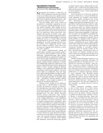 NIGDY WIĘCEJ nr 16, ZIMA-WIOSNA 2008 MAŁGORZATA FUSZARA „Niedokończona demokracja” WYDAWNICTWO TRIO, Warszawa 2006 N iezależnie od wartkości, z jaką toczy się w Polsce dyskusja o równości praw kobiet i mężczyzn, kolejne poruszane aspekty tej sprawy pozostają nierozstrzygnięte. Dyskryminacja jako temat w polskim życiu politycznym i społecznym nie istnieje. Podobnie jak równość. Przyczyn takiego stanu rzeczy można się doszukiwać w niewiedzy i ignorancji, ale również w emocjach, jakie budzi dyskusja na ten temat. Wbrew pozorom, jakie wydają się stwarzać tzw. grona decyzyjne, powodem na pewno nie jest niska jakość czy też brak rzetelnych badań i ich opracowań. Wręcz przeciwnie. Wiarygodne opracowania po prostu często „giną” w momencie, kiedy dyskusja osiąga moment krytyczny, czyli dotyka sedna problemu i generuje możliwość zmian, co z zasady odbywa się przy akompaniamencie gorących emocji i spektakli medialnych na miarę czarnego humoru Monthy Pythona. Praca Małgorzaty Fuszary zatytułowana „Kobiety w polityce” mówi nam o wiele więcej niż sugeruje tytuł. Zarówno o kobietach, jak i o polityce. W centrum zainteresowania autorki jest udział kobiet w polskiej rzeczywistości politycznej, temat ten stał się punktem wyjścia do przekrojowego, wielopoziomowego ujęcia problemu pozycji kobiety we współczesnym społeczeństwie. Nie ma z góry założonej tezy, nie ma sugestii, nie ma tendencyjnych twierdzeń. Są wnioski, poparte wynikami badań osadzonych w kontekście problematyki społecznej, historycznej i kulturowej. Nakreślenie historii ruchów społecznych kobiet w Polsce i Europie, dostępu do edukacji, udziału w życiu społecznym i politycznym daje czytelnikowi szeroki obraz problemu i nie pozostawia miejsca na wątpliwości. Praca jest wyjątkowa, gdyż analizuje problem nie tylko na poziomie parlamentu polskiego i europejskiego; obrazuje również jego specyfikę na szczeblu lokalnym – przedstawia sytuację polskich radnych oraz sołtysek i zwraca uwagę na społeczny oddźwięk ich zawodowej aktywności. Autorka zwraca uwagę na trzy podstawowe typy barier w udziale kobiet w życiu politycznym. Po pierwsze, wskazuje na historycznie ukształtowane nierówności społeczne. Zajmowanie przez kobiety niższej pozycji w relacjach, brak udziału w życiu publicznym i podporządkowanie (ale także zgoda) uprzywilejowanej pozycji mężczyzny mają wynikać z uwarunkowań biologicznych oraz czystej ekonomii. Podporządkowanie to jest dodatkowo wciąż utrwalane w procesie socjalizacji, choćby poprzez przekazywanie stereotypów odnoszących się do kobiecych i męskich ról społecznych w podręcznikach szkolnych. Role społeczne ściśle wiążą się z rolami kulturowymi, i jest to drugi typ wyjaśnień. A więc wdrukowane przez wychowanie wzorce zachowań. Autorka przytacza wypowiedzi kobiet, które usprawiedliwiają, a nawet wstydzą się swojej aktywności politycznej, tłumacząc na przykład, że dzieci już odchowane, więc mają do niej prawo. Badania pokazują, że w zakresie oczekiwań wobec kobiety jako opiekunki, strażniczki domowego ogniska zachodzą istotne zmiany, jednak pełnienie obowiązków żony i matki pracującej jednocześnie pełen etat bez pomocy w sprawach domowych ze strony partnera wciąż w wielu środowiskach jest oczywistością. Trzeci typ barier to zachowania dyskryminacyjne na rynku pracy, a więc przeszkody stawiane kobietom na wysokich stanowiskach, ograniczenie działań, pomijanie przy awansach i obsadzaniu stanowisk, zmuszanie do ciągłego potwierdzania kompetencji itp. Z wypowiedzi członkiń parlamentu, radnych i sołtysek wynika, że objawem dyskryminacji (choć nie nazywanej przez nie wprost) najczęściej jest lekceważący stosunek: pomijanie bądź nieudzielanie głosu, techniki manipulacji podczas dyskusji czy prezentacji poglądów, a także sposób zwracania się do kobiet (na przykład nieusprawiedliwiony charakterem relacji sposób pieszczotliwy) i uwagi pod ich adresem. Jest to trudny problem ze względu na fakt, że takie zachowania sprzyjają budowaniu hierarchii społecznej, a podejmowane przez kobiety próby zmian łatwo mogą być ocenione jako brak poczucia humoru, sztywność czy nieumiejętność nawiązania kontaktu. Z wywiadów przeprowadzonych przez M. Fuszarę wynika, że kobiety doświadczające dyskryminacji boją się o tym mówić. Co ciekawe, niechęć do nazywania zachowań mizoginicznych przejawia się w równym stopniu wśród reprezentantek prawicy i lewicy. Wiedza o dyskryminacji jest zapisana w tradycji i wygodnym powielaniu stereotypu ról przypisanych płciom. Akceptowana jest – aczkolwiek nie nazywana po imieniu – przez kobiety i mężczyzn z różnych środowisk. Wciąż niska jest obecność kobiet w strukturach władzy, mała jest ich rola w tworzeniu standardów prawnych, definiowaniu kryteriów i oczekiwań społecznych. O zakresie ingerencji państwa w życie jednostki także decydują przede wszystkim mężczyźni, mimo iż decyzje tego typu dotykają częściej sytuacji kobiet (prawo do aborcji, urlopów wychowawczych itp). Zachowania dyskryminacyjne często pozostają nieuświadomione i nie nazwane. Odbierane są jako naturalne, co utrwala sztucznie stworzoną hierarchię. Wobec złożoności problemu równości płci aż dziw bierze, że w Polsce dyskusja na ten temat opiera się głównie na problemach aborcji, becikowego i urlopów wychowawczych dla kobiet. Ostatnio pojawiły się plakaty przedstawiające kobietę w kuchni ubraną w oficjalną garsonkę. Napis głosił, że 20 procent kobiet nie decyduje się na dziecko z obawy przed utratą pracy. Można się zastanawiać nad celami tej kampanii i jej przekazem, ale nic nie zmienia faktu, że jest to pierwsza poważna kampania poruszająca problem godzenia macierzyństwa z obowiązkami zawodowymi. W sytuacji kiedy debata publiczna zdominowana jest przez zagadnienia katolickiej poprawn