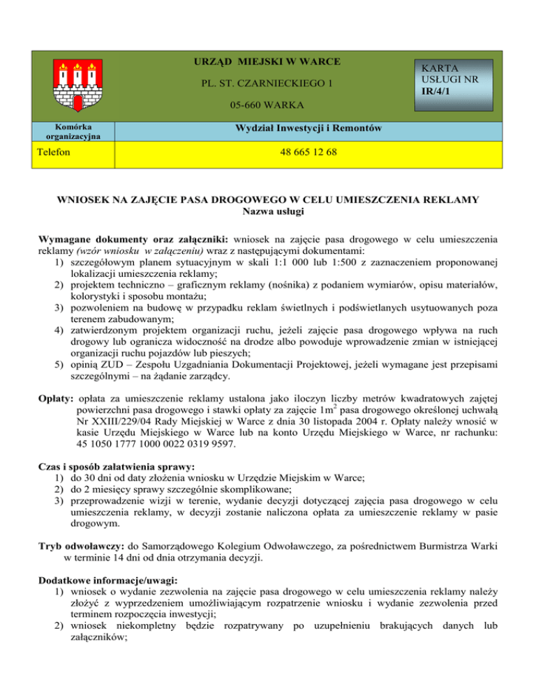 URZĄD MIEJSKI W WARCE PL. ST. CZARNIECKIEGO 1 KARTA USŁUGI NR IR/4/1 05-660 WARKA Komórka organizacyjna Telefon Wydział Inwestycji i Remontów 48 665 12 68 WNIOSEK NA ZAJĘCIE PASA DROGOWEGO W CELU UMIESZCZENIA REKLAMY Nazwa usługi Wymagane dokumenty oraz załączniki: wniosek na zajęcie pasa drogowego w celu umieszczenia reklamy (wzór wniosku w załączeniu) wraz z następującymi dokumentami: 1) szczegółowym planem sytuacyjnym w skali 1:1 000 lub 1:500 z zaznaczeniem proponowanej lokalizacji umieszczenia reklamy; 2) projektem techniczno – graficznym reklamy (nośnika) z podaniem wymiarów, opisu materiałów, kolorystyki i sposobu montażu; 3) pozwoleniem na budowę w przypadku reklam świetlnych i podświetlanych usytuowanych poza terenem zabudowanym; 4) zatwierdzonym projektem organizacji ruchu, jeżeli zajęcie pasa drogowego wpływa na ruch drogowy lub ogranicza widoczność na drodze albo powoduje wprowadzenie zmian w istniejącej organizacji ruchu pojazdów lub pieszych; 5) opinią ZUD – Zespołu Uzgadniania Dokumentacji Projektowej, jeżeli wymagane jest przepisami szczególnymi – na żądanie zarządcy. Opłaty: opłata za umieszczenie reklamy ustalona jako iloczyn liczby metrów kwadratowych zajętej powierzchni pasa drogowego i stawki opłaty za zajęcie 1m2 pasa drogowego określonej uchwałą Nr XXIII/229/04 Rady Miejskiej w Warce z dnia 30 listopada 2004 r. Opłaty należy wnosić w kasie Urzędu Miejskiego w Warce lub na konto Urzędu Miejskiego w Warce, nr rachunku: 45 1050 1777 1000 0022 0319 9597. Czas i sposób załatwienia sprawy: 1) do 30 dni od daty złożenia wniosku w Urzędzie Miejskim w Warce; 2) do 2 miesięcy sprawy szczególnie skomplikowane; 3) przeprowadzenie wizji w terenie, wydanie decyzji dotyczącej zajęcia pasa drogowego w celu umieszczenia reklamy, w decyzji zostanie naliczona opłata za umieszczenie reklamy w pasie drogowym. Tryb odwoławczy: do Samorządowego Kolegium Odwoławczego, za pośrednictwem Burmistrza Warki w terminie 14 dni od dnia otrzymania decyzji. Dodatkowe informacje/uwagi: 1) wniosek o wydanie zezwolenia na zajęcie pasa drogowego w celu umieszczenia reklamy należy złożyć z wyprzedzeniem umożliwiającym rozpatrzenie wniosku i wydanie zezwolenia przed terminem rozpoczęcia inwestycji; 2) wniosek niekompletny będzie rozpatrywany po uzupełnieniu brakujących danych lub załączników; 3) zezwolenie na zajęcie pasa drogowego w celu umieszczenia reklamy wydaje się na czas określony; 4) ze względu na potrzeby związane z zarządzeniem drogami, wymogi wynikające z warunków technicznych dróg publicznych albo bezpieczeństwa ruchu drogowego, może nastąpić odmowa wydania zezwolenia; 5) w zezwoleniu określa się m. in. cel i okres zajęcia pasa drogowego, powierzchnię reklamy oraz wysokość opłaty za zajęcie pasa drogowego oraz sposób jej uiszczenia; 6) przed faktycznym umieszczeniem reklamy w pasie drogowym należy wystąpić o wydanie odrębnego zezwolenia na zajęcie pasa drogowego drogi gminnej w celu prowadzenia robót; 7) reklama umieszczana na zabytku wpisanym do rejestru zabytków wymaga również odrębnego pozwolenia wojewódzkiego konserwatora zabytków. Podstawa prawna: ustawa z dnia 14 czerwca 1960 r. – Kodeks postępowania administracyjnego (tekst jednolity: Dz. U. z 2013 r., poz. 267 z późn. zm.); ustawa z dnia 21 marca 1985 r. o drogach publicznych (tekst jednolity: Dz. U. z 2013 r., poz. 260 z późn. zm. ); ustawa z dnia 16 listopada 2006 r., o opłacie skarbowej (tekst jednolity: Dz. U. z 2012 r. poz. 1282 z późn. zm.); uchwała Nr XXIII/229/04 Rady Miejskiej w Warce z dnia 30 lipca 2004 r. w sprawie ustalenia opłat za zajęcie pasa drogowego dróg gminnych na cele nie związane z budową, przebudową, remontem, utrzymaniem i ochroną dróg; rozporządzenie Rady Ministrów z dnia 1 czerwca 2004 r., w sprawie określenia warunków udzielania zezwoleń na zajęcie pasa drogowego (Dz. U. z 2004 r., Nr 140, poz. 1481); rozporządzenie Ministra Transportu i Gospodarki Morskiej z dnia 2 marca 1999 r. w sprawie warunków technicznych, jakim powinny odpowiadać drogi publiczne i ich usytuowanie (Dz. U. z 1999 r., Nr 43, poz. 430 z późn. zm). Opracował/ła: Anna Sowińska Zaakceptował/ła: Ewa Belicka Zatwierdził/ła: Teresa Pawelczyk