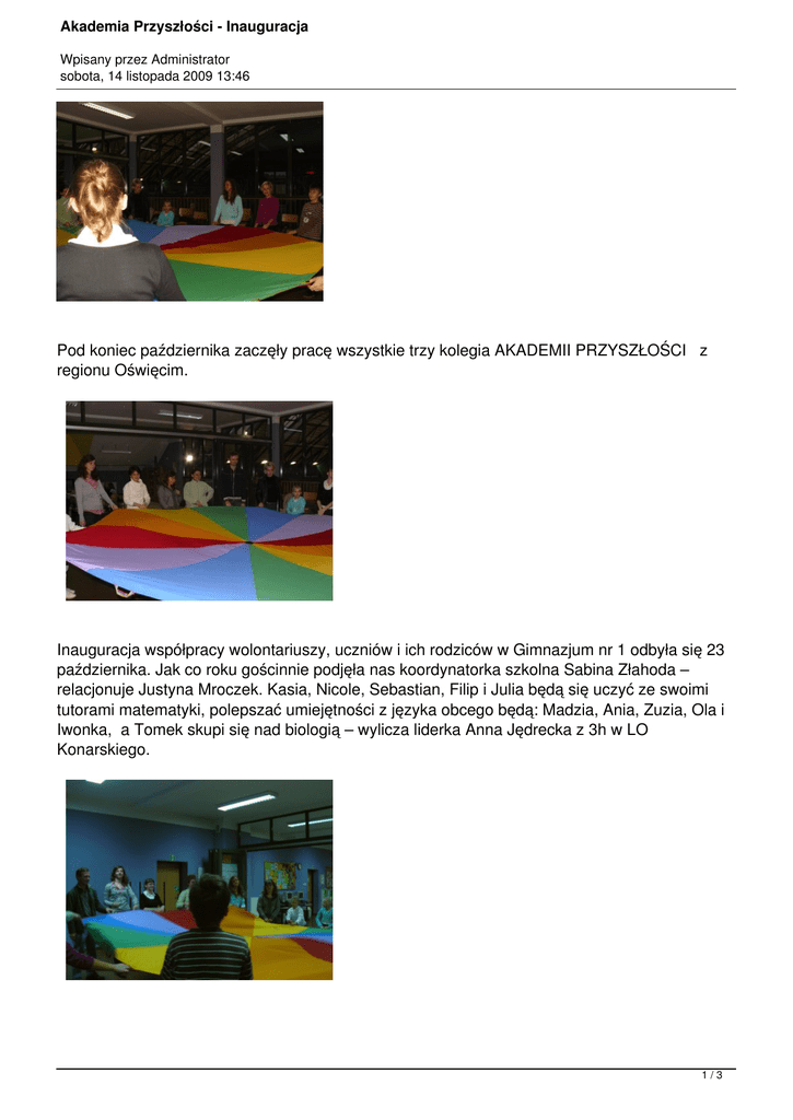 Akademia Przyszłości - Inauguracja Wpisany przez Administrator sobota, 14 listopada 2009 13:46 Pod koniec października zaczęły pracę wszystkie trzy kolegia AKADEMII PRZYSZŁOŚCI z regionu Oświęcim. Inauguracja współpracy wolontariuszy, uczniów i ich rodziców w Gimnazjum nr 1 odbyła się 23 października. Jak co roku gościnnie podjęła nas koordynatorka szkolna Sabina Złahoda – relacjonuje Justyna Mroczek. Kasia, Nicole, Sebastian, Filip i Julia będą się uczyć ze swoimi tutorami matematyki, polepszać umiejętności z języka obcego będą: Madzia, Ania, Zuzia, Ola i Iwonka, a Tomek skupi się nad biologią – wylicza liderka Anna Jędrecka z 3h w LO Konarskiego. 1/3 Akademia Przyszłości - Inauguracja Wpisany przez Administrator sobota, 14 listopada 2009 13:46 27 października w Szkole Podstawowej w Rajsku poznawaliśmy się i bawiliśmy razem z dziećmi i ich rodzicami oraz koordynatorką szkolną Reginą Ilich – opowiada liderka Katarzyna Krupa z 3 c. Zabawa kolorową chustą Klanza wzbudziła wiele pozytywnych emocji zarówno wśród dzieci, wolontariuszy jak i rodziców. Królową nauk, matematyką, zajmą się wraz z wolontariuszami Iza, Dominika i Ewelina, a Kamil, dwie Natalie, Roksana i Damian popracują nad kilkoma przedmiotami- dodaje koliderka Anna Żurek z 3 c. Dzień później - 28 października - była inauguracja w Gimnazjum nr 2, gdzie miłe spotkanie z dziećmi i rodzicami przygotowały koordynatorki szkolne: Magdalena Jeleń i Katarzyna Krupka. Tylko Aneta będzie zgłębiać tajniki chemii, a Sara, trzy Angeliki, Dominika, Michał i Klaudia będą się uczyć matematyki ze swymi tutorami – informują liderki Justyna Erhardt i Paulina Hawrylczuk z 3 c. Niektórzy wolontariusze pracują kolejny rok z tym samym dzieckiem, a inni mają nowego ucznia lub przystąpili do programu po raz pierwszy. Większość już dzieliła się pozytywnymi wrażeniami na temat pierwszych zajęć, jakie przeprowadzili. Kontakt: Justyna Mroczek 2/3 Akademia Przyszłości - Inauguracja Wpisany przez Administrator sobota, 14 listopada 2009 13:46 3/3
