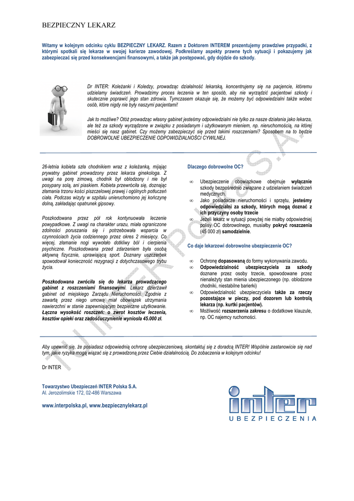 BEZPIECZNY LEKARZ Witamy w kolejnym odcinku cyklu BEZPIECZNY LEKARZ. Razem z Doktorem INTEREM prezentujemy prawdziwe przypadki, z którymi spotkali się lekarze w swojej karierze zawodowej. Podkreślamy aspekty prawne tych sytuacji i pokazujemy jak zabezpieczać się przed konsekwencjami finansowymi, a takŜe jak postępować, gdy dojdzie do szkody. Dr INTER: KoleŜanki i Koledzy, prowadząc działalność lekarską, koncentrujemy się na pacjencie, któremu udzielamy świadczeń. Prowadzimy proces leczenia w ten sposób, aby nie wyrządzić pacjentowi szkody i skutecznie poprawić jego stan zdrowia. Tymczasem okazuje się, Ŝe moŜemy być odpowiedzialni takŜe wobec osób, które nigdy nie były naszymi pacjentami! Jak to moŜliwe? OtóŜ prowadząc własny gabinet jesteśmy odpowiedzialni nie tylko za nasze działania jako lekarza, ale teŜ za szkody wyrządzone w związku z posiadanym i uŜytkowanym mieniem, np. nieruchomością, na której mieści się nasz gabinet. Czy moŜemy zabezpieczyć się przed takimi roszczeniami? Sposobem na to będzie DOBROWOLNE UBEZPIECZENIE ODPOWIDZIALNOŚCI CYWILNEJ. 26-letnia kobieta szła chodnikiem wraz z koleŜanką, mijając prywatny gabinet prowadzony przez lekarza ginekologa. Z uwagi na porę zimową, chodnik był oblodzony i nie był posypany solą, ani piaskiem. Kobieta przewróciła się, doznając złamania trzonu kości piszczelowej prawej i ogólnych potłuczeń ciała. Podczas wizyty w szpitalu unieruchomiono jej kończynę dolną, zakładając opatrunek gipsowy. Poszkodowana przez pół rok kontynuowała leczenie powypadkowe. Z uwagi na charakter urazu, miała ograniczone zdolności poruszania się i potrzebowała wsparcia w czynnościach Ŝycia codziennego przez okres 2 miesięcy. Co więcej, złamanie nogi wywołało dotkliwy ból i cierpienia psychiczne. Poszkodowana przed zdarzeniem była osobą aktywną fizycznie, uprawiającą sport. Doznany uszczerbek spowodował konieczność rezygnacji z dotychczasowego trybu Ŝycia. Poszkodowana zwróciła się do lekarza prowadzącego gabinet z roszczeniami finansowymi. Lekarz dzierŜawił gabinet od miejskiego Zarządu Nieruchomości. Zgodnie z zawartą przez niego umową miał obowiązek utrzymania nawierzchni w stanie zapewniającym bezpieczne uŜytkowanie. Łączna wysokość roszczeń: o zwrot kosztów leczenia, kosztów opieki oraz zadośćuczynienie wyniosła 45.000 zł. Dlaczego dobrowolne OC? • • • Ubezpieczenie obowiązkowe obejmuje wyłącznie szkody bezpośrednio związane z udzielaniem świadczeń medycznych. Jako posiadacze nieruchomości i sprzętu, jesteśmy odpowiedzialni za szkody, których mogą doznać z ich przyczyny osoby trzecie JeŜeli lekarz w sytuacji powyŜej nie miałby odpowiedniej polisy OC dobrowolnego, musiałby pokryć roszczenia (45 000 zł) samodzielnie. Co daje lekarzowi dobrowolne ubezpieczenie OC? • • • • Ochronę dopasowaną do formy wykonywania zawodu. Odpowiedzialność ubezpieczyciela za szkody doznane przez osoby trzecie, spowodowane przez nienaleŜyty stan mienia ubezpieczonego (np. oblodzone chodniki, niestabilne barierki) Odpowiedzialność ubezpieczyciela takŜe za rzeczy pozostające w pieczy, pod dozorem lub kontrolą lekarza (np. kurtki pacjentów). MoŜliwość rozszerzenia zakresu o dodatkowe klauzule, np. OC najemcy ruchomości. Aby upewnić się, Ŝe posiadasz odpowiednią ochronę ubezpieczeniową, skontaktuj się z doradcą INTER! Wspólnie zastanowicie się nad tym, jakie ryzyka mogą wiązać się z prowadzoną przez Ciebie działalnością. Do zobaczenia w kolejnym odcinku! Dr INTER Towarzystwo Ubezpieczeń INTER Polska S.A. Al. Jerozolimskie 172, 02-486 Warszawa www.interpolska.pl, www.bezpiecznylekarz.pl