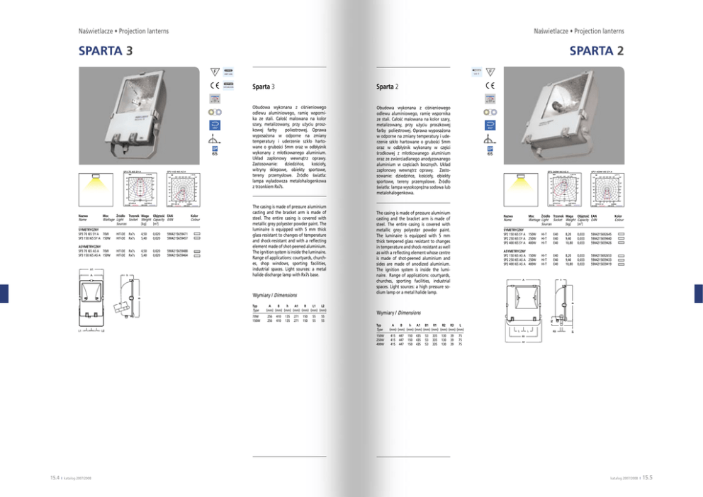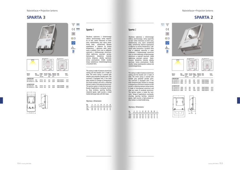 Naświetlacze • Projection lanterns Naświetlacze • Projection lanterns SPARTA 2 SPARTA 3 Nazwa Name Moc Źródło Trzonek Waga Objętość EAN Wattage Light Socket Weight Capacity EAN Sources [kg] [m3] SYMETRYCZNY SP3 70 I65 SY A 70W SP3 150 I65 SY A 150W HIT-DE HIT-DE Rx7s Rx7s 4,50 5,40 0,020 0,020 5904215659471 5904215659457 ASYMETRYCZNY SP3 70 I65 AS A 70W SP3 150 I65 AS A 150W HIT-DE HIT-DE Rx7s Rx7s 4,50 5,40 0,020 0,020 5904215659488 5904215659464 Kolor Colour Sparta 3 Sparta 2 Obudowa wykonana z ciśnieniowego odlewu aluminiowego, ramię wspornika ze stali. Całość malowana na kolor szary, metalizowany, przy użyciu proszkowej farby poliestrowej. Oprawa wyposażona w odporne na zmiany temperatury i uderzenie szkło hartowane o grubości 5mm oraz w odbłyśnik wykonany z młotkowanego aluminium. Układ zapłonowy wewnątrz oprawy. Zastosowanie: dziedzińce, kościoły, witryny sklepowe, obiekty sportowe, tereny przemysłowe. Źródło światła: lampa wyładowcza metalohalogenkowa z trzonkiem Rx7s. Obudowa wykonana z ciśnieniowego odlewu aluminiowego, ramię wspornika ze stali. Całość malowana na kolor szary, metalizowany, przy użyciu proszkowej farby poliestrowej. Oprawa wyposażona w odporne na zmiany temperatury i uderzenie szkło hartowane o grubości 5mm oraz w odbłyśnik wykonany w części środkowej z młotkowanego aluminium oraz ze zwierciadlanego anodyzowanego aluminium w częściach bocznych. Układ zapłonowy wewnątrz oprawy. Zastosowanie: dziedzińce, kościoły, obiekty sportowe, tereny przemysłowe. Źródło światła: lampa wysokoprężna sodowa lub metalohalogenkowa. The casing is made of pressure aluminium casting and the bracket arm is made of steel. The entire casing is covered with metallic grey polyester powder paint. The luminaire is equipped with 5 mm thick glass resistant to changes of temperature and shock-resistant and with a reflecting element made of shot-peened aluminium. The ignition system is inside the luminaire. Range of applications: courtyards, churches, shop windows, sporting facilities, industrial spaces. Light sources: a metal halide discharge lamp with Rx7s base. Wymiary / Dimensions Typ Type 70W 150W A B h A1 R L1 L2 (mm) (mm) (mm) (mm) (mm) (mm) (mm) 256 256 410 410 135 135 271 271 150 150 55 55 55 55 The casing is made of pressure aluminium casting and the bracket arm is made of steel. The entire casing is covered with metallic grey polyester powder paint. The luminaire is equipped with 5 mm thick tempered glass resistant to changes in temperature and shock-resistant as well as with a reflecting element whose centre is made of shot-peened aluminium and sides are made of anodized aluminium. The ignition system is inside the luminaire. Range of applications: courtyards, churches, sporting facilities, industrial spaces. Light sources: a high pressure sodium lamp or a metal halide lamp. 150W 250W 400W I katalog 2007/2008 Moc Źródło Trzonek Waga Objętość EAN Wattage Light Socket Weight Capacity EAN Sources [kg] [m3] Kolor Colour SYMETRYCZNY SP2 150 I65 SY A 150W SP2 250 I65 SY A 250W SP2 400 I65 SY A 400W HI-T HI-T HI-T E40 E40 E40 8,20 9,40 10,80 0,033 0,033 0,033 5904215692645 5904215659440 5904215659426 ASYMETRYCZNY SP2 150 I65 AS A 150W SP2 250 I65 AS A 250W SP2 400 I65 AS A 400W HI-T HI-T HI-T E40 E40 E40 8,20 9,40 10,80 0,033 0,033 0,033 5904215692653 5904215659433 5904215659419 Wymiary / Dimensions Typ Type 15.4 Nazwa Name A B h A1 B1 R1 R2 R3 L (mm) (mm) (mm) (mm) (mm) (mm) (mm) (mm) (mm) 415 447 415 447 415 447 150 435 150 435 150 435 53 53 53 335 335 335 130 130 130 39 39 39 75 75 75 katalog 2007/2008 I 15.5