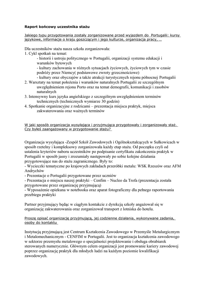 Raport końcowy uczestnika stażu Jakiego typu przygotowania zostały zorganizowane przed wyjazdem do Portugalii: kursy językowe, informacje o kraju goszczącym i jego kulturze, organizacja pracy, … Dla uczestników stażu nasza szkoła zorganizowała: 1. Cykl spotkań na temat: - historii i ustroju politycznego w Portugalii, organizacji systemu edukacji i warunków bytowych - kultury zachowania w różnych sytuacjach życiowych, życiowych tym w czasie podróży przez Niemcy( podstawowe zwroty grzecznościowe) - kultury oraz obyczajów a także atrakcji turystycznych rejonu północnej Portugalii 2. Warsztaty na temat położenia i warunków naturalnych Portugalii ze szczególnym uwzględnieniem rejonu Porto oraz na temat demografii, komunikacji i zasobów naturalnych 3. Intensywny kurs języka angielskiego z szczególnym uwzględnieniem terminów technicznych (technicznych wymiarze 30 godzin) 4. Spotkanie organizacyjne z rodzicami – prezentacja miejsca praktyk, miejsca zakwaterowania oraz ważnych terminów W jaki sposób organizacja wysyłająca i przyjmująca przygotowały i zorganizowały staż. Czy byłeś zaangażowany w przygotowanie stażu? Organizacja wysyłająca -Zespół Szkół Zawodowych i Ogólnokształcących w Sułkowicach w sposób rzetelny i kompleksowy zorganizowała każdy etap stażu. Od początku czyli od ustalenia kryteriów naboru uczestników po podpisanie certyfikatu zakończenia praktyk w Portugalii w sposób jasny i zrozumiały następowały po sobie kolejne działania przygotowujące nas do stażu zagranicznego. Były to: - Wycieczki tematyczne po krajowych zakładach przeróbki metalu: WSK Rzeszów oraz AFM Andrychów - Prezentacje o Portugalii przygotowane przez uczniów - Prezentacja o miejscu naszej praktyki – Cenfim – Nucleo da Trofa (prezentacja została przygotowane przez organizację przyjmującą) - Wyposażenie opiekuna w notebooka oraz aparat fotograficzny dla pełnego raportowania przebiegu praktyki Partner przyjmujący będąc w ciągłym kontakcie z dyrekcją szkoły angażował się w organizację zakwaterowania oraz zorganizował transport z lotniska do hotelu. Proszę opisać organizację przyjmującą, jej codzienne działania, wykonywane zadania, osoby do kontaktu Instytucją przyjmującą jest Centrum Kształcenia Zawodowego w Przemyśle Metalurgicznym i Metalomechanicznym - CENFIM w Portugalii. Jest to organizacja kształcenia zawodowego w sektorze przemysłu metalowego o specjalności projektowanie i obsługa obrabiarek sterowanych numerycznie. Głównym celem organizacji jest promowanie kariery zawodowej poprzez organizację praktyk dla młodych ludzi na każdym poziomie kwalifikacji zawodowych. Każdego dnia odbywały się zajęcia prowadzone przez nauczycieli z Cenfimu w języku angielskim. Osobą do kontaktu był dyrektor tamtejszego centrum pan Branco Rodrigues, Director do Cenfim, a z naszej szkoły pani dyrektor mgr inż. Aleksandra Korpal Podaj korzyści ze stażu za granicą i oczekiwany wpływ stażu na Twoje życie zawodowe/osobiste. Największe korzyści według mnie to znaczne podniesienie kwalifikacji i umiejętności zarówno przez szkolenia odbyte przed wyjazdem (doskonalenie języka angielskiego i poznanie od strony praktycznej funkcjonowania nowoczesnych zakładów przemysłu metalowego) jak i podczas stażu odbywanego w Portugalii. Zachodnia wiedza i bardzo wysoki poziom zaawansowania technologicznego pracowni dydaktycznych sprzyjały lepszemu poznaniu technologii produkcji materiałów metalowych. Staż odbywany w innym kraju jest bardzo wielkim przeżyciem. Stwarza możliwość konfrontacji systemów edukacji i budowania relacji między uczestnikami tej praktyki. Myślę, że ten wyjazd wpłynął bardzo pozytywnie na mnie, pokazał że potrafię sobie poradzić w obcym miejscu i dostosować się do nowego miejsca pracy i nauki. Bardzo się cieszę że poznałem tak piękny i ciekawy kraj. Zwiedziłem wiele pięknych okolic (Braga, Porto) oraz świętych miejsc (Fatama) Osobiste korzyści to przede wszystkim bagaż nowych doświadczeń oraz brak lęku przed wyjazdem do innego kraju. Jakie praktyczne działania miały miejsce w odniesieniu do Twojego pobytu za granicą: związane z podróżą, ubezpieczeniem, zakwaterowaniem, transportem na miejscu, … Tydzień przed wylotem zostało zorganizowane spotkanie uczestników stażu oraz ich rodziców. Na spotkaniu otrzymaliśmy pisemnie wszystkie ważne informacje dotyczące ważnych aspektów praktyki: m.in. miejsce zakwaterowania i odbywania praktyk, dokładną datę wyjazdu i powrotu, listę potrzebnych rzeczy, informacje osobach odpowiedzialnych za nas oraz osobach do kontaktu. Informacje dotyczące ubezpieczenia oraz sposoby przekazania kieszonkowego. Wspólnie z rodzicami zostały sprawdzone umowy stażu a następnie podpisano je. Wszyscy uczestnicy mieli opłacone koszty zakwaterowania i przelotu w obie strony. Natomiast każdy z nas zobowiązany był założyć konto walutowe z kartą bankomatową, na które zostało wpłacone kieszonkowe w wysokości 1015,00 EURO. Korzystanie z karty było najlepszą i najtańszą formą płatności w Portugalii z uwagi na brak prowizji przy płaceniu. Co robiliście w wolnym czasie. Wolny czas spędzaliśmy przede wszystkim na poznawaniu atrakcyjnych miejsc: Santo Tirso, Porto, Braga Fatima, Guimaraes (korzystając z przewodnika Pascala otrzymanego przed wyjazdem razem z rozmówkami portugalskimi. W sąsiedztwie naszego hotelu w Santo Tirso znajdował się wspaniały kompleks sportowy z którego często korzystaliśmy( szczególnie upodobaliśmy sobie korty tenisowe ze sztuczną trawą. Bardzo atrakcyjne i dające dużo frajdy były trzy weekendowe wyjazdy nad Ocean Atlantycki do miejscowości Povoa de Varzim. Piotr Tatka – uczestnik stażu w Portugalii