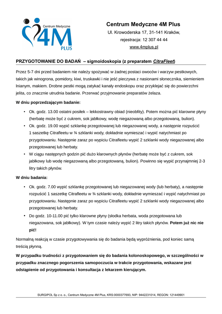 Centrum Medyczne 4M Plus Ul. Krowoderska 17, 31-141 Kraków, rejestracja: 12 307 44 44 www.4mplus.pl PRZYGOTOWANIE DO BADAŃ – sigmoidoskopia (z preparatem CitraFleet) Przez 5-7 dni przed badaniem nie należy spożywać w żadnej postaci owoców i warzyw pestkowych, takich jak winogrona, pomidory, kiwi, truskawki i nie jeść pieczywa z nasionami słonecznika, siemieniem lnianym, makiem. Drobne pestki mogą zatykać kanały endoskopu oraz przyklejać się do powierzchni jelita, co znacznie utrudnia badanie. Przerwać przyjmowanie preparatów żelaza. W dniu poprzedzającym badanie: • Ok. godz. 13.00 ostatni posiłek – lekkostrawny obiad (nieobfity). Potem można pić klarowne płyny (herbatę może być z cukrem, sok jabłkowy, wodę niegazowaną albo przegotowaną, bulion). • Ok. godz. 19.00 wypić szklankę przegotowanej lub niegazowanej wody, a następnie rozpuścić 1 saszetkę Citrafleetu w ¾ szklanki wody, dokładnie wymieszać i wypić natychmiast po przygotowaniu. Następnie zaraz po wypiciu Citrafleetu wypić 2 szklanki wody niegazowanej albo przegotowanej lub herbaty. • W ciągu następnych godzin pić dużo klarownych płynów (herbatę może być z cukrem, sok jabłkowy lub wodę niegazowaną albo przegotowaną, bulion). Powinno się wypić przynajmniej 2-3 litry takich płynów. W dniu badania: • Ok. godz. 7.00 wypić szklankę przegotowanej lub niegazowanej wody (lub herbaty), a następnie rozpuścić 1 saszetkę Citrafleetu w ¾ szklanki wody, dokładnie wymieszać i wypić natychmiast po przygotowaniu. Następnie zaraz po wypiciu Citrafleetu wypić 2 szklanki wody niegazowanej albo przegotowanej lub herbaty. • Do godz. 10-11.00 pić tylko klarowne płyny (słodka herbata, woda przegotowana lub niegazowana, sok jabłkowy). W tym czasie należy wypić 2 litry takich płynów. Potem już nic nie pić! Normalną reakcją w czasie przygotowywania się do badania będą wypróżnienia, pod koniec samą treścią płynną. W przypadku trudności z przygotowaniem się do badania kolonoskopowego, w szczególności w przypadku znacznego pogorszenia samopoczucia w trakcie przygotowania, wskazane jest odstąpienie od przygotowania i konsultacja z lekarzem kierującym. SURGIPOL Sp z o. o., Centrum Medyczne 4M Plus, KRS:0000377693, NIP: 9442231014, REGON: 121449901