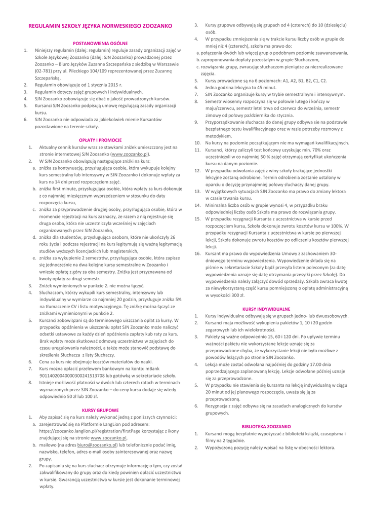 REGULAMIN SZKOŁY JĘZYKA NORWESKIEGO ZOOZANKO POSTANOWIENIA OGÓLNE Niniejszy regulamin (dalej: regulamin) reguluje zasady organizacji zajęć w Szkole Językowej Zoozanko (dalej: SJN Zoozanko) prowadzonej przez Zoozanko – Biuro Języków Zuzanna Szczepańska z siedzibą w Warszawie (02-781) przy ul. Pileckiego 104/109 reprezentowanej przez Zuzannę Szczepańską. Regulamin obowiązuje od 1 stycznia 2015 r. Regulamin dotyczy zajęć grupowych i indywidualnych. SJN Zoozanko zobowiązuje się dbać o jakość prowadzonych kursów. Kursanci SJN Zoozanko podpisują umowę regulującą zasady organizacji kursu. SJN Zoozanko nie odpowiada za jakiekolwiek mienie Kursantów pozostawione na terenie szkoły. 1. 2. 3. 4. 5. 6. 1. 2. a. b. c. d. e. 3. 4. 5. 6. 7. 8. OPŁATY I PROMOCJE Aktualny cennik kursów wraz ze stawkami zniżek umieszczony jest na stronie internetowej SJN Zoozanko (www.zoozanko.pl). W SJN Zoozanko obowiązują następujące zniżki na kurs: zniżka za kontynuację, przysługująca osobie, która wykupuje kolejny kurs semestralny lub intensywny w SJN Zoozanko i dokonuje wpłaty za kurs na 14 dni przed rozpoczęciem zajęć. zniżka first minute, przysługująca osobie, która wpłaty za kurs dokonuje z co najmniej miesięcznym wyprzedzeniem w stosunku do daty rozpoczęcia kursu, zniżka za przyprowadzenie drugiej osoby, przysługująca osobie, która w momencie rejestracji na kurs zaznaczy, że razem z nią rejestruje się druga osoba, która nie uczestniczyła wcześniej w zajęciach organizowanych przez SJN Zoozanko, zniżka dla studentów, przysługująca osobom, które nie ukończyły 26 roku życia i podczas rejestracji na kurs legitymują się ważną legitymacją studiów wyższych licencjackich lub magisterskich, zniżka za wykupienie 2 semestrów, przysługująca osobie, która zapisze się jednocześnie na dwa kolejne kursy semestralne w Zoozanko i wniesie opłatę z góry za oba semestry. Zniżka jest przyznawana od kwoty opłaty za drugi semestr. Zniżek wymienionych w punkcie 2. nie można łączyć. Słuchaczom, którzy wykupili kurs semestralny, intensywny lub indywidualny w wymiarze co najmniej 20 godzin, przysługuje zniżka 5% na tłumaczenie CV i listu motywacyjnego. Tę zniżkę można łączyć ze zniżkami wymienionymi w punkcie 2. Kursanci zobowiązani są do terminowego uiszczania opłat za kursy. W przypadku opóźnienia w uiszczeniu opłat SJN Zoozanko może naliczyć odsetki ustawowe za każdy dzień opóźnienia zapłaty kub raty za kurs. Brak wpłaty może skutkować odmową uczestnictwa w zajęciach do czasu uregulowania należności, a także może stanowić podstawę do skreślenia Słuchacza z listy Słuchaczy. Cena za kurs nie obejmuje kosztów materiałów do nauki. Kurs można opłacić przelewem bankowym na konto: mBank 90114020040000300241513708 lub gotówką w sekretariacie szkoły. Istnieje możliwość płatności w dwóch lub czterech ratach w terminach wyznaczonych przez SJN Zoozanko – do ceny kursu dodaje się wtedy odpowiednio 50 zł lub 100 zł. KURSY GRUPOWE 1. Aby zapisać się na kurs należy wykonać jedną z poniższych czynności: a. zarejestrować się na Platformie LangLion pod adresem: https://zoozanko.langlion.pl/registration/firstPage korzystając z ikony znajdującej się na stronie www.zoozanko.pl, b. mailowo (na adres [email protected]) lub telefonicznie podać imię, nazwisko, telefon, adres e-mail osoby zainteresowanej oraz nazwę grupy. 2. Po zapisaniu się na kurs słuchacz otrzymuje informację o tym, czy został zakwalifikowany do grupy oraz do kiedy powinien opłacić uczestnictwo w kursie. Gwarancją uczestnictwa w kursie jest dokonanie terminowej wpłaty. 3. Kursy grupowe odbywają się grupach od 4 (czterech) do 10 (dziesięciu) osób. 4. W przypadku zmniejszenia się w trakcie kursu liczby osób w grupie do mniej niż 4 (czterech), szkoła ma prawo do: a. połączenia dwóch lub więcej grup o podobnym poziomie zaawansowania, b. zaproponowania dopłaty pozostałym w grupie Słuchaczom, c. rozwiązania grupy, zwracając słuchaczom pieniądze za niezrealizowane zajęcia. 5. Kursy prowadzone są na 6 poziomach: A1, A2, B1, B2, C1, C2. 6. Jedna godzina lekcyjna to 45 minut. 7. SJN Zoozanko organizuje kursy w trybie semestralnym i intensywnym. 8. Semestr wiosenny rozpoczyna się w połowie lutego i kończy w maju/czerwcu, semestr letni trwa od czerwca do września, semestr zimowy od połowy października do stycznia. 9. Przyporządkowanie słuchacza do danej grupy odbywa sie na podstawie bezpłatnego testu kwalifikacyjnego oraz w razie potrzeby rozmowy z metodykiem. 10. Na kursy na poziomie początkującym nie ma wymagań kwalifikacyjnych. 11. Kursanci, którzy zaliczyli test końcowy uzyskując min. 70% oraz uczestniczyli w co najmniej 50 % zajęć otrzymują certyfikat ukończenia kursu na danym poziomie. 12. W przypadku odwołania zajęć z winy szkoły brakujące jednostki lekcyjne zostaną odrobione. Termin odrobienia zostanie ustalony w oparciu o decyzję przynajmniej połowy słuchaczy danej grupy. 13. W wyjątkowych sytuacjach SJN Zoozanko ma prawo do zmiany lektora w czasie trwania kursu. 14. Minimalna liczba osób w grupie wynosi 4, w przypadku braku odpowiedniej liczby osób Szkoła ma prawo do rozwiązania grupy. 15. W przypadku rezygnacji Kursanta z uczestnictwa w kursie przed rozpoczęciem kursu, Szkoła dokonuje zwrotu kosztów kursu w 100%. W przypadku rezygnacji Kursanta z uczestnictwa w kursie po pierwszej lekcji, Szkoła dokonuje zwrotu kosztów po odliczeniu kosztów pierwszej lekcji. 16. Kursant ma prawo do wypowiedzenia Umowy z zachowaniem 30dniowego terminu wypowiedzenia. Wypowiedzenie składa się na piśmie w sekretariacie Szkoły bądź przesyła listem poleconym (za datę wypowiedzenia uznaje się datę otrzymania przesyłki przez Szkołę). Do wypowiedzenia należy załączyć dowód sprzedaży. Szkoła zwraca kwotę za niewykorzystaną część kursu pomniejszoną o opłatę admi
