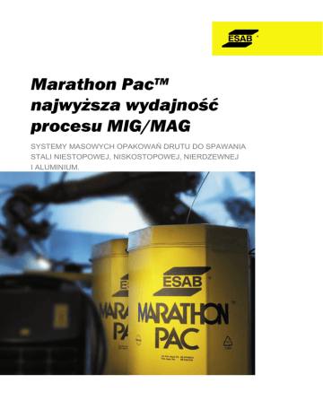 Marathon PacTM najwy¿sza wydajnoœæ procesu MIG/MAG SYSTEMY MASOWYCH OPAKOWAŃ DRUTU DO SPAWANIA STALI NIESTOPOWEJ, NISKOSTOPOWEJ, NIERDZEWNEJ I ALUMINIUM. ESAB Marathon PacTM Zwiêkszona wydajnoœæ i oszczêdnoœci Czas przestoju jest kosztowny, a jego dwa główne powody, czyli wymiana szpuli oraz problemy z posuwem drutu, mogą zostać zredukowane dzięki zestawom Marathon Pac firmy ESAB. Drut spawalniczy, którego oczekiwa³y Twoje urz¹dzenia AristoRod - druty MAG bez pokrycia miedziowego wytwarzane technologią ASC oraz druty nierdzewne z matową powierzchnią do spawania metodą MIG - to dwa przykłady nowoczesnych produktów firmy ESAB dostępnych w zestawach Marathon Pac. We made this wire matt – so your productivity can shine. zredukować czas przestoju aż o 95% w porównaniu z użyciem szpul o masie 18 kg, jednocześnie wydłużając czas włączenia łuku i zmniejszając ilość przerw w pracy. Każde opakowanie wysokojakościowego Zmniejsz ilość poprawek i braków drutu ma pojemność kilkunastu zwykłych Końcowa część drutu na szpuli często szpul. Dzięki rzadszej konieczności ich bywa odkształcona, co zwiększa ryzyko wymiany oraz większej wad w złączu. stabilności procesu Problemy z płynnym Marathon Pac pomaga promować proces spawania (płynny posuwem drutu mogą „odchudzonej produkcji” posuw drutu) większa być przyczyną braków poprzez: jest wydajność procesu lub kosztownych i wyższa jakość produktu. ● redukcję czasu przestoju poprawek. ● stabilność procesu spawania Każdy Marathon Pac Dalsze korzyści to prosta ● jakość spoin instalacja i obsługa jest napełniany przy ● wydajne gospodarowanie pojemnika z drutem użyciu specjalnej materiałami spawalniczymi oraz utylizacja pustych techniki nawijania opakowań. z przeciwskrętem, co zapewnia, że drut wysuwany Rodzina produktów Marathon Pac z opakowania jest prosty i dokładnie obejmuje druty wysokiej jakości do pozycjonowany podczas spawania. spawania stali węglowych, nierdzewnych, To z kolei oznacza większą stabilność aluminium oraz do lutospawania MIG, procesu i mniejszą ilość rozprysków. pełen zakres drutów wykonanych nowymi technologiami (OK AristoRod, matowe Zaoszczędź na częściach zamiennych druty nierdzewne), nową generację drutów i zmniejsz zużycie podajnika drutu aluminiowych, niestopowe i niskostopowe Ponieważ nie ma w zestawie obracających druty rdzeniowe oraz do spawania łukiem się szpul a wysuwany drut jest o wiele krytym a także rdzeniowe druty prostszy, zmniejsza się znacznie zużycie nierdzewne. podajnika i innych części sprzętu. Odkryj wszystkie możliwości oszczędzania Marathon Pac zapewnia oszczędności w cyklu produkcyjnym spawania metodą MIG/MAG lub łukiem krytym, zarówno obsługiwanym ręcznie jak i w pełni zautomatyzowanym, niezależnie od miejscowych kosztów robocizny. Skróć przestoje w spawaniu metodą MIG/MAG Stosując Marathon Pac można Zaoszczędź czas obsługi i zmniejsz koszty utylizacji Wbudowane uchwyty do podnoszenia oraz szereg akcesoriów ułatwiają obsługę i transport zestawu z magazynu do stanowiska pracy. Gdy ośmiokątny pojemnik jest już pusty, składa się go w płaski pakiet zajmujący niewiele miejsca i łatwy do usunięcia. Co więcej, materiał opakowania Marathon Pac jest w 100% przetwarzalny. - w procesach „odchudzonej produkcji” Oszczêdnoœci w ca³ym cyklu produkcyjnym spawania metod¹ MIG/MAG Korzystając z Marathon Pac, oszczędzamy Typowe oszczędności dla profesjonalnych użytkowników - porównanie Marathon Pac ze szpulami 18 kg. w całym cyklu produkcyjnym spawania metodą MIG/MAG. Nawet w krajach Środowisko Środowisko Środowisko o niskich kosztach robocizny Marathon o niskich o wysokich w pełni Pac pozwoli zaoszczędzić przynajmniej kosztach kosztach zautomatyzowane 9 eurocentów na kilogramie drutu tylko robocizny robocizny na samym czasie przestoju, a należy koszty eksploatacji do tego dodać jeszcze inne korzyści. 10 50 250 (EUR/godz) Nawet jeśli używasz tylko kilku stanowisk oszczędności do spawania ręcznego, Marathon Pac (EUR na 1 kg także przyniesie Ci oszczędności. Jeśli zużytego drutu) twój zakład jest w pełni zmechanizowany, czas przestoju 0.09 0.43 2.15 lub jeśli zainwestowałeś w stanowiska zrobotyzowane, wtedy skracanie czasu jakość połączeń 0.20 1.00 2.00 przestoju jest o wiele ważniejsze niż zużyte części sprzętu 0.05 0.10 0.20 jednostkowa cena materiałów ogółem 0.34 1.53 4.53 spawalniczych. W tej sytuacji doskonale (EUR na 1 kg drutu) sprawdza się zastosowanie zestawu ogółem Marathon Pac w wersji „Endless” – czyli (EUR na 250 kg 85 383 1088 drutu „bez końca”. Marathon Pac) ogółem (EUR na 475 kg Marathon Pac) 162 727 2066 Zestawienie to zostało sporządzone na podstawie wyników badań otrzymanych od użytkowników zestawów Marathon Pac z różnych gałęzi przemysłu. Obni¿ iloœæ braków, zaoszczêdŸ na czêœciach zamiennych i szybko zu¿ywaj¹cych siê. Podawanie prostego drutu zapewnia prawidłowe płożenie spoiny i obniżenie wskaźnika braków Badania przeprowadzone przez wiodącego zachodnioeuropejskiego producenta przemysłu motoryzacyjnego wykazały, iż oszczędności wynikające z ograniczenia braków w połączeń spawanych oraz czyszczenia złączy po spawaniu wynosiły zaledwie piątą część kwot jakie można uzyskać stosując Marathon Pac. Badania dotyczyły stanowisk roboczych kosztujących 50 euro na godzinę pracy, co odpowiadało dwóm euro na kilogram zużytego drutu spawalniczego. Inna europejska firma motoryzacyjna zgłosiła, iż oszczędności na częściach zamiennych i szybko zużywających się wyniosły 90% po zmianie zwykłych szpul na zestawy Marathon Pac. Był to wynik zastosowania bardziej prostego drutu oraz eliminacja bezwładności obracających się szpul. Dotyczyło to nie tylko prowadników drutu i końcówek prądowych, ale także rolek i silników w pod
