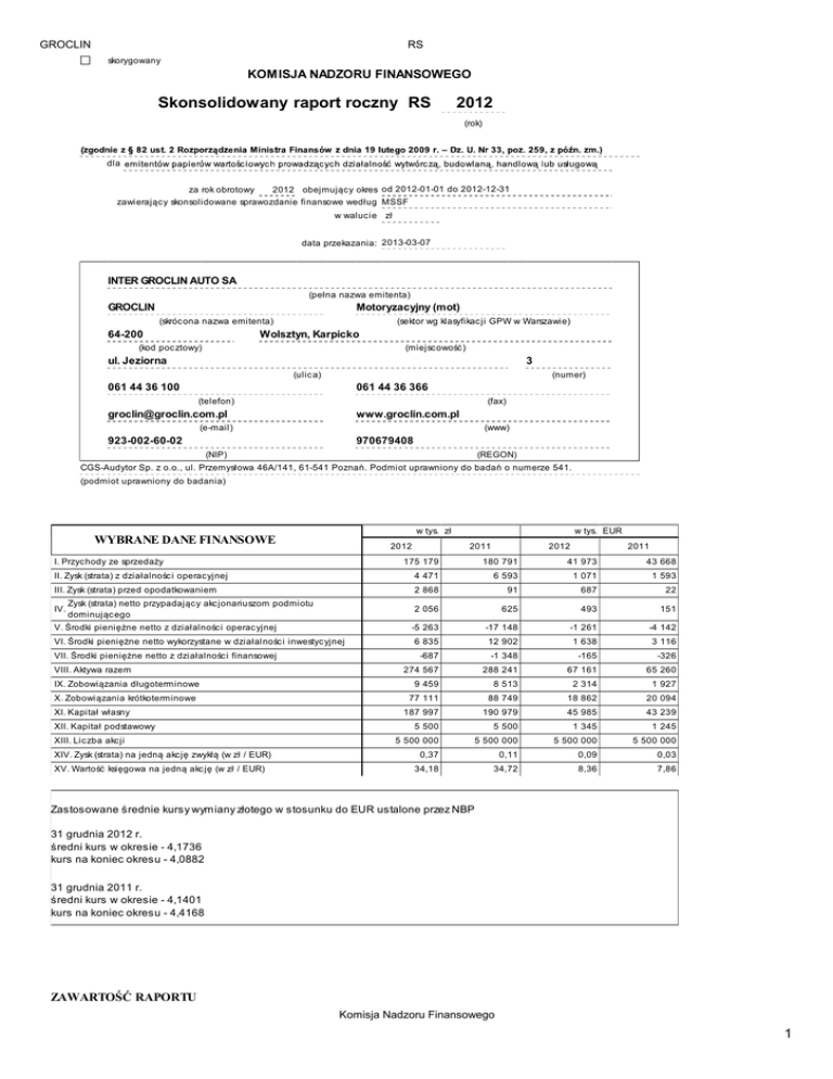 GROCLIN RS skorygowany KOMISJA NADZORU FINANSOWEGO Skonsolidowany raport roczny RS 2012 (rok) dla za rok obrotowy 2012 obejmujący okres od 2012-01-01 do 2012-12-31 zawierający skonsolidowane sprawozdanie finansowe według MSSF w walucie zł data przekazania: 2013-03-07 INTER GROCLIN AUTO SA (pełna nazwa emitenta) GROCLIN Motoryzacyjny (mot) (skróc ona nazwa emitenta) 64-200 (sektor wg klasyfikac ji GPW w Warszawie) Wolsztyn, Karpicko (kod poc ztowy) (miejscowość) ul. Jeziorna 3 (ulic a) (numer) 061 44 36 100 061 44 36 366 (telefon) (fax) [email protected] www.groclin.com.pl (e-mail) (www) 923-002-60-02 970679408 (NIP) (REGON) CGS-Audytor Sp. z o.o., ul. Przemysłowa 46A/141, 61-541 Poznań. Podmiot uprawniony do badań o numerze 541. (podmiot uprawniony do badania) w tys. zł WYBRANE DANE FINANSOWE 2012 I. Przychody ze sprzedaży w tys. EUR 2011 2012 2011 175 179 180 791 41 973 43 668 II. Zysk (strata) z działalnośc i operacyjnej 4 471 6 593 1 071 1 593 III. Zysk (strata) przed opodatkowaniem 2 868 91 687 22 Zysk (strata) netto przypadający akcjonariuszom podmiotu IV. dominując ego 2 056 625 493 151 V. Środki pieniężne netto z działalności operac yjnej -5 263 -17 148 -1 261 -4 142 VI. Środki pieniężne netto wykorzystane w działalnośc i inwestyc yjnej 6 835 12 902 1 638 3 116 -687 -1 348 -165 -326 274 567 288 241 67 161 65 260 VII. Środki pieniężne netto z działalnośc i finansowej VIII. Aktywa razem IX. Zobowiązania długoterminowe 9 459 8 513 2 314 1 927 X. Zobowiązania krótkoterminowe 77 111 88 749 18 862 20 094 187 997 190 979 45 985 43 239 5 500 5 500 1 345 1 245 5 500 000 5 500 000 5 500 000 5 500 000 0,37 0,11 0,09 0,03 34,18 34,72 8,36 7,86 XI. Kapitał własny XII. Kapitał podstawowy XIII. Liczba akcji XIV. Zysk (strata) na jedną akcję zwykłą (w zł / EUR) XV. Wartość księgowa na jedną akc ję (w zł / EUR) Zastosowane średnie kursy wymiany złotego w stosunku do EUR ustalone przez NBP 31 grudnia 2012 r. średni kurs w okresie - 4,1736 kurs na koniec okresu - 4,0882 31 grudnia 2011 r. średni kurs w okresie - 4,1401 kurs na koniec okresu - 4,4168 ZAWARTOŚĆ RAPORTU Komisja Nadzoru Finansowego 1 GROCLIN RS Plik RS_2012_grupa IGA_ESPI.pdf Opis Skonsolidowany raport grupy kapitałowej Inter Groc lin Auto za rok obrotowy 2012. PODPISY WSZYSTKICH CZŁONKÓW ZARZĄDU Data Imię i Nazwisko Stanowisko/Funkc ja Podpis 2013-03-07 Zbigniew Drzymała Prezes Zarządu Zbigniew Drzymała 2013-03-07 Barbara Sikorska Wic eprezes Zarządu ds. handlowyc h Barbara Sikorska Mirosława Doliwa Wic eprezes Zarządu ds. ekonomiczno-finansowych Mirosława Doliwa 2013-03-07 PODPIS OSOBY, KTÓREJ POWIERZONO PROWADZENIE KSIĄG RACHUNKOWYCH Data Imię i Nazwisko Stanowisko/Funkc ja Podpis 2013-03-07 Halina Głuszak Dyrektor ds. finansowych Halina Głuszak Komisja Nadzoru Finansowego 2 Pismo Prezesa Zarządu _______________________________________________ Szanowni Państwo! Skonsolidowany raport roczny za 2012 rok, który pragnę Państwu zaprezentować dotyczy okresu, który w mojej opinii powinien być traktowany jako początek przełomu dla dalszych planów i perspektyw działalności Grupy Kapitałowej Inter Groclin Auto. Przemawia za tym osiągnięta w roku sprawozdawczym poprawa wyników ekonomicznofinansowych oraz stabilizacja i umocnienie stanu wewnętrznego firmy. Jest to przede wszystkim wynik przeprowadzonych w latach 2008-2012 przedsięwzięć restrukturyzacyjnych ukierunkowanych na racjonalizację kosztów, podniesienie wydajności pracy, skorelowanie potencjału produkcyjnego z wielkością zmieniającego się portfela zamówień oraz działań na rzecz umocnienia standingu finansowego Grupy Kapitałowej. Notujemy także stopniową poprawę sytuacji w otoczeniu makroekonomicznym Grupy Kapitałowej wyrażającą się w relacjach z instytucjami finansowymi oraz większą otwartość czołowych koncernów samochodowych do współpracy z takimi podmiotami jak Inter Groclin Auto S.A., które przez swą niezależność, konkurencyjność i innowacyjność są w stanie wygenerować znaczące oszczędności przy zachowaniu niezmiennego reżimu jakościowego produktów i usług, co dotychczasowi monopolistyczni partnerzy. Sprzyja to działaniom marketingowo-handlowym, w wyniku których osiągnięto dobrze rokujący stan kontraktów eksportowych wsparty uregulowanymi stosunkami z instytucjami finansowymi. Rosnąca konkurencyjność gospodarki światowej, zwłaszcza w branży motoryzacyjnej nakazuje potwierdzić słuszność wcześniej podjętych inwestycji na terenie Ukrainy mimo obserwowanego spowolnienia integracji polityczno-gospodarczej tego kraju z Europą. Powyższe okoliczności wsparte doświadczeniem naszej kadry pracowniczej, wysoka jakość typu i jakość wykonania naszych produktów oraz konkurencyjność kosztów wytwarzania i cen pozwalają pozytywnie prognozować dalszy rozwój Grupy Kapitałowej. Problemy stojące nadal przed Zarządem oraz załogą będziemy rozwiązywać, tak jak dotychczas z pełnym zaangażowaniem o czym pragnę zapewnić wszystkich Państwa reprezentujących akcjonariuszy, klientów oraz interesariuszy Grupy Kapitałowej Inter Groclin Auto. Z poważaniem, Zbigniew Drzymała Prezes Zarządu 1 GRUPA KAPITAŁOWA INTER GROCLIN AUTO SKONSOLIDOWANE SPRAWOZDANIE FINANSOWE ZA OKRES OD 1 STYCZNIA 2012 ROKU DO 31 GRUDNIA 2012 ROKU KARPICKO, LUTY 2013 Nazwa grupy kapitałowej: Grupa kapitałowa Inter Groclin Auto Okres objęty sprawozdaniem finansowym: 01.01-31.12.2012 Poziom zaokrągleń: wszystkie kwoty wyrażone są w tysiącach złotych polskich (o ile nie wskazano inaczej) Waluta sprawozdawcza: złoty polski (PLN) SPIS TREŚCI DO SPRAWOZDANIA SKONSOLIDOWANEGO SKONSOLIDOWANE SPRAWOZDANIE Z CAŁKOWITYCH DOCHODÓW GRUPY KAPITAŁOWEJ INTER GROCLIN AUTO ZA OKRES OD 01.01.2012 R. DO 31.12.2012 R. ....................................................................................................................................................