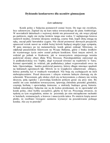 Dyktando konkursowe dla uczniów gimnazjum Lew salonowy Konik polny z Sulęcina postanowił zostać lwem. Do tego nie zwykłym, lecz salonowym. Zapisał się na kurs tańca towarzyskiego do pana Ambrożego. W nowiutkich lakierkach z wężowej skórki nie przesuwał się, ale wręcz płynął po parkiecie, nigdy nie myląc kroków tanga oraz walca. U najlepszego krawca zamówił modny, świetnie skrojony smoking, czarny frak, kupił złotą omegę na rękę, zaczął palić hawańskie cygara. Nie chciał poznawać dawnych przyjaciół, opuszczał wzrok nawet na widok bożej krówki będącej niegdyś jego sympatią. W parę miesięcy po tej metamorfozie, konik gdzieś zniknął. Mówiono, że odpłynął pasażerskim liniowcem na Wyspy Bahama, gdzie z braku środków do wystawnego życia znów został polnym konikiem. Ktoś innym mówił, że widział go jednak w Krakowie, jak w towarzystwie miejscowego termita podziwiał słynny ołtarz dłuta Wita Stwosza. Prawdopodobnie zatrzymał się w podkrakowskiej wsi Trąbki, skąd wyruszał również na wędrówki w Tatry. Komuś opowiadał, że widział, jak podhalańscy juhasi wyprowadzali owce na hale. Opowiadając, bardzo podziwiał pasterzy, którzy długie miesiące spędzali na hektarach ogromnych łąk. Mówił, że to wyjątkowo zahartowani chłopcy, którzy potrafią żyć w trudnych warunkach. Nie boją się czyhających na nich niebezpieczeństw. Przed deszczem i silnym wiatrem halnym chowają się do schronisk. Wieczorami, gdy słońce chyli się za horyzontem, a chmury nie wróżą deszczu, palą ognisko i pozwalają konikom polnym grzać się przy nim. By umilić im czas malutkim towarzyszom, śpiewają chóralnie piosenki góralskie, częstują herbatą i opowiadają śmieszne, a niekiedy budzące grozę historie. Jednak mieszkańcy Sulęcina nie są do końca przekonani, że to opowiadał ich konik polny, choć byliby szczęśliwi, gdyby to był on. Przyznają otwarcie, że tęsknią za tym oryginałem, mimo że pozostały po nim niezapłacone rachunki w hotelach, restauracjach, u krawca i nauczyciela tańca. Po mieście krążą nawet plotki, że rzeźbiarz Grzegorz zamierza wyruszyć na poszukiwanie polnego konika. Ale czy to prawda? Dyktando konkursowe dla uczniów szkół podstawowych Pasja Izy Iza wygląda dzisiaj jak egzotyczny ptak lub akwariowa rybka. Włożyła spódnicę w czerwono-żółte paski, do tego wrzosowe skarpetki w zielone prążki oraz ciemnopomarańczową bluzkę. Buty ma białe z ciemnozłotymi klamerkami. Tym razem Karol z pewnością nie oprze się jej urokowi. Zemdleje z wrażenia, zobaczywszy szkolną koleżankę w takiej kreacji. A dziewczyny zzielenieją z zazdrości. To właśnie dzisiaj Iza zabiera Karola na wielkie malowanie po murach. Wie, że wypadałoby wreszcie z tym skończyć, jednak nie ma aż tak dużo hartu ducha, by zaniechać z dnia na dzień używania kolorowych sprejów. Napisawszy coś na murze, odczuwa wielką satysfakcję. Specjalizuje się w hasłach ekologicznych. Protestowała już przeciwko wszystkiemu, na przykład budowie zapór na rzekach, rajdom samochodowym, elektrowniom jądrowym, haniebnej przemocy, zrywaniu żonkili, zamykaniu tuńczyków w puszce, plastikowym butelkom, wyprowadzaniu psów na smyczy, budowie autostrad i zawieszaniu na drzewach zaledwie jednopokojowych budek dla ptaków. W planach ma akcję wymierzoną przeciw producentom środków chemicznych, służących odpędzaniu nietoperzy od ludzkich siedzib. Dziewczyna ma nadzieję, że Karolowi spodoba się to zajęcie i będą razem pisać na ścianach budynków. Słyszała jednak, że Karol nie ma żadnych plastycznych uzdolnień, a co gorsze nie lubi tych, którzy niszczą wysiłek innych. Może więc Iza zrezygnuje z murów i zacznie protestować w inny sposób. Być może tak będzie, ponieważ Karol to wyjątkowo przystojny chłopak i prawdziwy dżentelmen. Dyktando konkursowe dla uczniów klas IV - VI Lew salonowy Chrabąszcz Henryk z Międzyrzecza postanowił zostać lwem. Do tego nie zwykłym, lecz salonowym. Zapisał się na kurs tańca towarzyskiego do pana Jerzego. We fraku nie przesuwał się, ale wręcz płynął po parkiecie, nigdy nie myląc kroków tanga oraz walca. U najlepszego krawca zamówił modny, świetnie skrojony smoking, kupił złoty zegarek, zaczął palić hawańskie cygara. Nie chciał poznawać dawnych przyjaciół, opuszczał wzrok nawet na widok bożej krówki, która kiedyś była jego sympatią. W parę miesięcy po tej przemianie, chrabąszcz nagle zniknął. Mówiono, że odpłynął pasażerskim liniowcem na Wyspy Bahama, gdzie z braku środków do wystawnego życia znów został zwykłym owadem. Ktoś innym mówił, że widział go w Gorzowie, jak w towarzystwie miejscowego termita podziwiał odremontowany spichlerz na Zawarciu, w którym obecnie znajduje się Muzeum Lubuskie im. Jana Dekerta w Gorzowie Wielkopolskim. Prawdopodobnie zatrzymał się we wsi Różanki, skąd wyruszał na wędrówki po okolicach. Komuś opowiadał, że widział, jak podhalańscy górale budowali w Kłodawie piękny dom. Opowiadając, bardzo podziwiał budowniczych, którzy długie miesiące spędzali poza domem i ukochanymi górami. Jednak międzyrzeczanie nie są do końca przekonani, że to opowiadał ich znajomy chrabąszcz, choć byliby szczęśliwi, gdyby to był on. Przyznają otwarcie, że tęsknią za tym oryginałem, mimo że pozostały po nim niezapłacone rachunki w hotelach, restauracjach, u krawca i nauczyciela tańca. Po mieście krążą nawet plotki, że rzeźbiarz Ambroży zamierza wyruszyć na jego poszukiwanie. Ale czy to prawda?