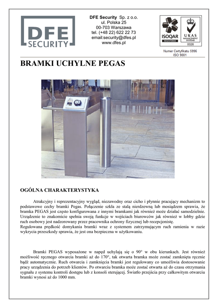 DFE Security Sp. z o.o. ul. Polska 25 00-703 Warszawa tel. (+48 22) 622 22 73 email:[email protected] www.dfes.pl BRAMKI UCHYLNE PEGAS OGÓLNA CHARAKTERYSTYKA Atrakcyjny i reprezentacyjny wygląd, niezawodny oraz cicho i płynnie pracujący mechanizm to podstawowe cechy bramki Pegas. Połączenie szkła ze stalą nierdzewną lub mosiądzem sprawia, że bramka PEGAS jest często konfigurowana z innymi bramkami jak również może działać samodzielnie. Urządzenie to znakomicie spełnia swoją funkcje w wejściach biurowców jak również w lobby gdzie ruch osobowy jest nadzorowany przez pracownika ochrony fizycznej lub recepcjonistę. Regulowana prędkość domykania bramki wraz z systemem zatrzymującym ruch ramienia w razie wykrycia przeszkody sprawia, że jest ona bezpieczna w użytkowaniu. Bramki PEGAS wyposażone w napęd uchylają się o 90° w obu kierunkach. Jest również możliwość ręcznego otwarcia bramki aż do 170°, tak otwarta bramka może zostać zamknięta ręcznie bądź automatycznie. Ruch otwarcia i zamknięcia bramki jest regulowany co umożliwia dostosowanie pracy urządzenia do potrzeb klientów. Po otwarciu bramka może zostać otwarta aż do czasu otrzymania sygnału z systemu kontroli dostępu lub z konsoli sterującej. Światło przejścia przy całkowitym otwarciu bramki wynosi aż do 1000 mm. DFE Security Sp. z o.o. ul. Polska 25 00-703 Warszawa tel. (+48 22) 622 22 73 email:[email protected] www.dfes.pl Montując dwie bramki tego typu naprzeciwko siebie można zwiększyć szerokość przejścia co pozwoli na tranzyt dużych przedmiotów lub ułatwi ewakuację. MATERIAŁY Centralny filar wykonany z AISI 304 polerowana stal nierdzewna. Skrzydło bramki wykonane z 8 mm hartowanego szkła lub z rur stalowych. DFE Security Sp. z o.o. ul. Polska 25 00-703 Warszawa tel. (+48 22) 622 22 73 email:[email protected] www.dfes.pl STEROWANIE: Bramki PEGAS są kontrolowane przez jednostkę logiczną z procesorem MLU 5: Jedno wejście dla otwarcia/zamknięcia w obu kierunkach, Jedno chronione wejście do odblokowania bramki w wypadku ewakuacji, Jedno wejście wielofunkcyjne, które może być wykorzystane w przyszłości, Jedno wyjście sygnalizując obecny stan urządzenia,(sygnał BUSY) Regulowany czas otwarcia po zadanym czasie bramka automatycznie zamyka się, Układ sterowania jest chroniony przed przepięciem, zwarciem i zamianą biegunów zasilania, PARAMETRY TECHNICZNE: ZASILANIE JEDNOSTKI: zasilanie 11 do 16 VDC, zużycie energii; czuwanie 0,1A, średnie 2A, w szczycie 3A, (może się wahać w zależności od modelu) temperatura pracy od 0 °C do +50 °C,( z modułem podgrzewania do -30°C) wilgotność maksymalnie do 80%, BRAK ZASILANIA: wolne przejście (fail safe) w przypadku braku zasilania bramka otworzy się automatycznie. DFE Security Sp. z o.o. ul. Polska 25 00-703 Warszawa tel. (+48 22) 622 22 73 email:[email protected] www.dfes.pl AKCESORIA: RĘCZNY PANEL STEROWANIA dale sterowanie bramką, zdalne zdjęcie blokady bramki, ALTERNATYWNE MATERIAŁY WYKOŃCZENIOWE: filar centralny : szczotkowana stal nierdzewna lub mosiądz, panel szklany : Planibel niebieski ESG, Planibel brązowy ESG, SKRZYDŁO BRAMKI: górna część skrzydła: stal nierdzewna, mosiądz. BATERIA PODTRZYMANIA: akumulator 12VDC/15Ah zapewnia pracę bramki przez 6 godzin ciągłej pracy, SYSTEMY IDENTYFIKACJI: łatwa integracja I instalacja czytników kart: zbliżeniowych, magnetycznych, smart card, biometrycznych, kodów paskowych, „monet”, itp. Bramki uchylne PEGAS występują w kilu wariantach : PEGAS GL/GLE - napęd elektryczny, szklane skrzydło, PEGAS HG - napęd elektryczny, skrzydło szklane do 1800 mm wysokości, PEGAS SF - napędy elektryczny, skrzydło ze stali nierdzewnej, PEGAS J - napęd elektryczny, skrzydło wykonane ze stali nierdzewnej, PEGAS GL-M 168 - napęd elektryczny, szklane skrzydło, reling ze stali nierdzewnej, Średnica słupka do wyboru 168 mm lub 204 mm Wymiary mogą być dostosowane do potrzeb klienta.